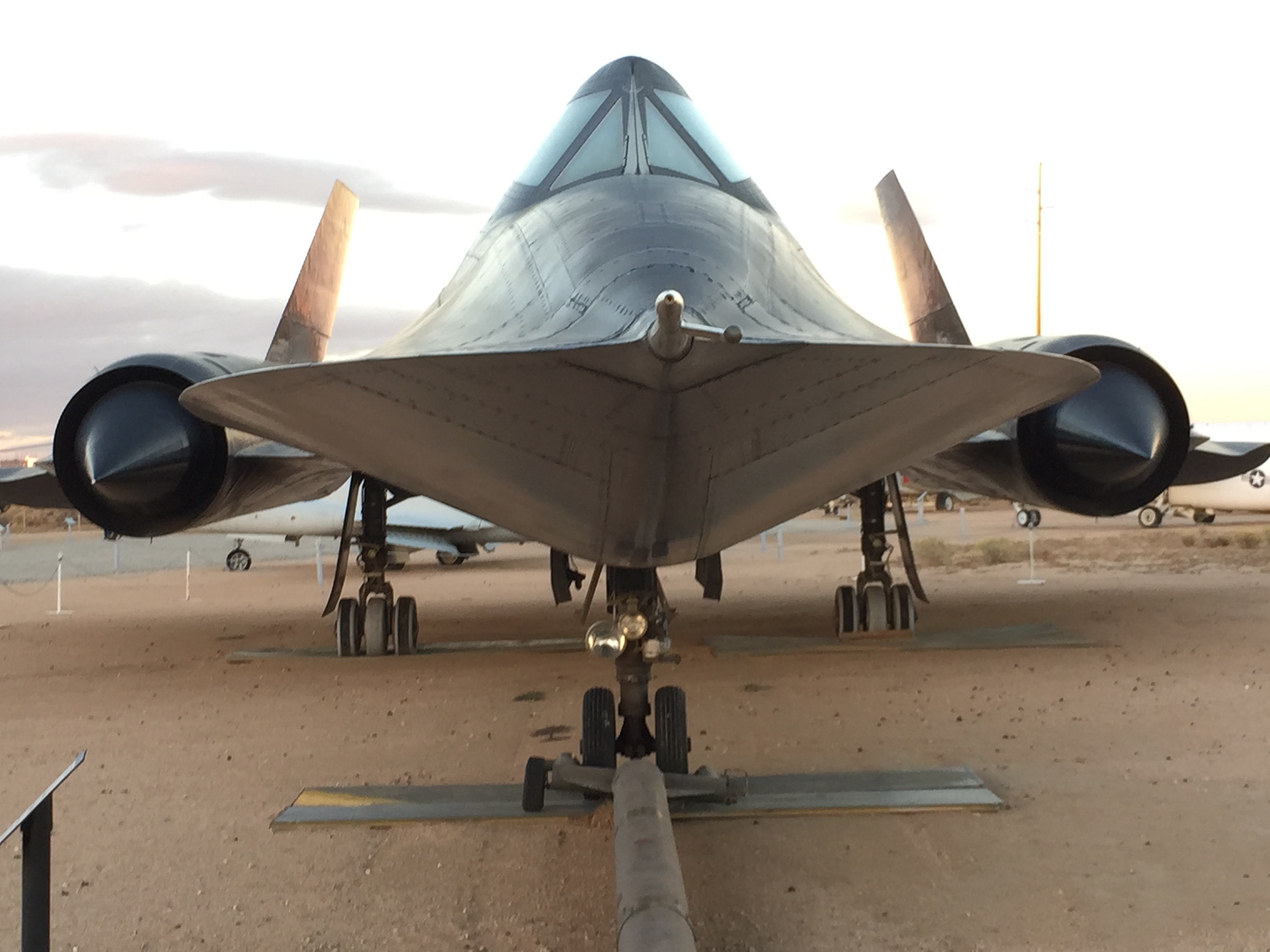 Outside of the Edwards Air Force Base Flight Test Museum, there are a couple dozen planes parked on display. This is an up close and personal look at the nose of an SR-71 Blackbird, the fastest and highest reconnaissance and research aircraft ever flown. The F-15 flew higher, and there are probably a couple others to do so, but the Blackbird was the only one put into production and used regularly for decades. The last I heard, NASA still had at least one that was still flying, but that may have changed by now. (Something to Google later.)