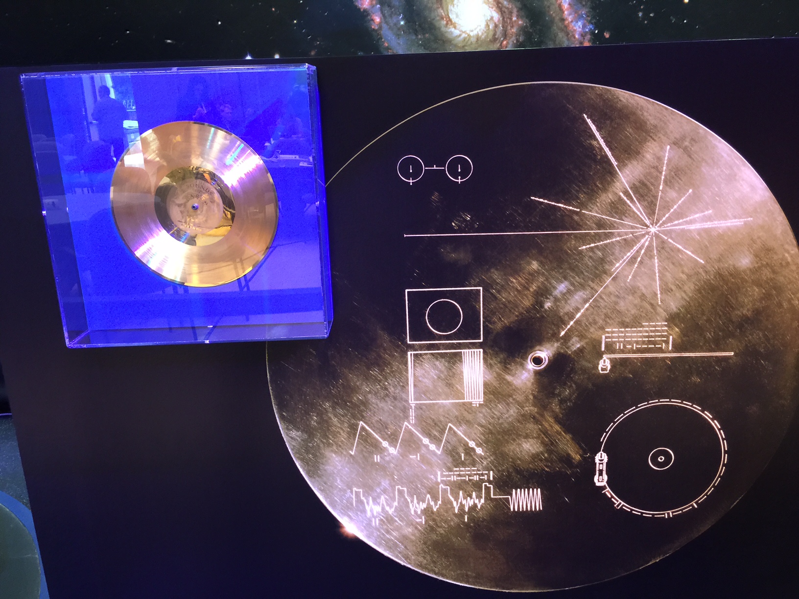 Von Karman Auditorium at JPL has a full-sized replica of the Voyager spacecraft, two of which are now our first starships, having passed out of the boundaries of the solar system and into interstellar space last year. Each of them carry a golden disk, with a diagram on one side that would (hopefully) tell any intelligent, space-faring species that finds it who we were and where Voyager came from. On the other side is engraved a phonograph record with hundreds of sounds from Earth. This is a duplicate of that disk.