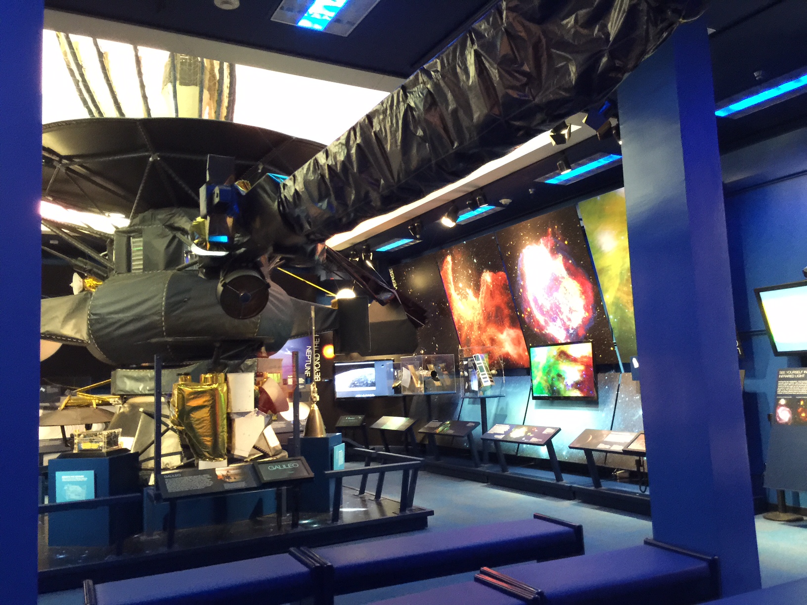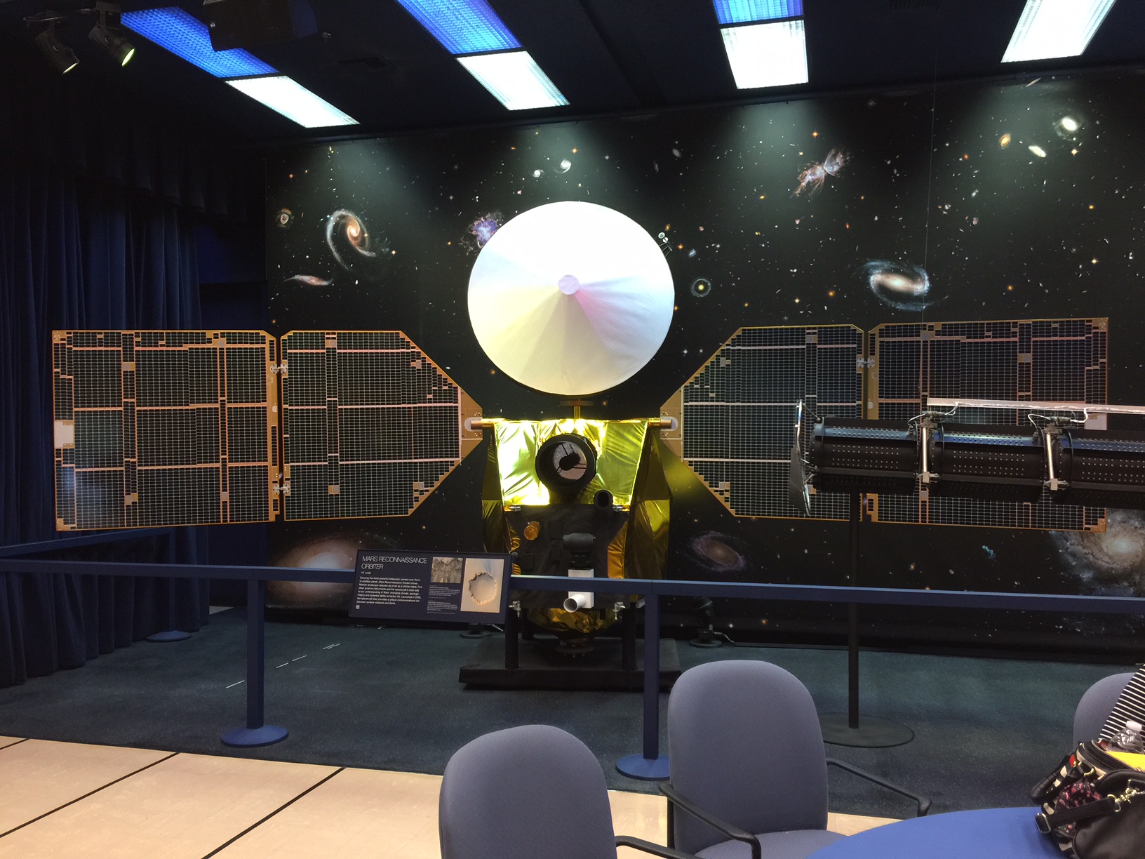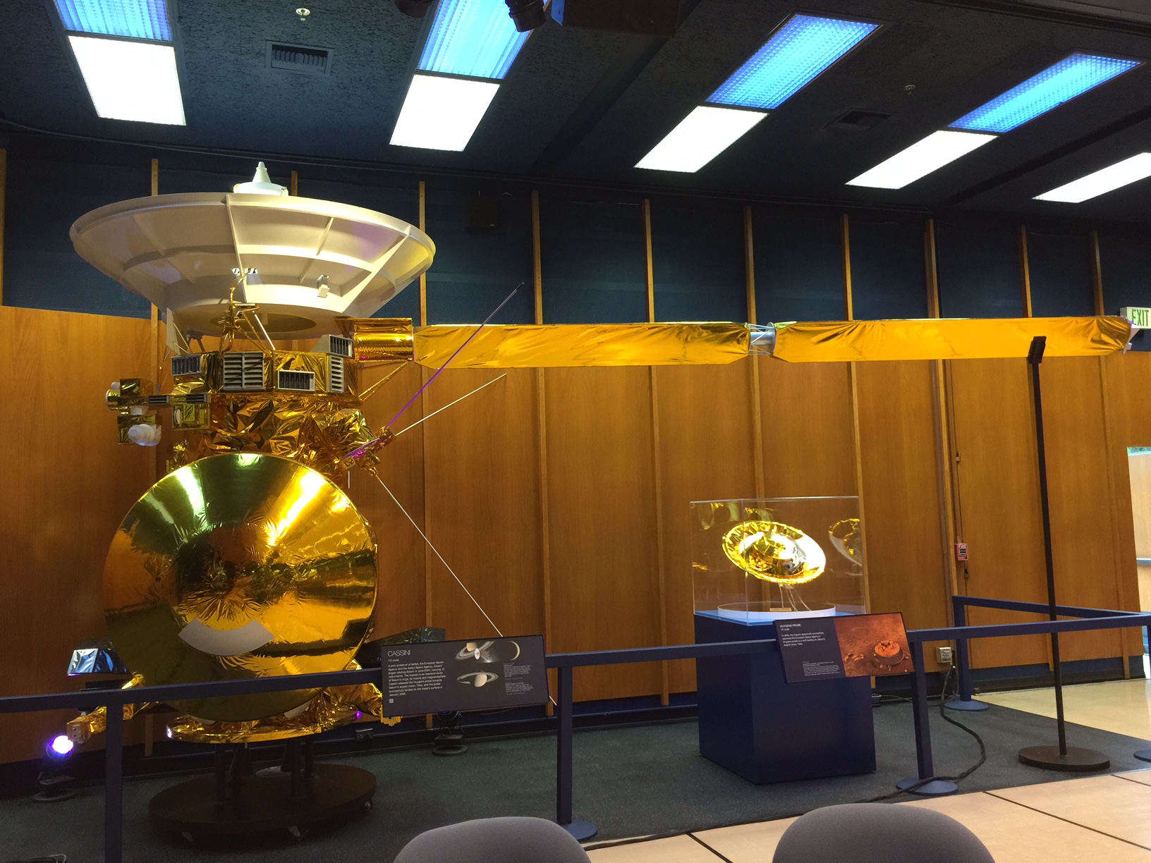 On the other side of the auditorium is a half-scale replica of the Cassini spacecraft and the Huygens lander. Cassini is now in its tenth year successfully orbiting Saturn, while the Huygens lander successfully landed on Titan, Saturn’s largest moon, in 2005.