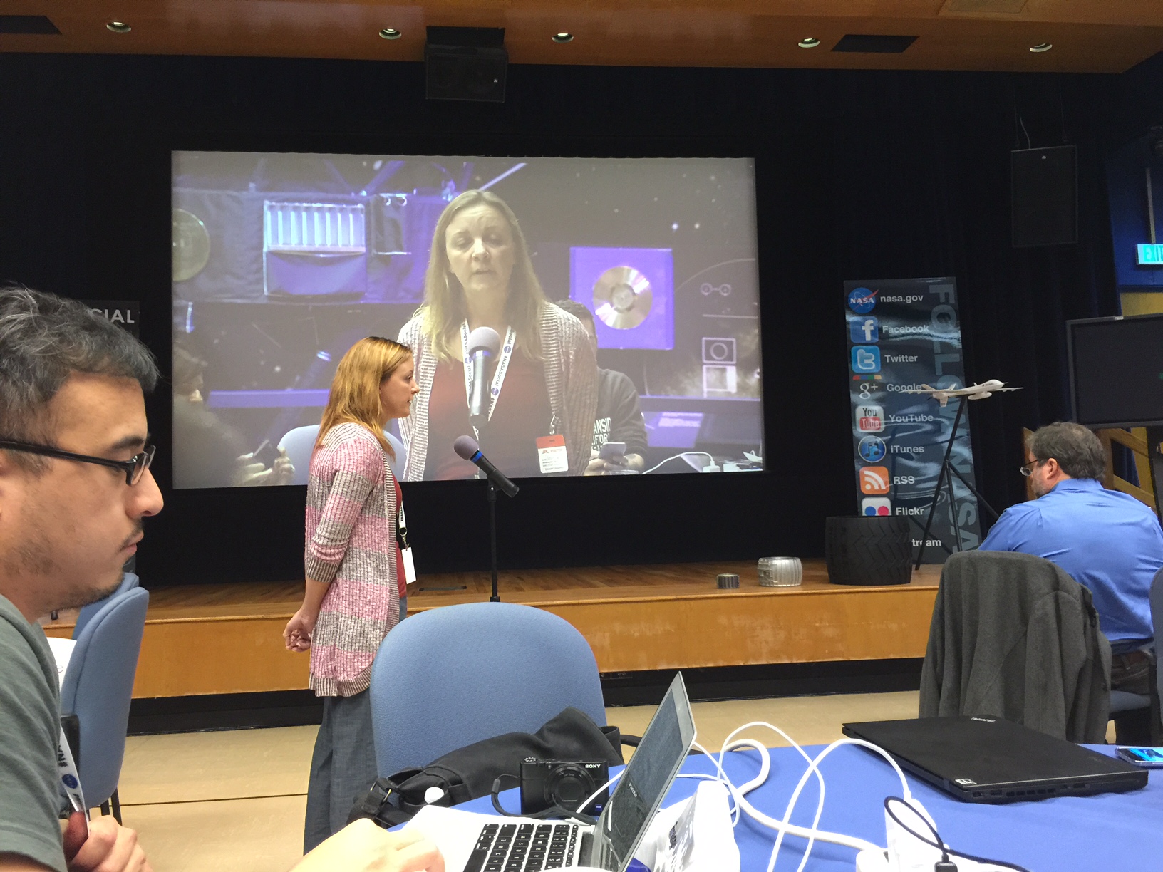The morning was centered around the two-hour NASA-TV special about the nine simultaneous NASA Socials. I was here, the stage and the microphone for our segments of the show were to the left of this view, and the big, scary television camera is right there!