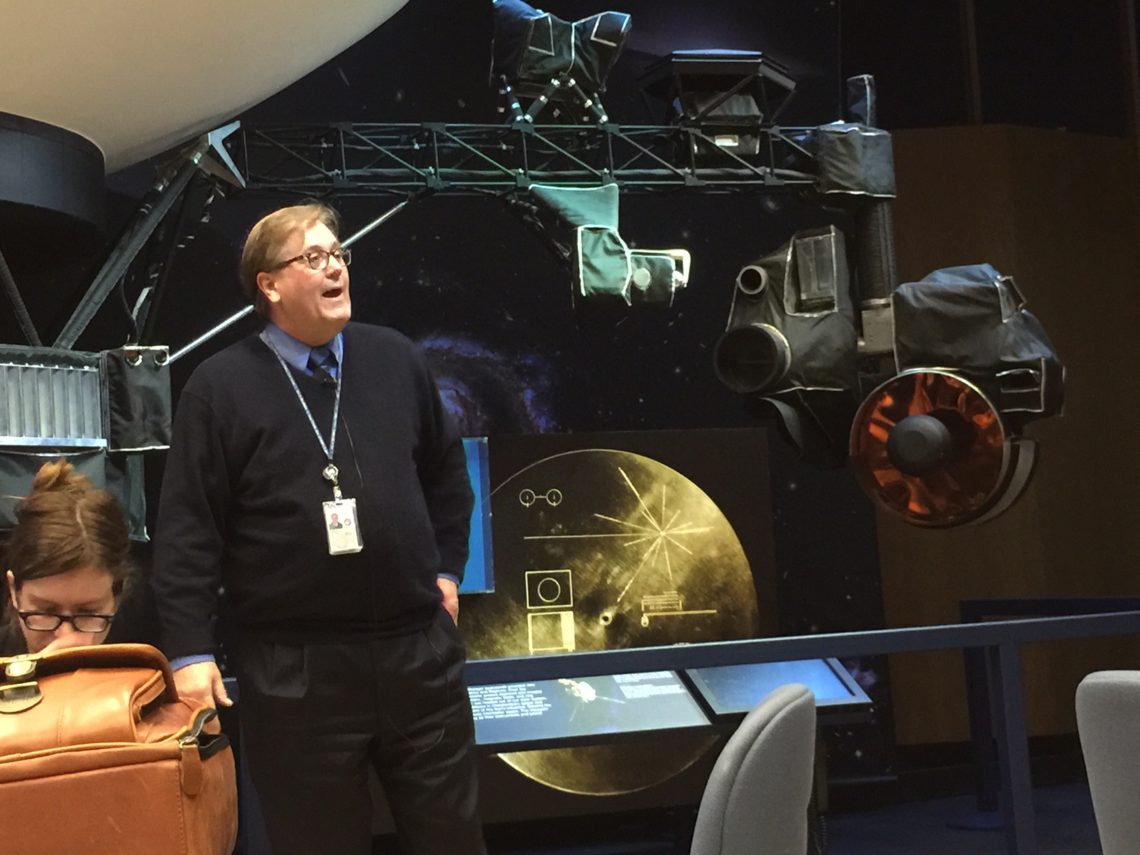 Next was Garry Burdick, talking about the role JPL has played in tomorrow’s Orion launch. (That’s the aforementioned full-sized Voyager model in back of him.)