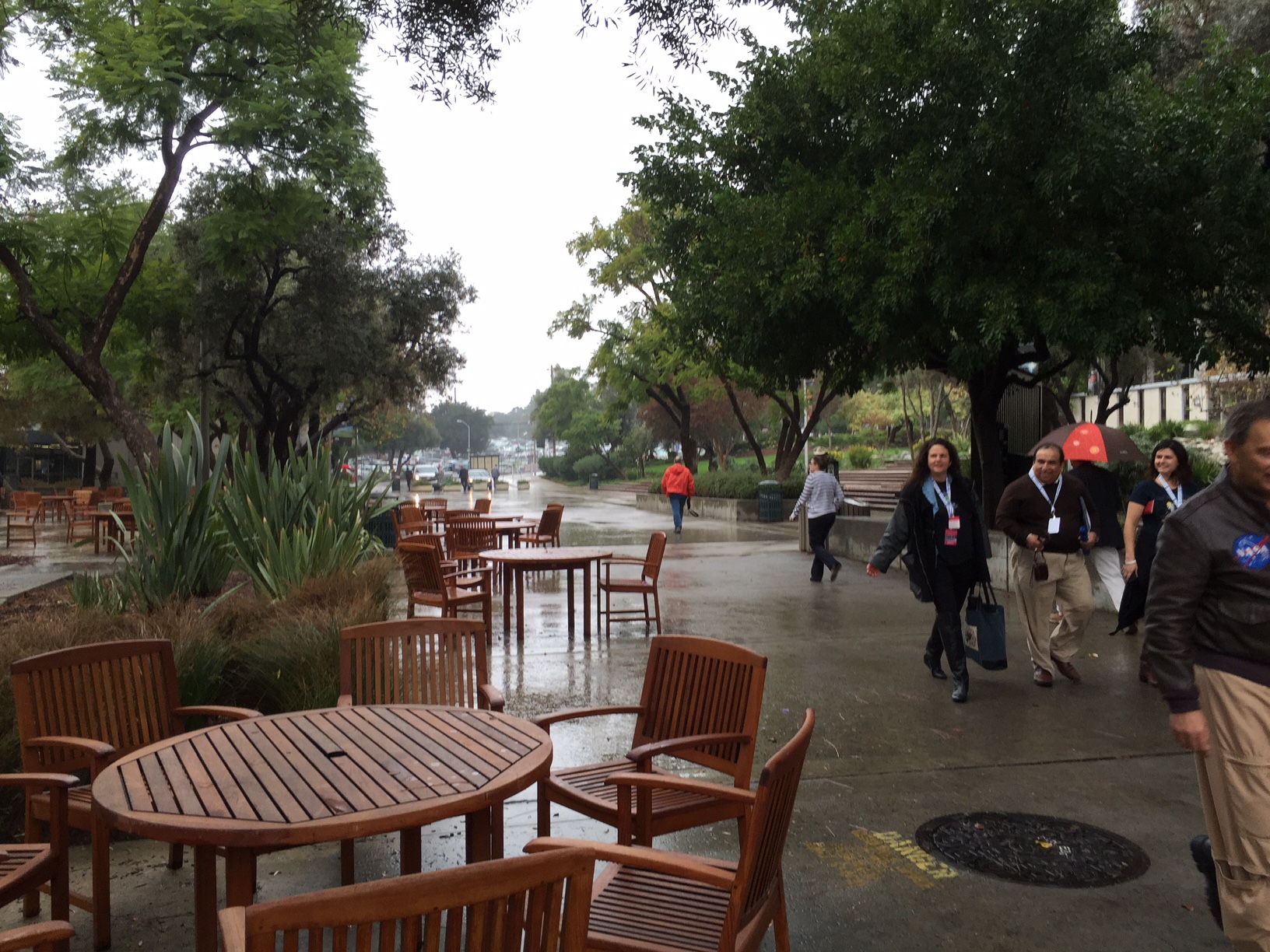 Then we started hiking around the (large!) JPL campus. Of course, after all of those months and years of drought, it was raining pretty good. (It’s okay, we need the rain. I’m drip-dry.)
