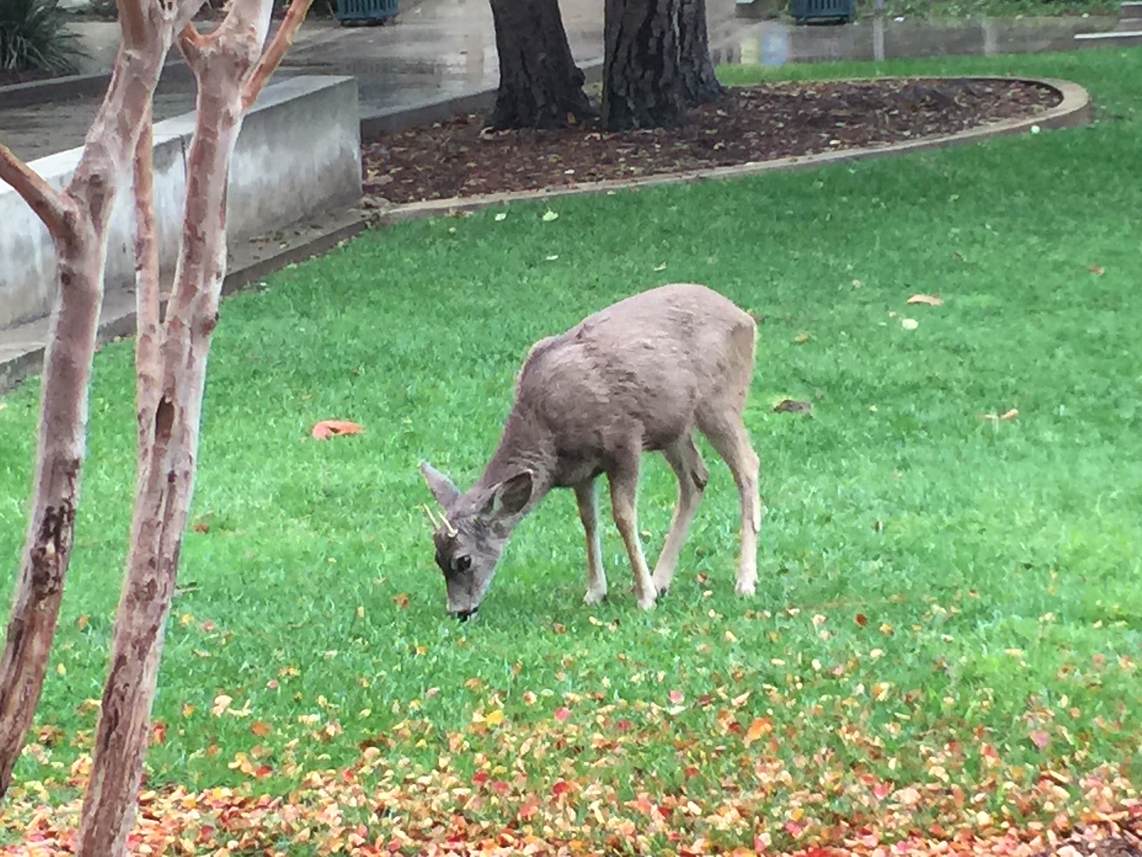 For those who doubt that there are deer on the JPL campus and in the hills around Los Angeles, here’s a ram lamb that was calmly grazing on the lawn in the rain. I saw a huge buck and two doe blocking a lane of traffic on the way in, also in broad daylight, and none of them seemed too bothered by us being ten feet away.