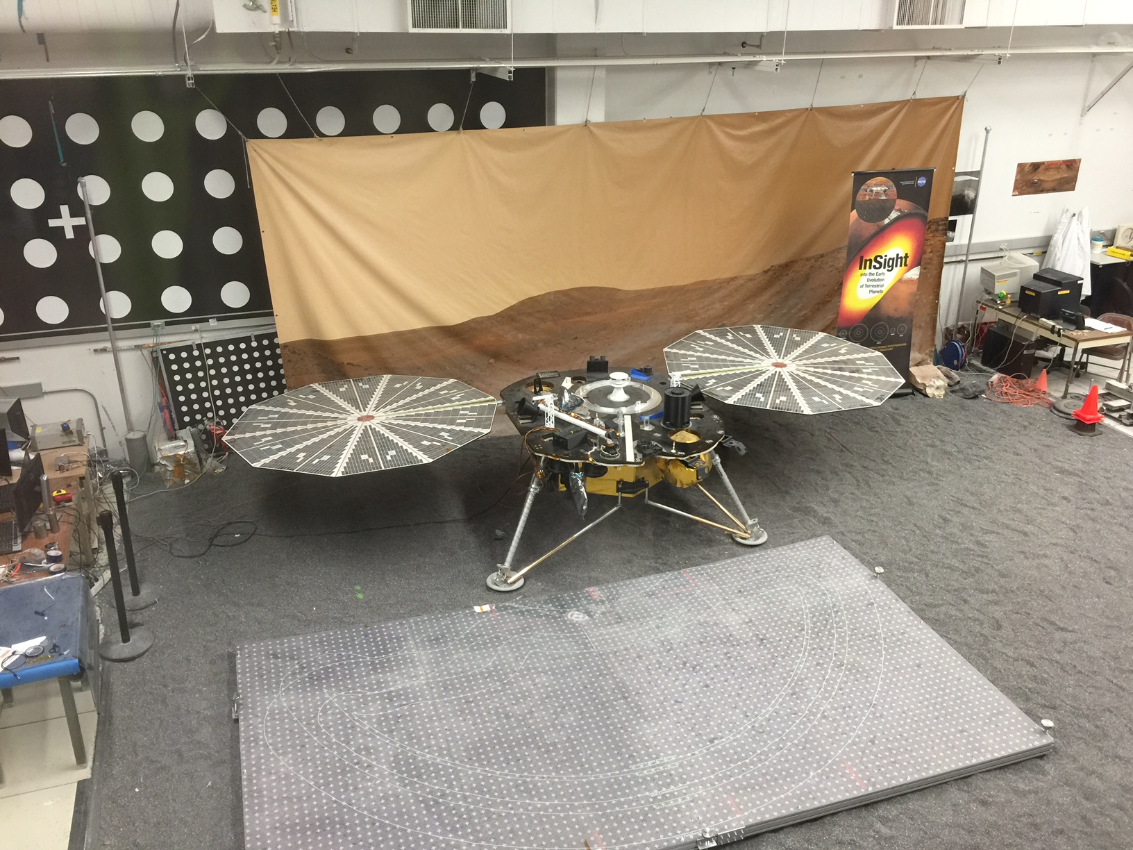 Out of the rain in the indoor “Mars Yard” we see this test version of the next Mars Lander, “InSight.” It will launch in March, 2016 and be very similar to the Phoenix spacecraft that landed near Mars’ north pole in May, 2008. InSight is a lander, not a rover, and will look for tectonic activity and “Mars-quakes.”