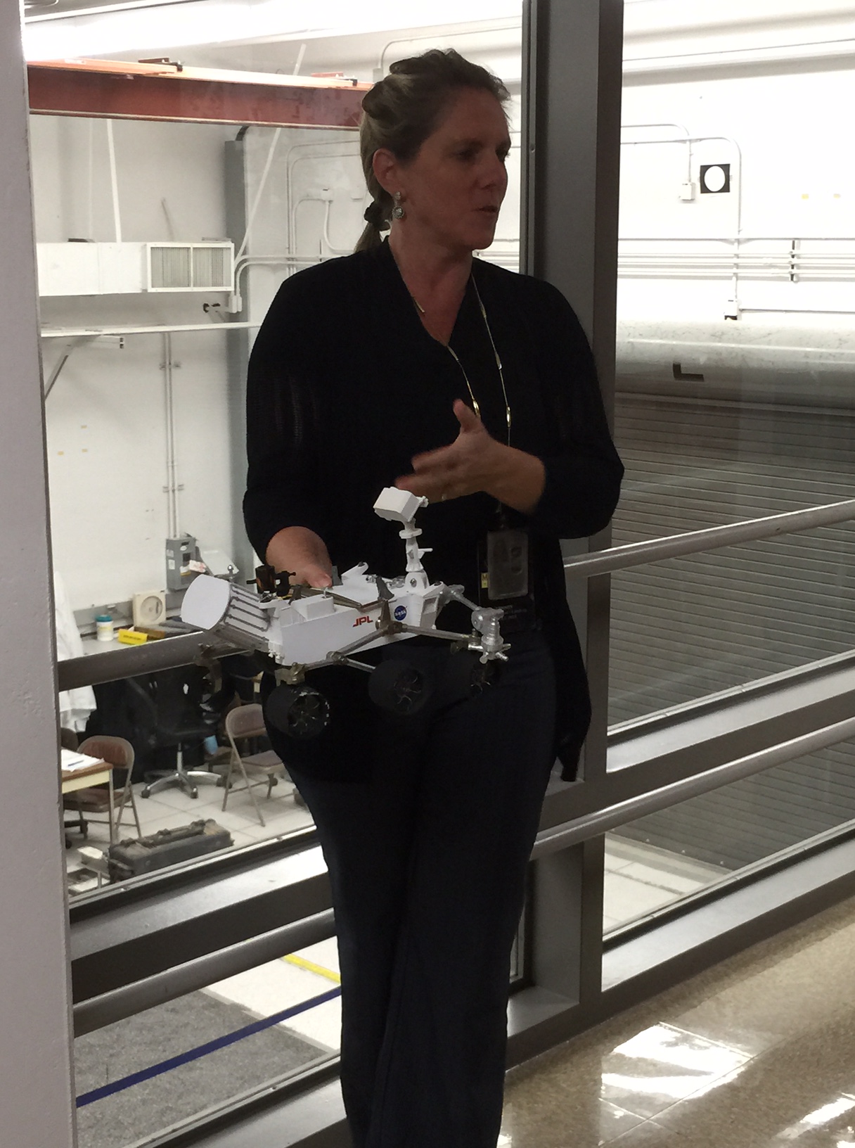 Jennifer Trosper (another Mars rover superstar) was our guide at the indoor Mars Yard. (The much bigger outdoor Mars Yard, where we were supposed to see a couple of the Curiosity replicas trundling about, was under several inches of water. If only the Mars Yard that’s ON MARS could be so lucky!) Dr. Trosper told us stories of the Spirit rover and how it had a tough life, being the trailblazer for Opportunity which landed a few weeks later (and is now in the 3,784th day of it’s 90-day mission).