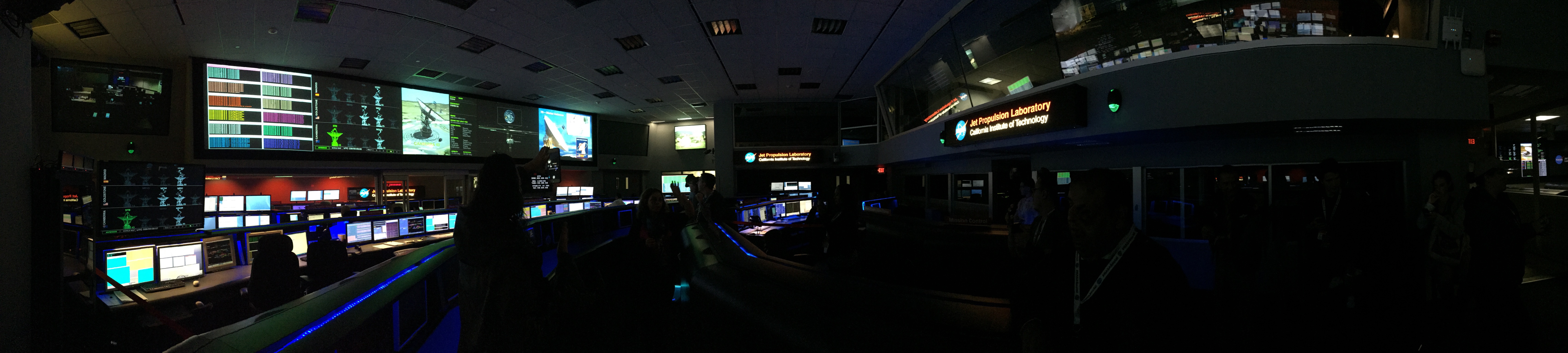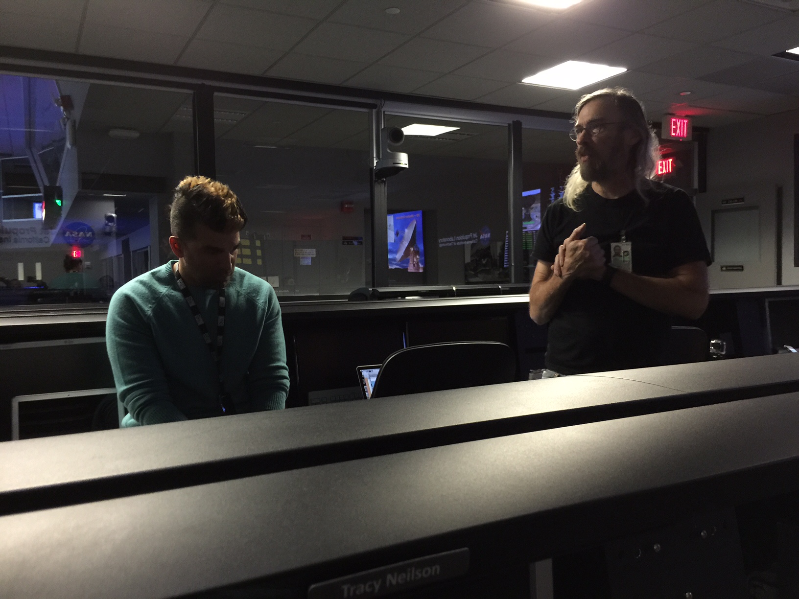 Next stop was the heart of JPL’s robot spaceship operations, the Mission Control Center. This room and these two guys might be familiar – Bobak Ferdowsi and Steve Collins were two of the lead flight controllers for the Curiosity landing (“Seven Minutes Of Terror“) and this is the room that you see them working in for that legendary bit of space history. (Things go crazy at the 8:15 mark.) Talk about getting to meet two more JPL superstars! (And both are two of the nicest guys in the world.)
