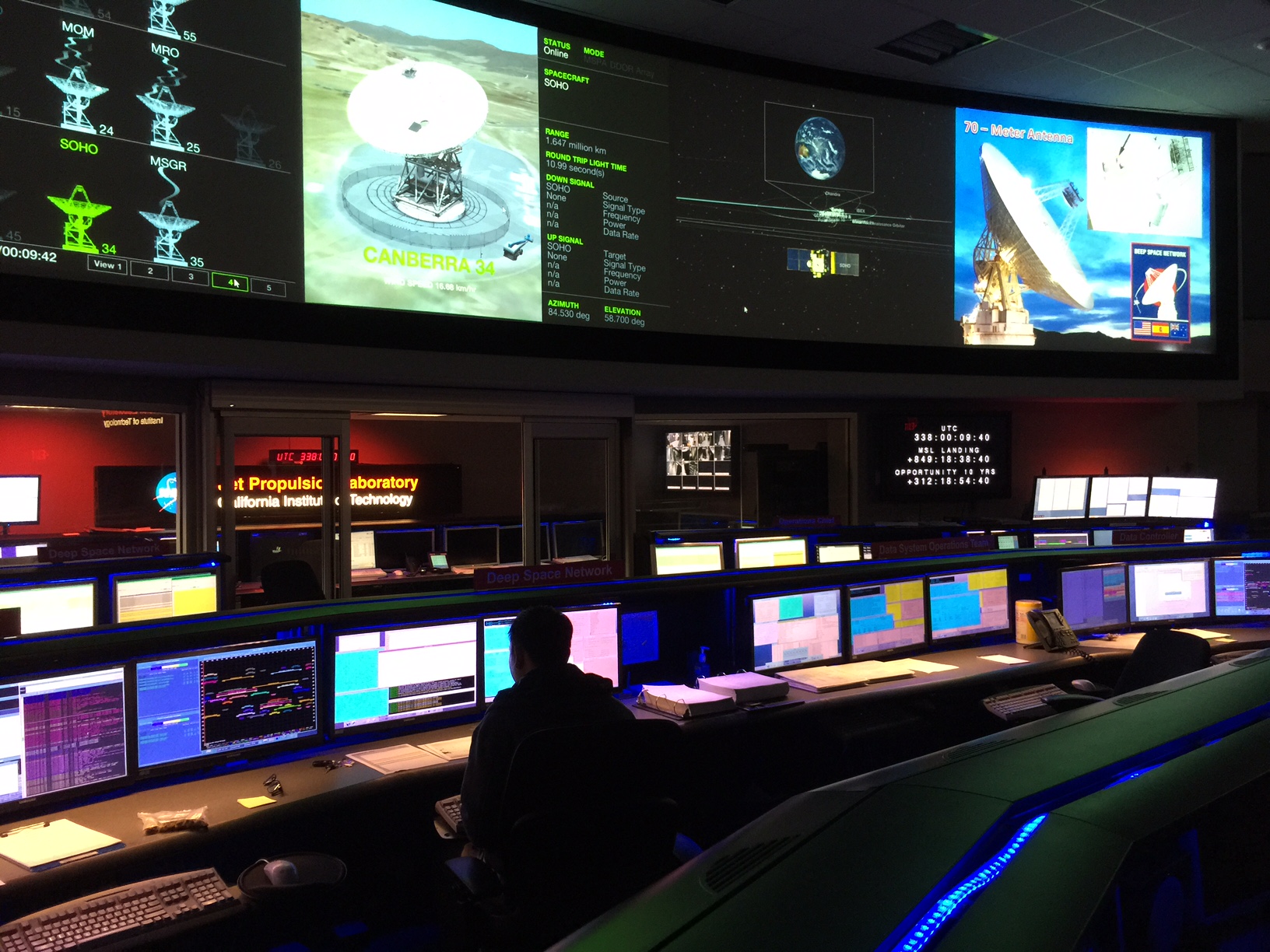 At the board in the upper left you can see which antennae are talking to which spacecraft right at the moment, along with tracking data for other dishes in NASA’s Deep Space Network. (I got to visit one of the three stations, Goldstone, with my son a couple years back.) The board in the center right, black with white lettering, is keeping track of the current Mission Elapsed Time (MET) for all of the currently active spacecraft on and orbiting Mars.