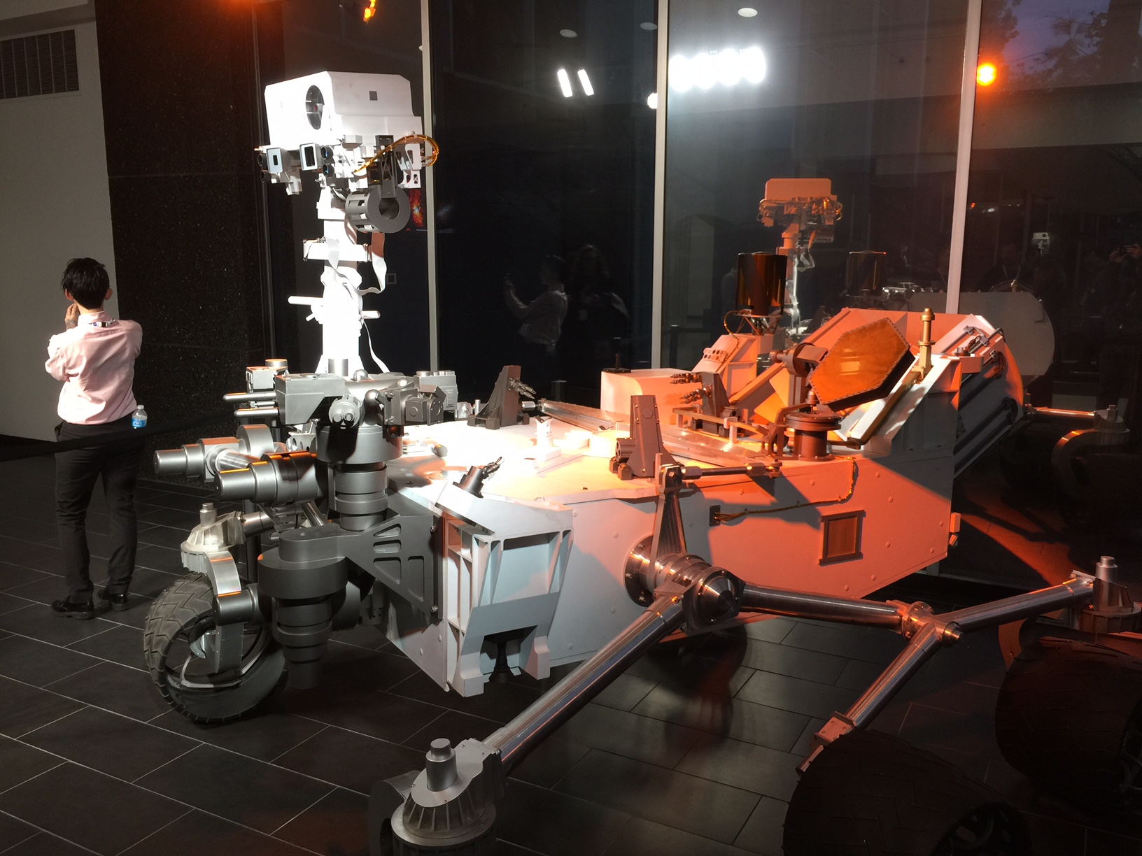 Finally, as we were heading out (quickly, since some JPL choral group had booked the auditorium for practice tonight), we saw the full-sized replica of Curiosity. The lady in the pink shirt, for scale, is about my size, maybe 5’6″ or 5’7″. That’s a honkin’ big rover!