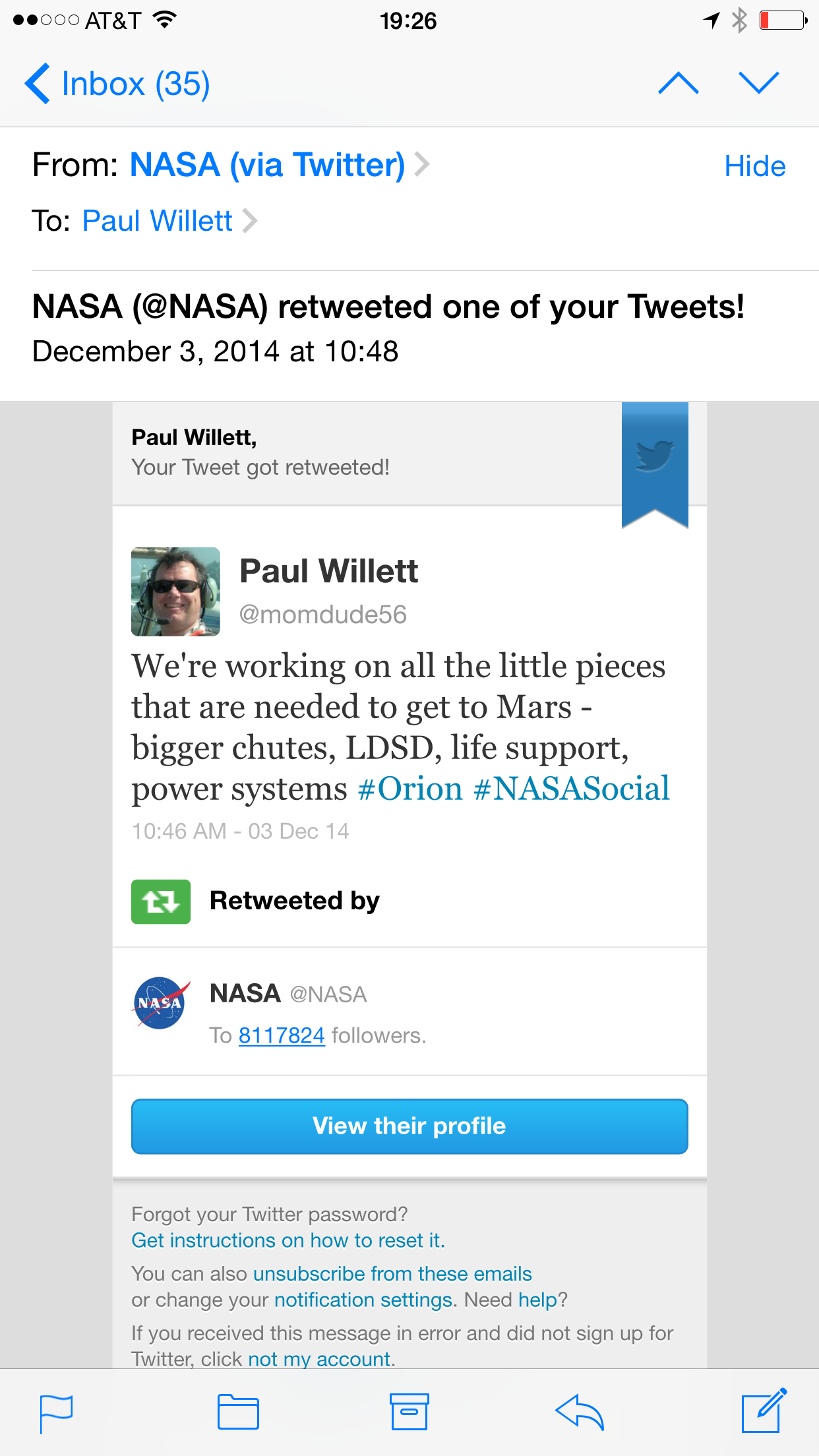 Somewhere in the middle of the NASA-TV show, one of my tweets got retweeted by @NASA. Not one of the smaller NASA divisions or sites or projects. THE @NASA. The one with 8,117,824 followers.