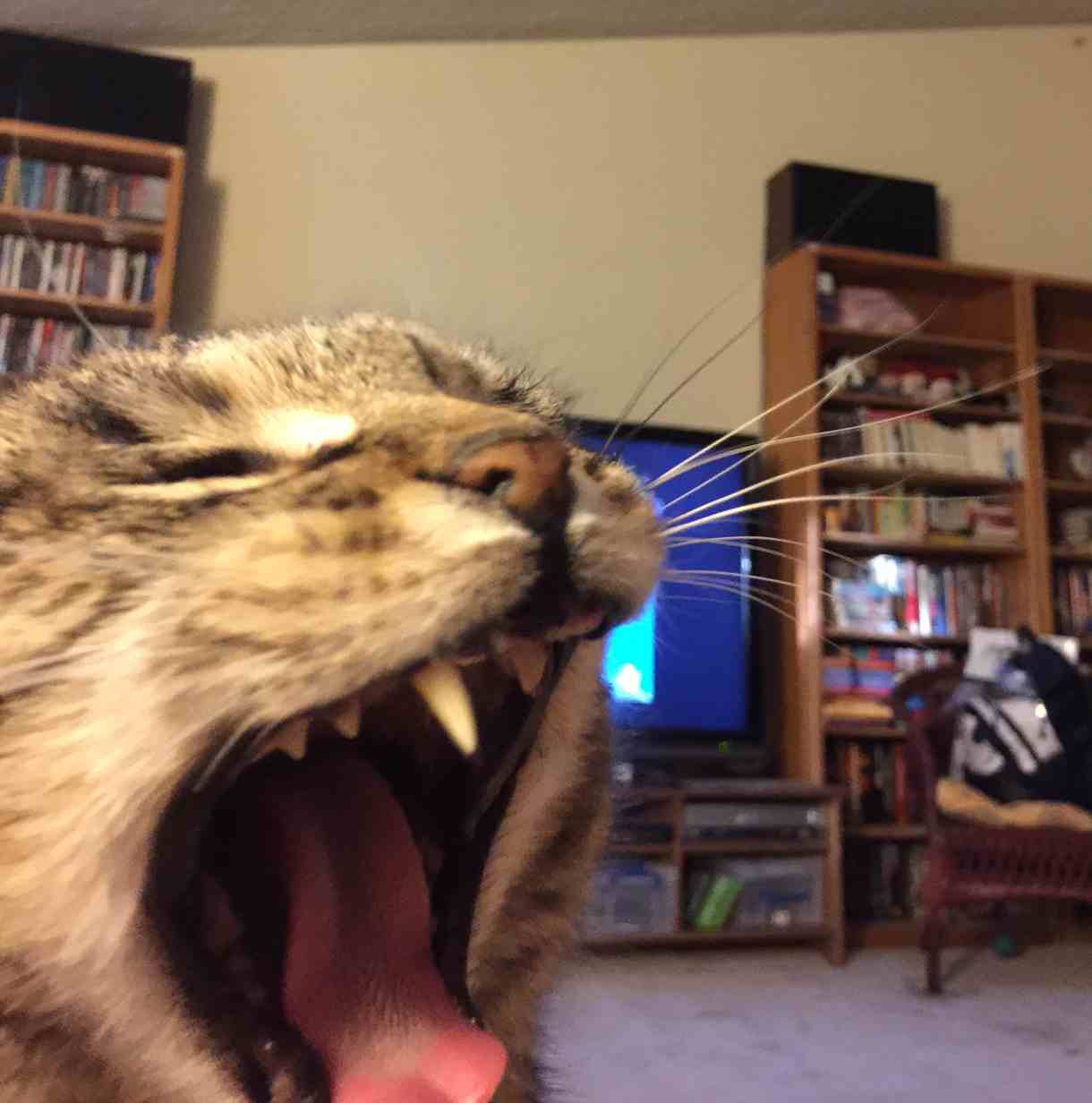 All cats look funny when they yawn, makes you want to stick something in there just to freak them out. (Do not use anything you do not want mangled, like your finger!)