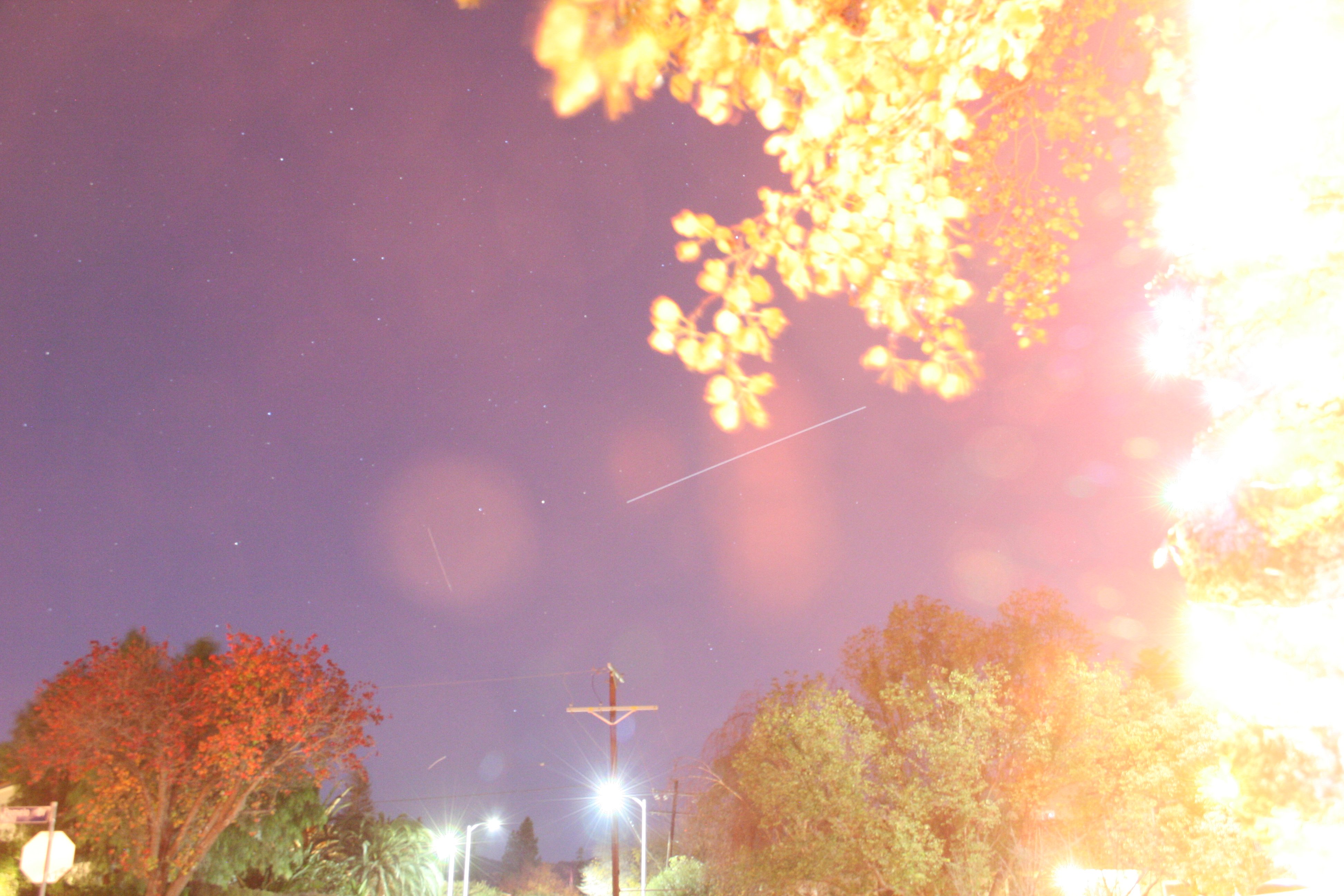 But even better, there was another satellite passing from the upper right (due south) to the lower left (due north)! That’s a polar orbit. This satellite was also clearly visible to the naked eye.