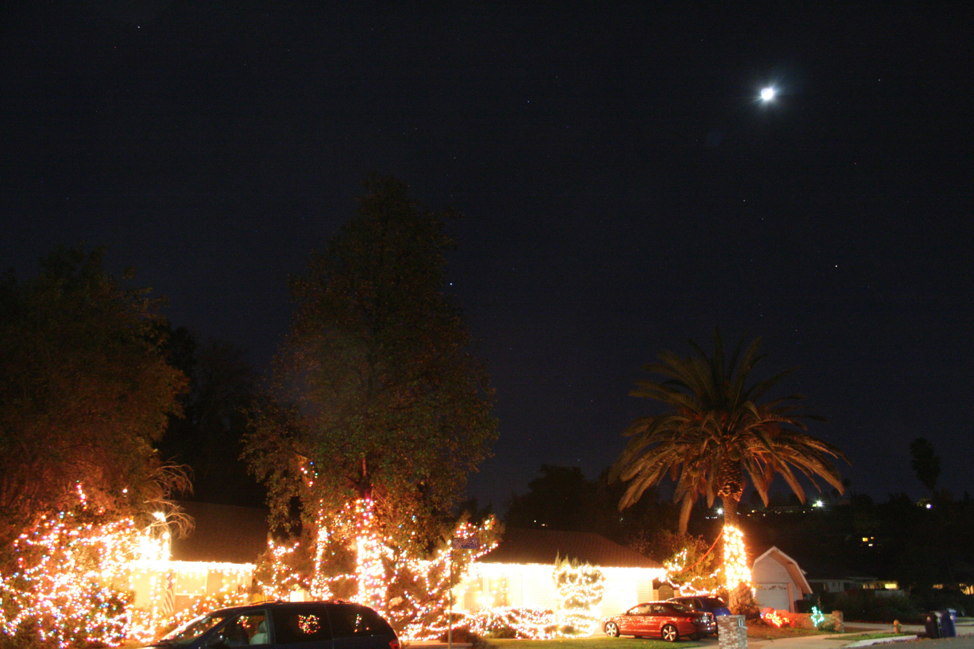 Going out to take pictures, it is not lost on me that given a bit of checking and planning on the timing, there might be other objects to get into the picture with the lights on the house.