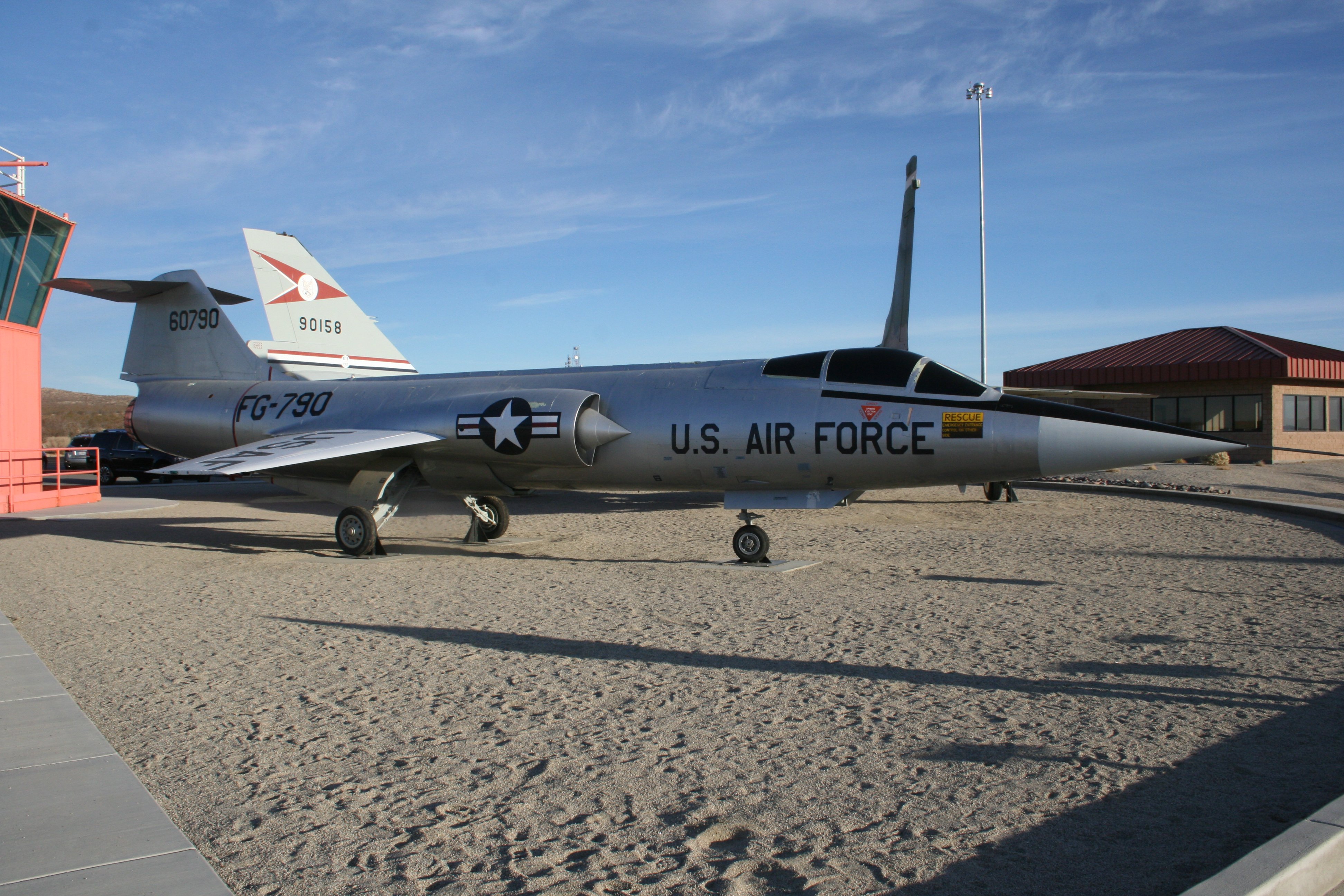 At the gates of Edwards Air Force Base there are a dozen or more retired planes parked, many of them “century” fighters (F-101 “Voodoo”, F-104 “Starfighter”, F-105, F-106, F-108, and so on), as well as other fighters and cargo aircraft. Shown is the F-104 “Starfighter”.