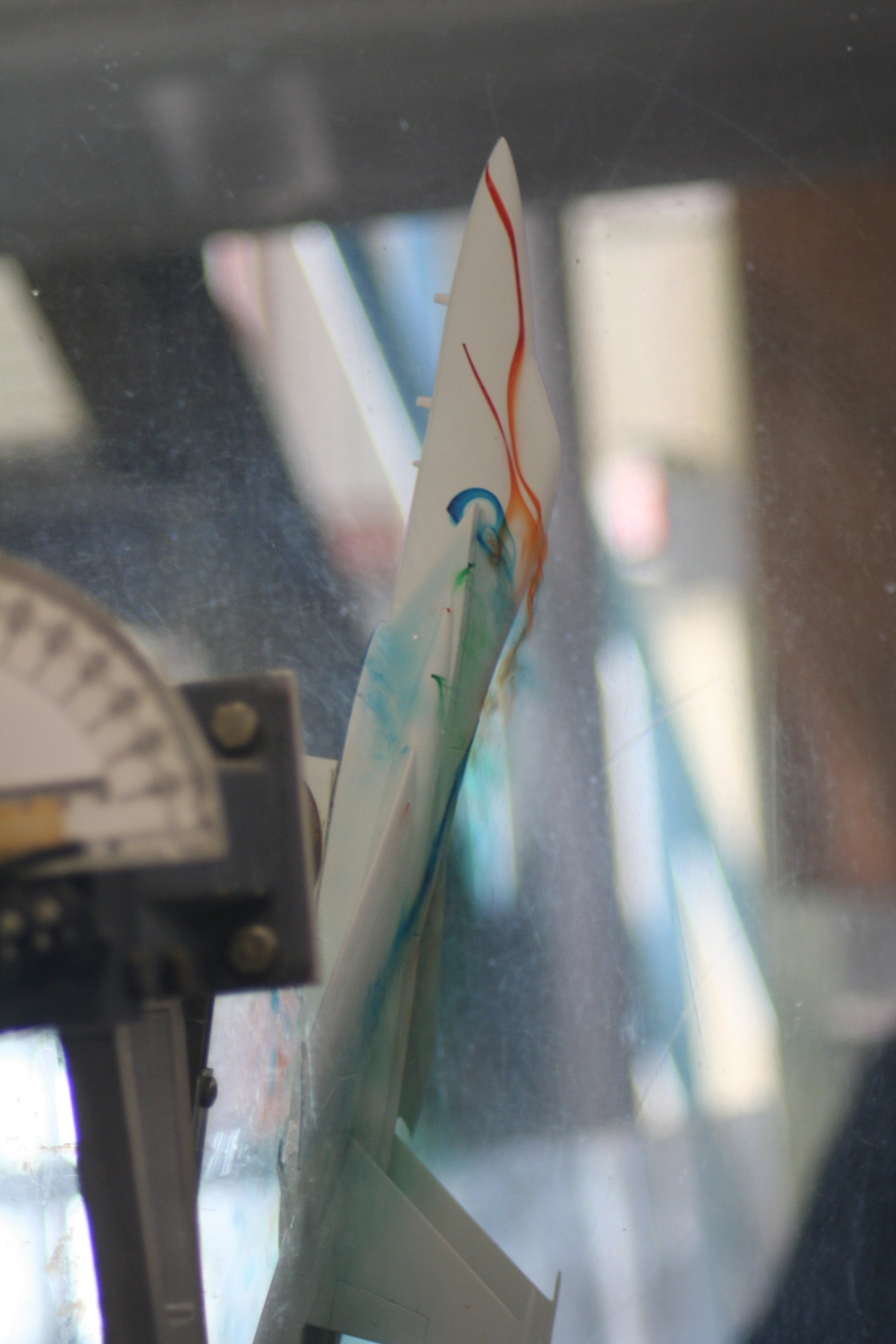 In the Flow Dynamics Lab we saw how models are tested in a stream of water. In this case the model has different colored dyes coming out of pinholes at certain places, with a steady, laminar flow of water being pumped past it from the top of this clear column. As the model is tilted (there’s a gauge in the background to show the angle) you can see how the flows are disrupted, forming eddies and swirls in the wake. Critical to know before you go testing something at Mach 2 or so with a pilot aboard.