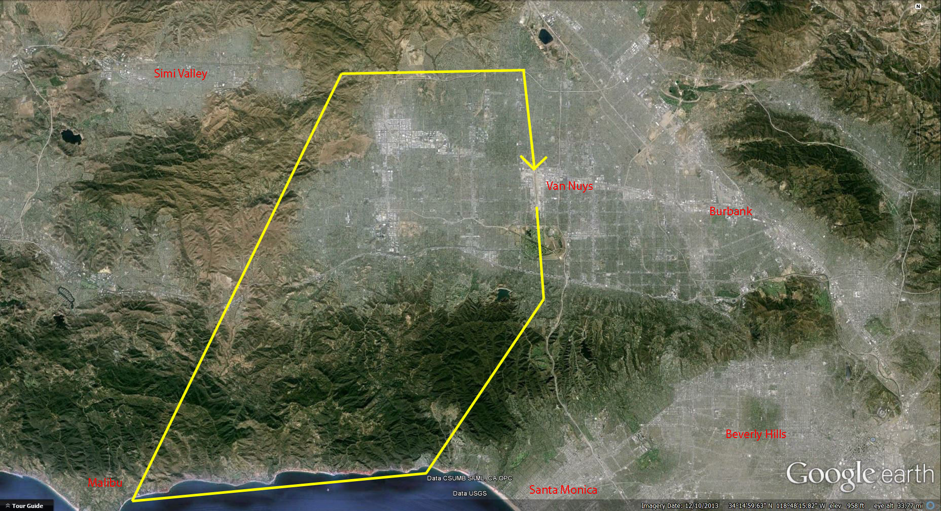 When planes based out of VNY are selling rides, they often (but not always) end up over our house at the west end of the San Fernando Valley. If they’re selling 30-minute rides as is common, out of VNY a typical route is a straight-out departure on Runway 16R, a right turn over the Santa Monica Mountains toward Malibu, a turn to the north over the Santa Suzanna Mountains, then back east along the 118 Freeway and the north edge of the Valley to VNY. The northbound leg from Malibu to Santa Suzanna Pass takes them pretty much right over us.