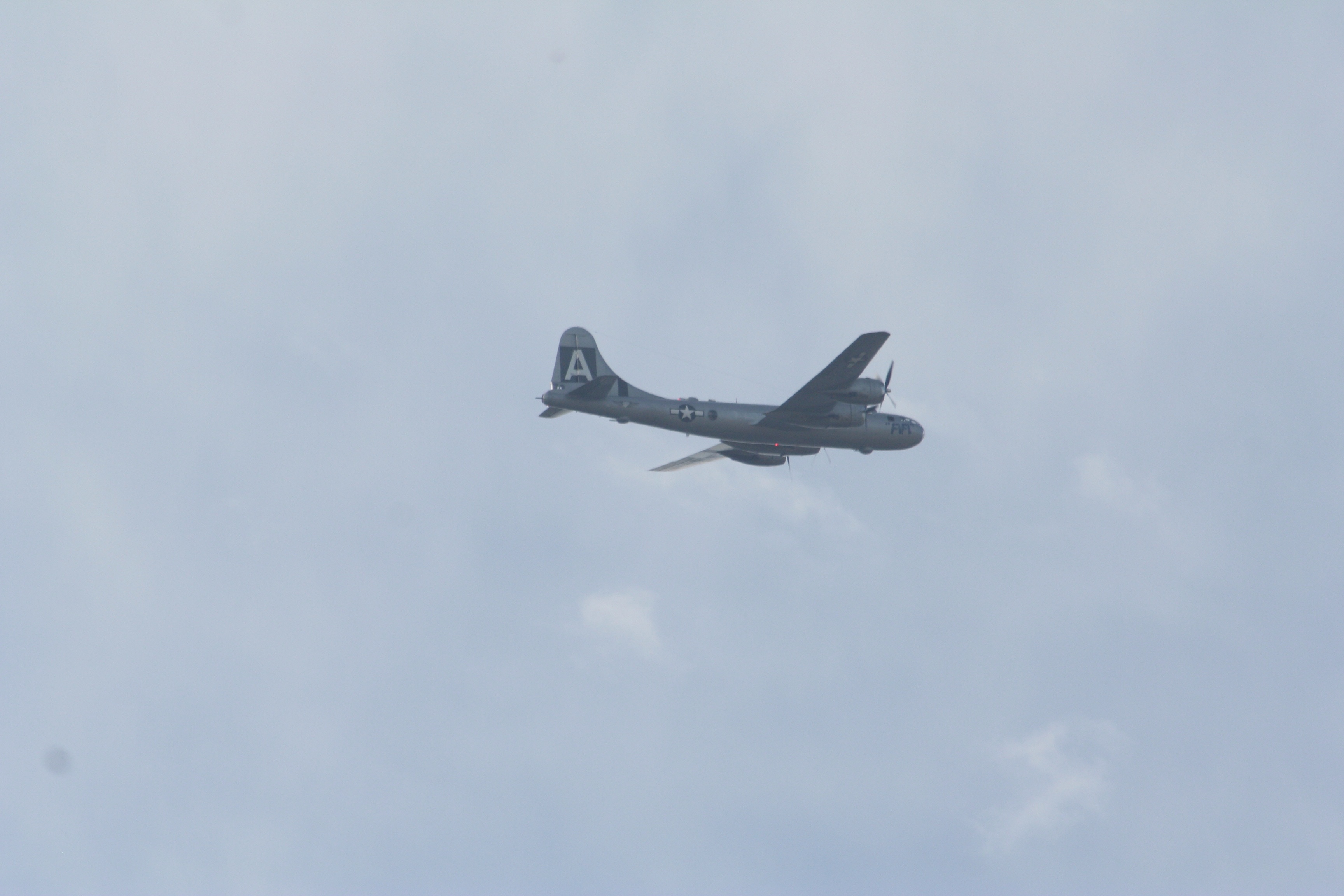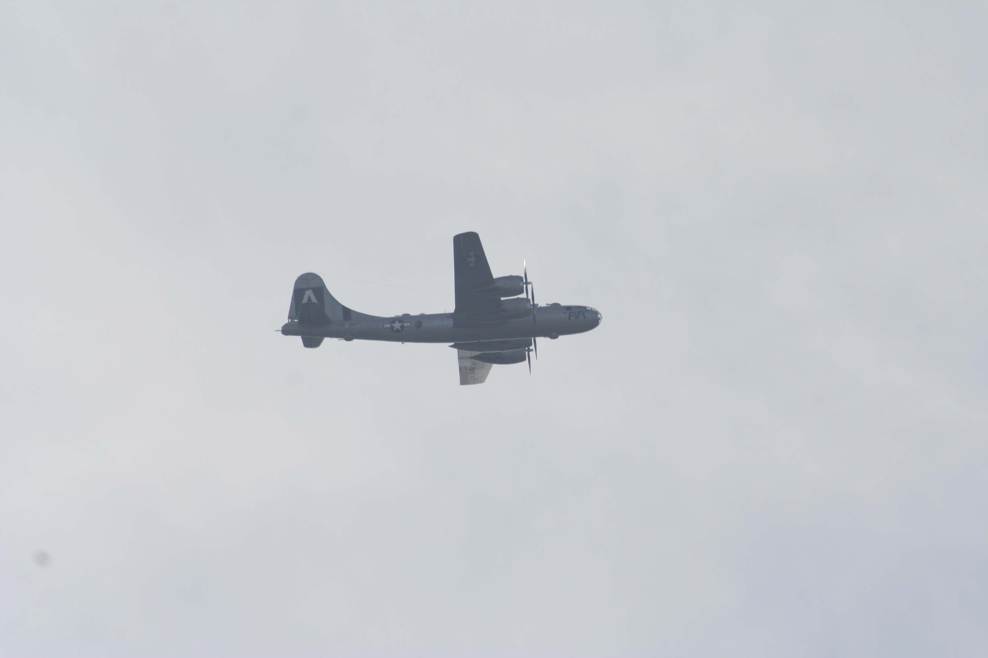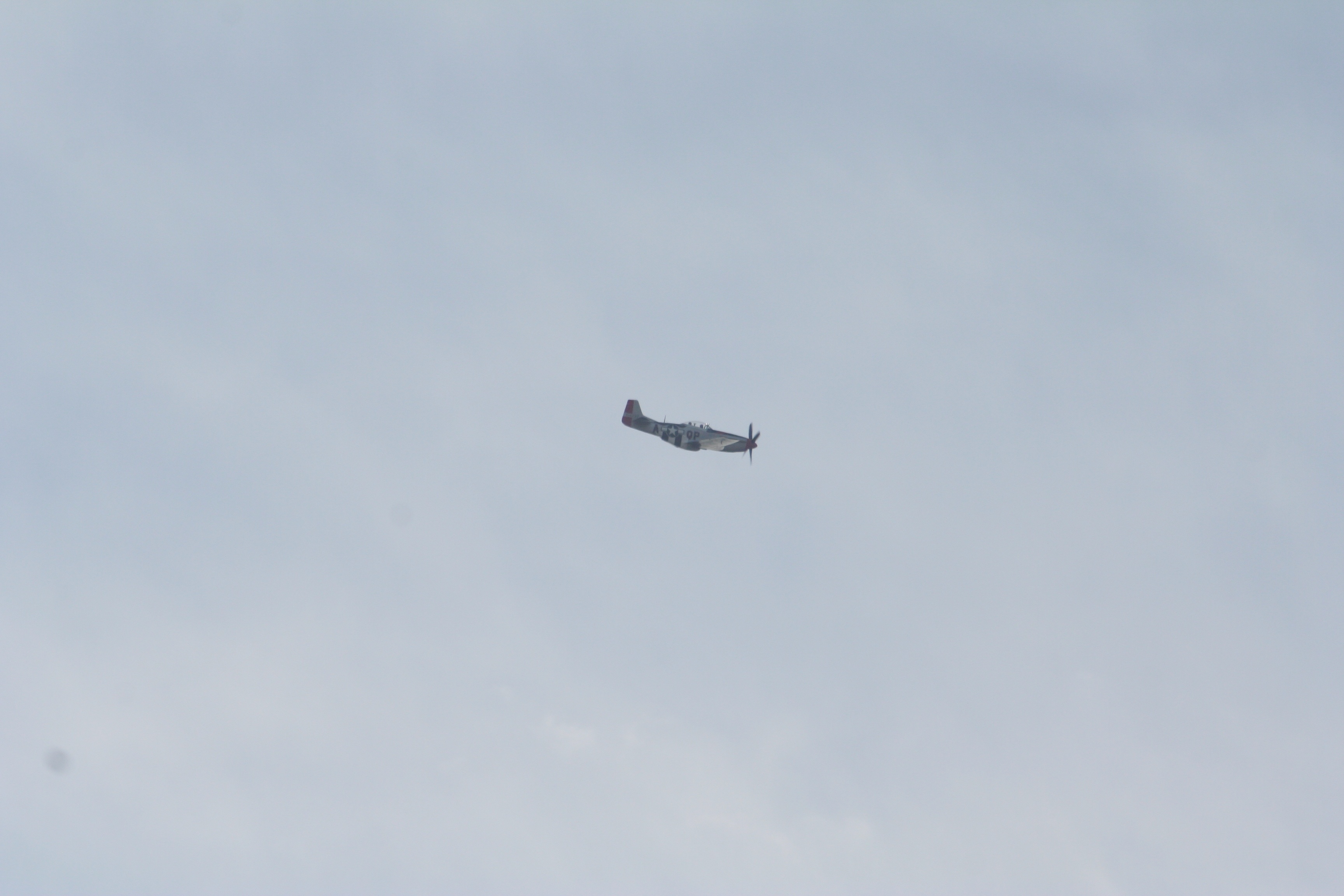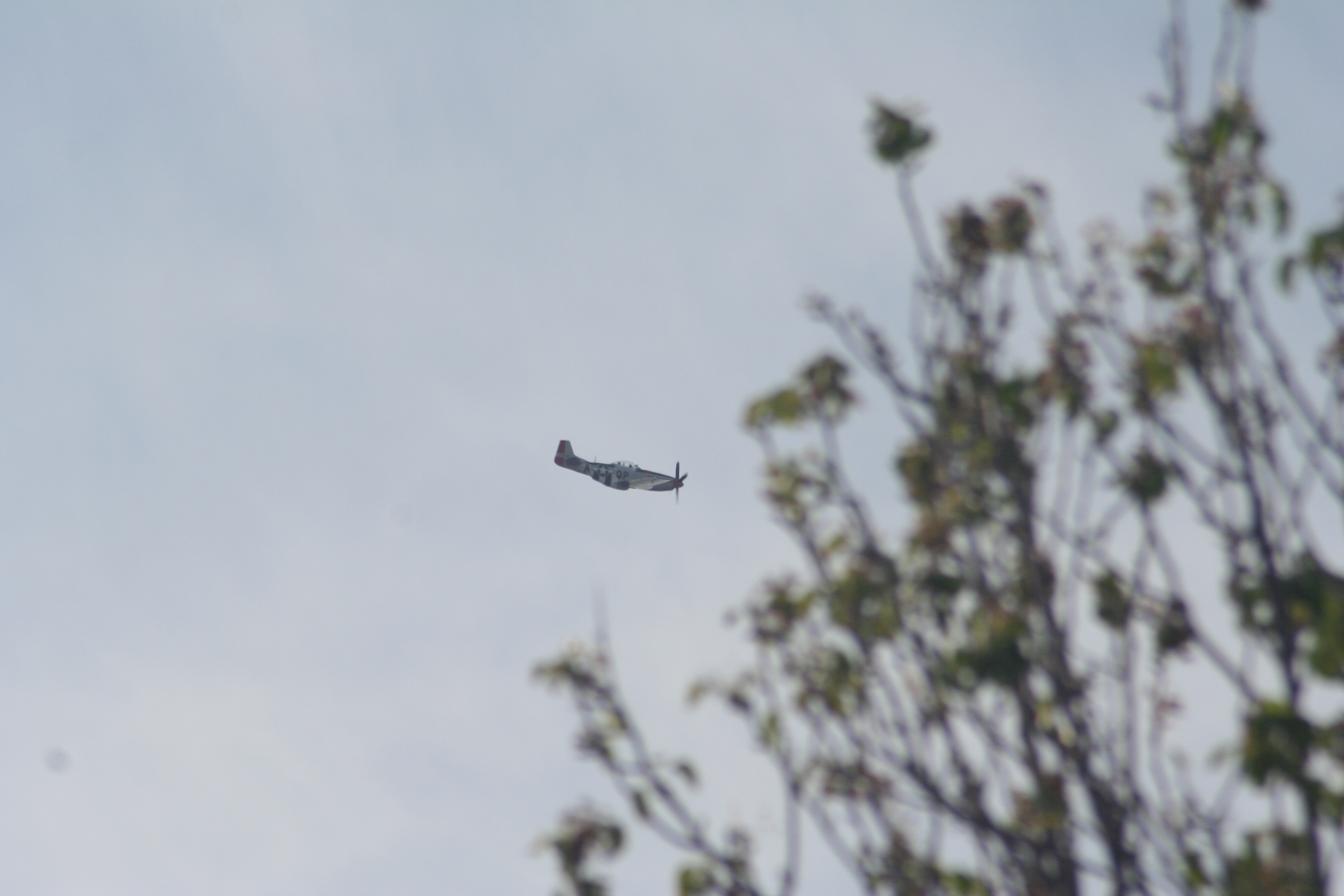 Hot on “Fifi’s” tail and closing fast was “Man Of War,” our P-51. Where “Fifi” was lumbering along in a stately manner, MOW was ripping along at a good clip and disappearing behind the trees across the street, as all good P-51’s do!