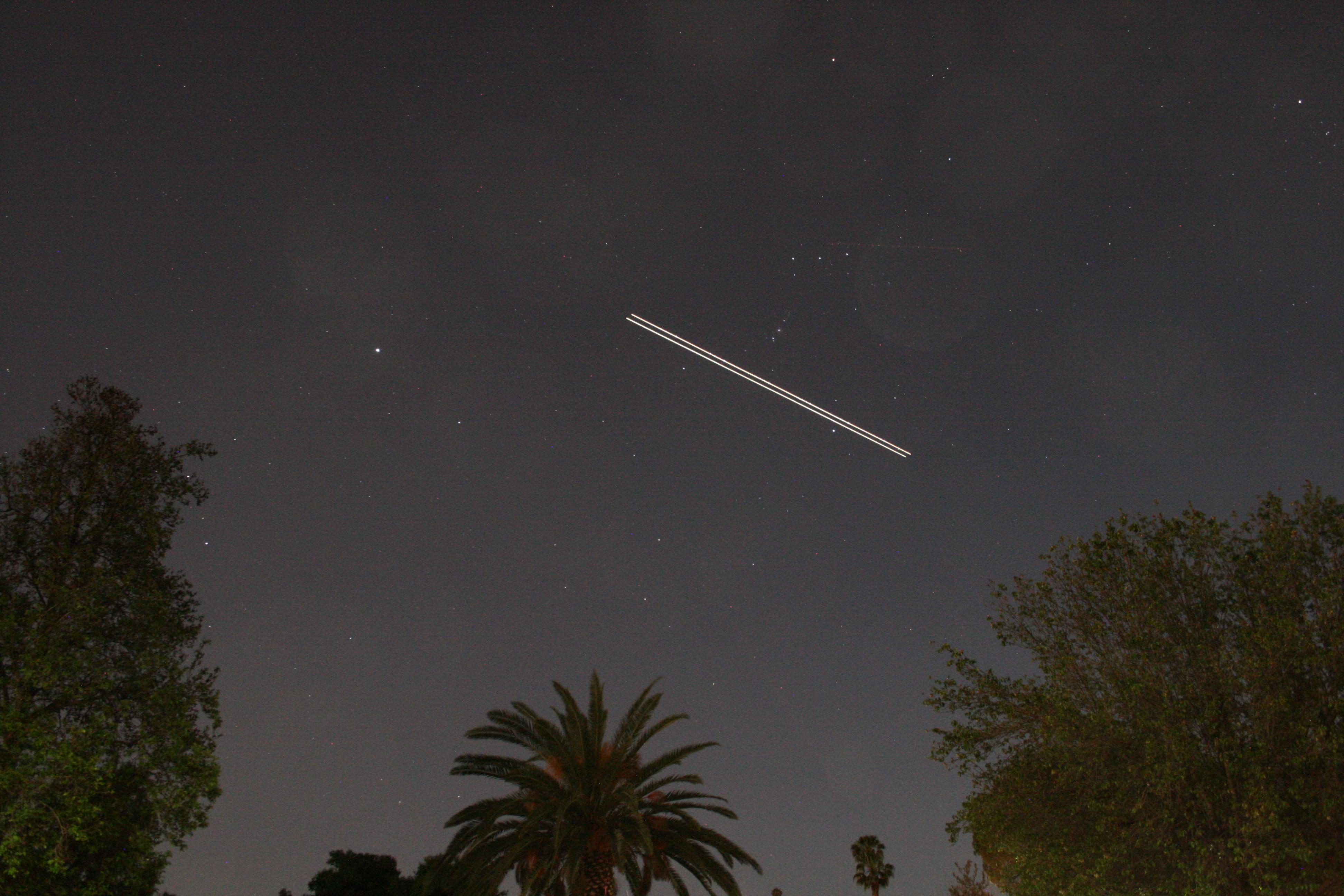 Looking SSW in this 10-second exposure, your first issue is all of the 737’s turning to final for Burbank’s Runway 8. But Orion looked nice above our honkin’ huge palm tree. There’s also a little “putt-putt plane” like I fly just above Orion’s belt, the line of red blinking lights.