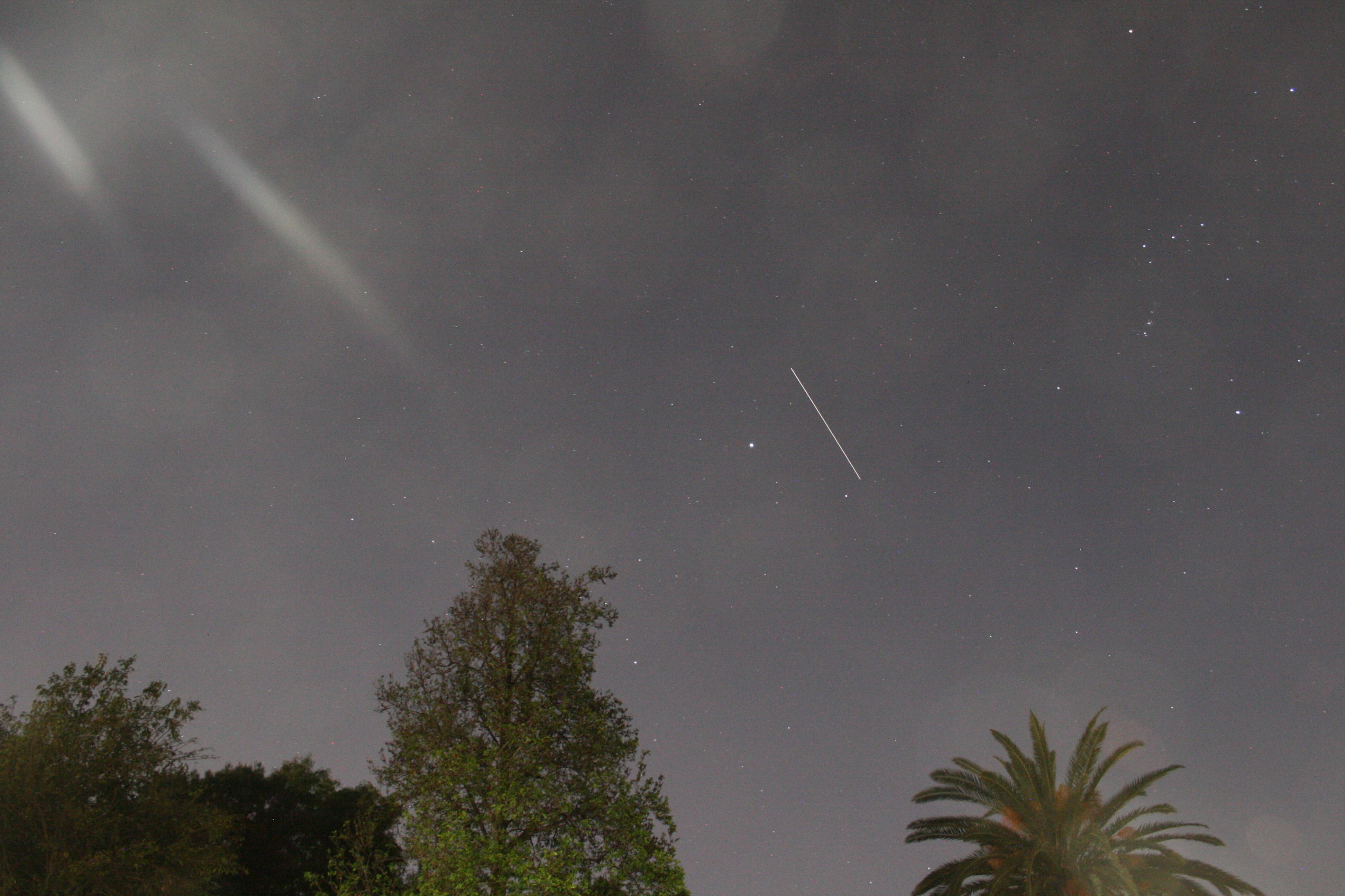 Then I saw the ISS coming up from behind our palm tree, headed straight for the zenith. These are all 15-second exposures, which I was pleased to see was enough to show a bit of nebulosity in the Orion Nebula, as well as some orange tint to Betelgeuse and some blue in Rigel. The glare here at the upper left is from the street light just behind me.