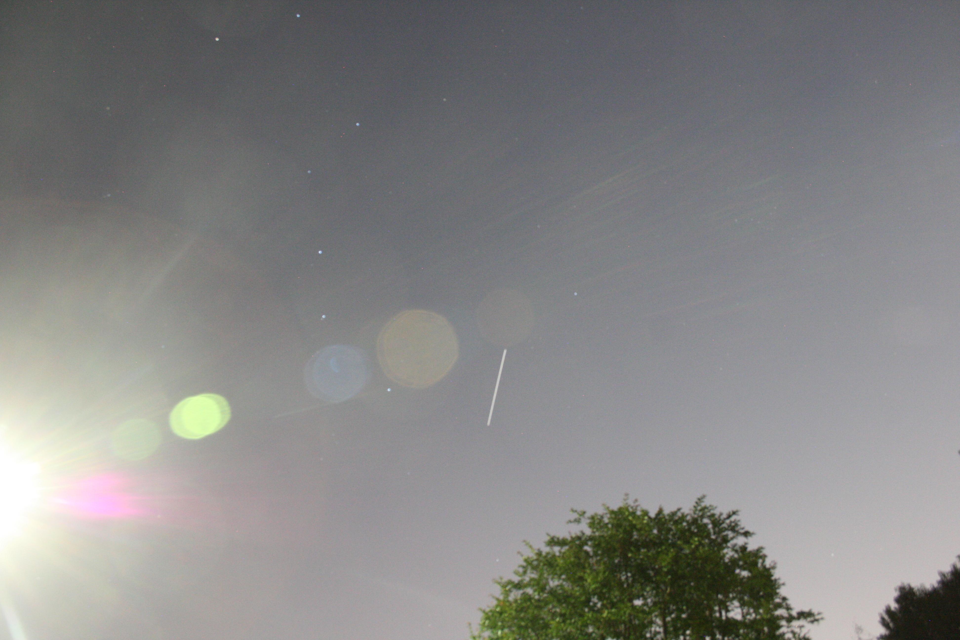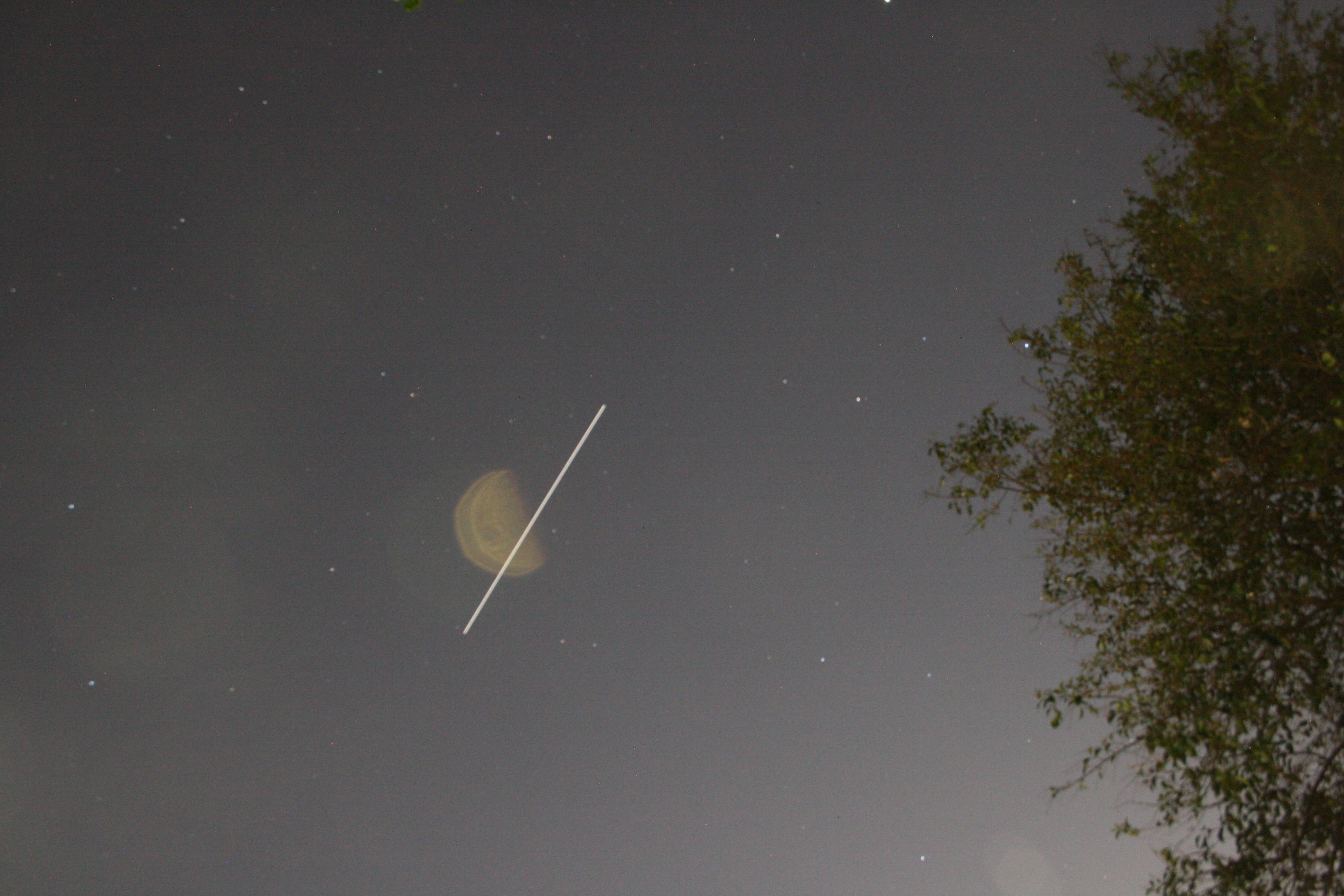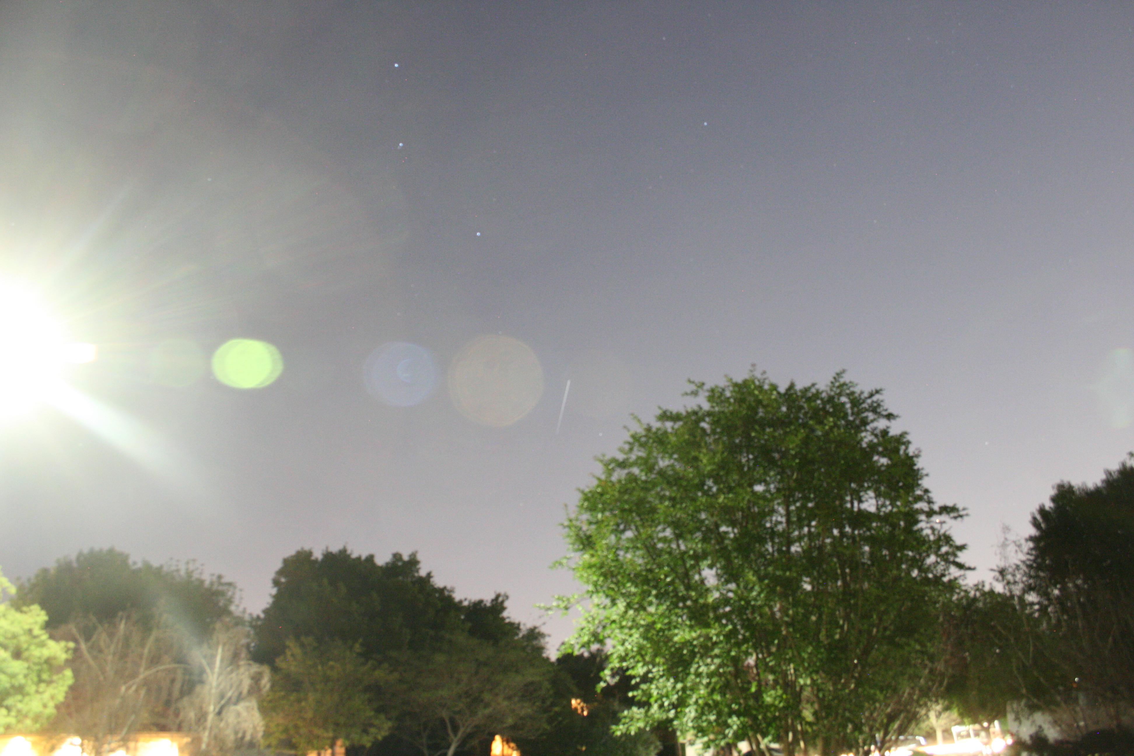 I wasn’t sure if the ISS was still in the frame (instead of looking I was talking to the neighbors and the dogs, just hitting the remote in my hand to snap the next picture as soon as I heard the shutter click off) so I changed the view more toward the zenith above. With more glare from that stupid street light, of course.