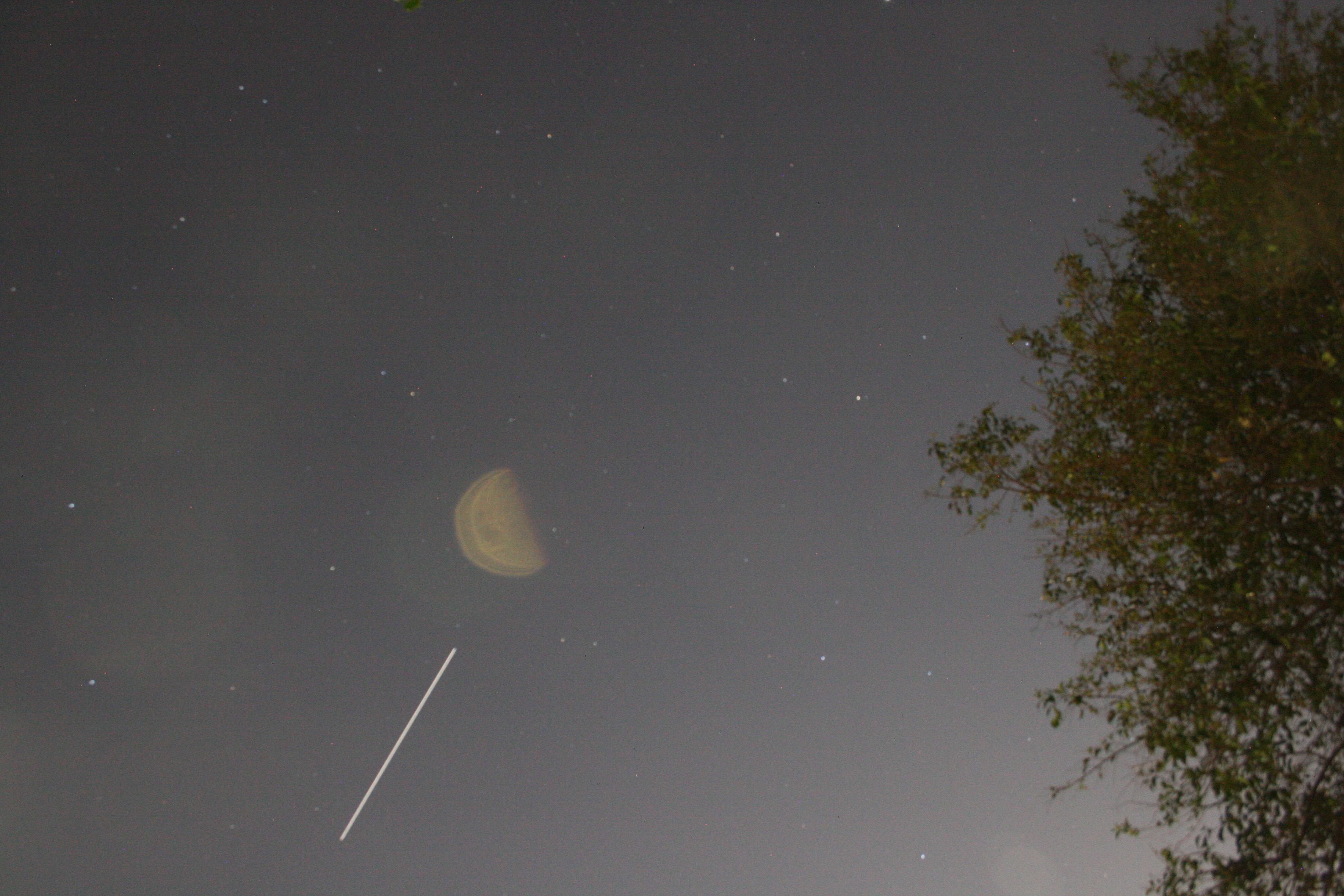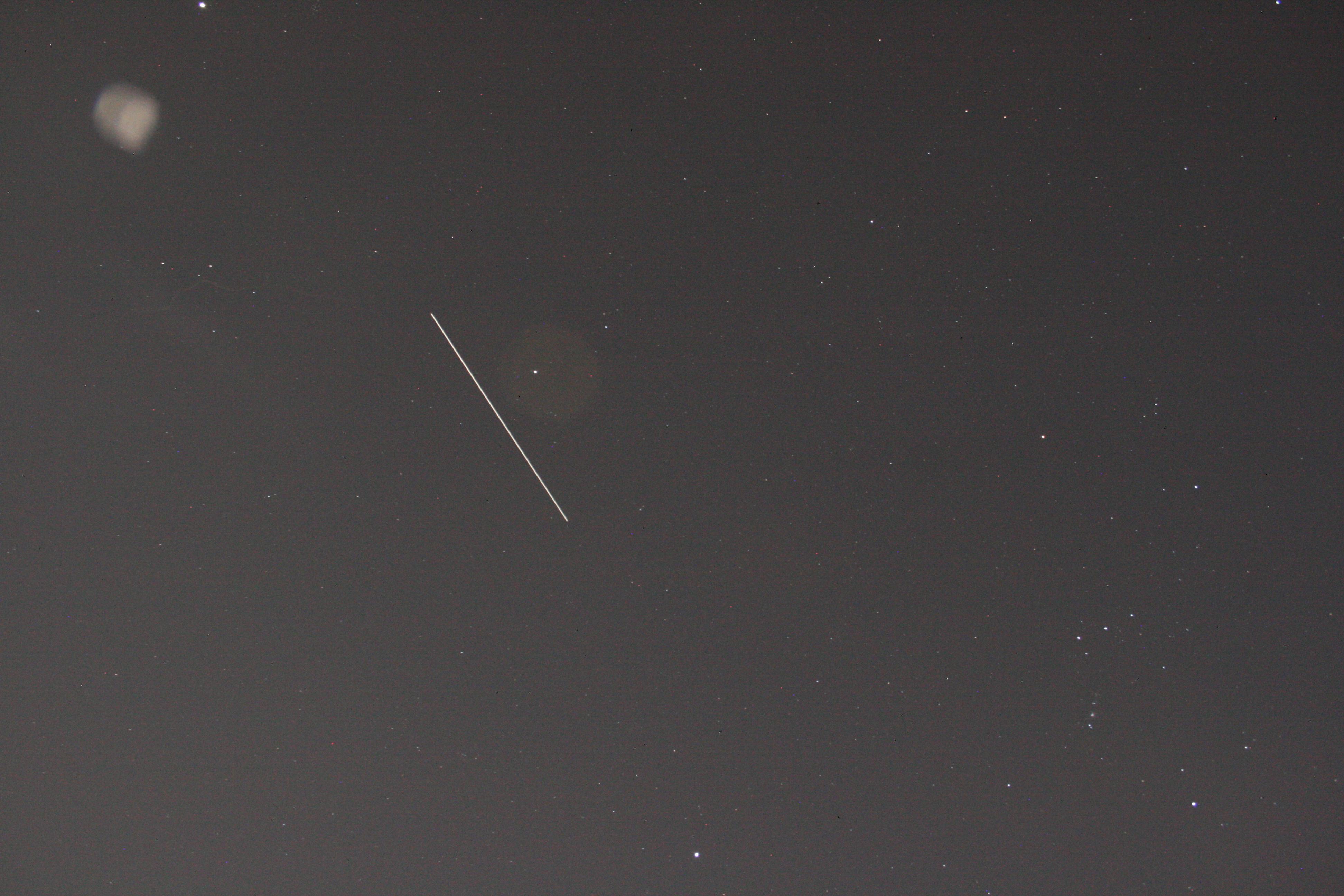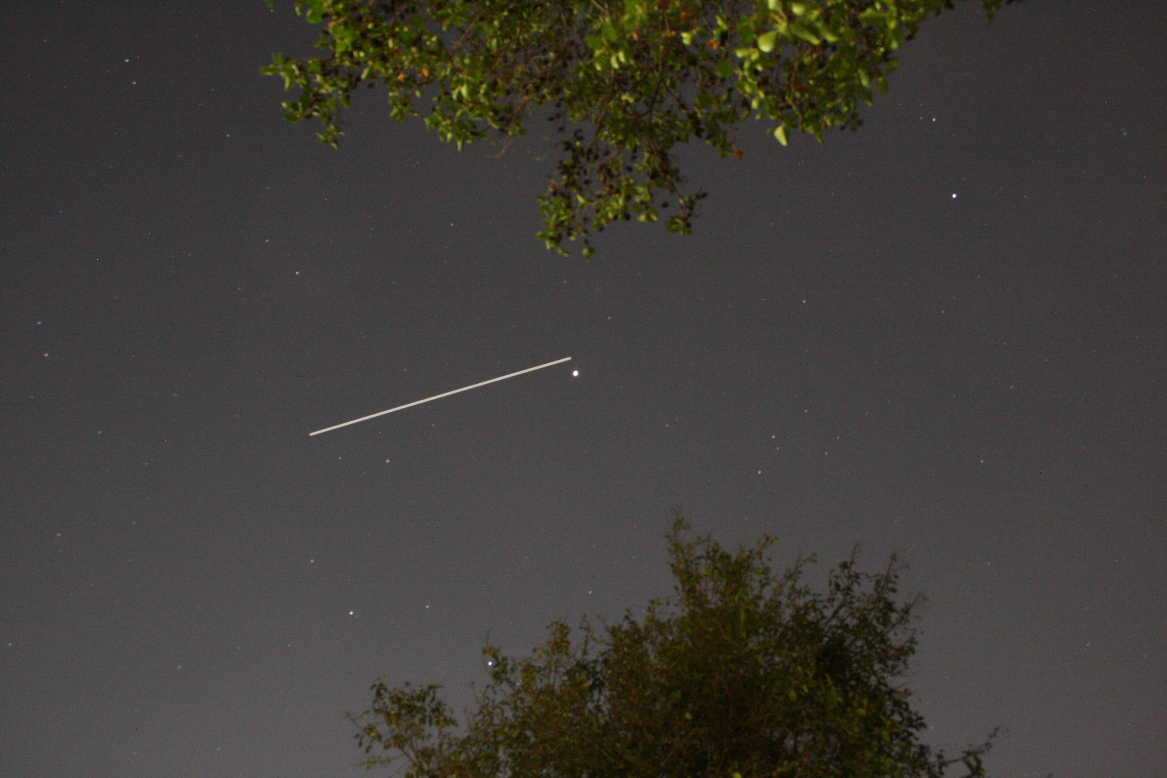 I wasn’t sure if the ISS was still in the frame (instead of looking I was talking to the neighbors and the dogs, just hitting the remote in my hand to snap the next picture as soon as I heard the shutter click off) so I changed the view more toward the zenith above. With more glare from that stupid street light, of course.