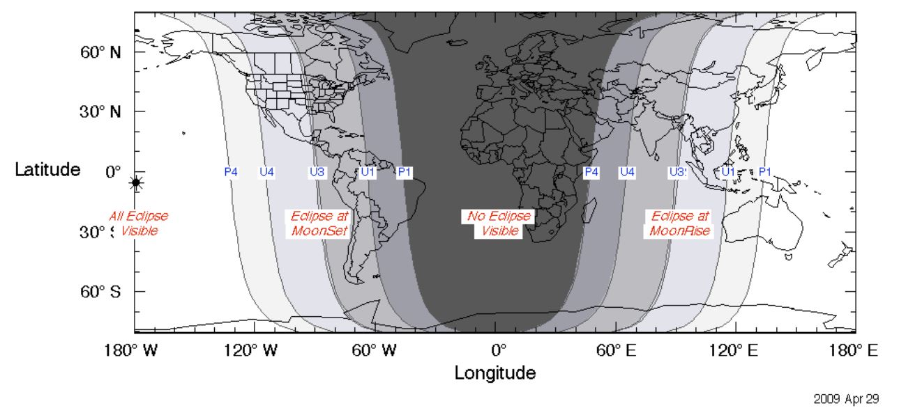 First of all, it’s best viewed from Hawaii or someplace in the middle of the Pacific Ocean, Australia, New Zealand, or far eastern Asia. (In the map shown, night & day are switched, so dark is bad for lunar eclipse watching.) For North America, most of the country will have the moon set during some part of the eclipse. If you’re east of the Mississippi, moonset will occur before totality begins. If you’re anywhere west of the Rockies you’ll have moonset just after totality ends.