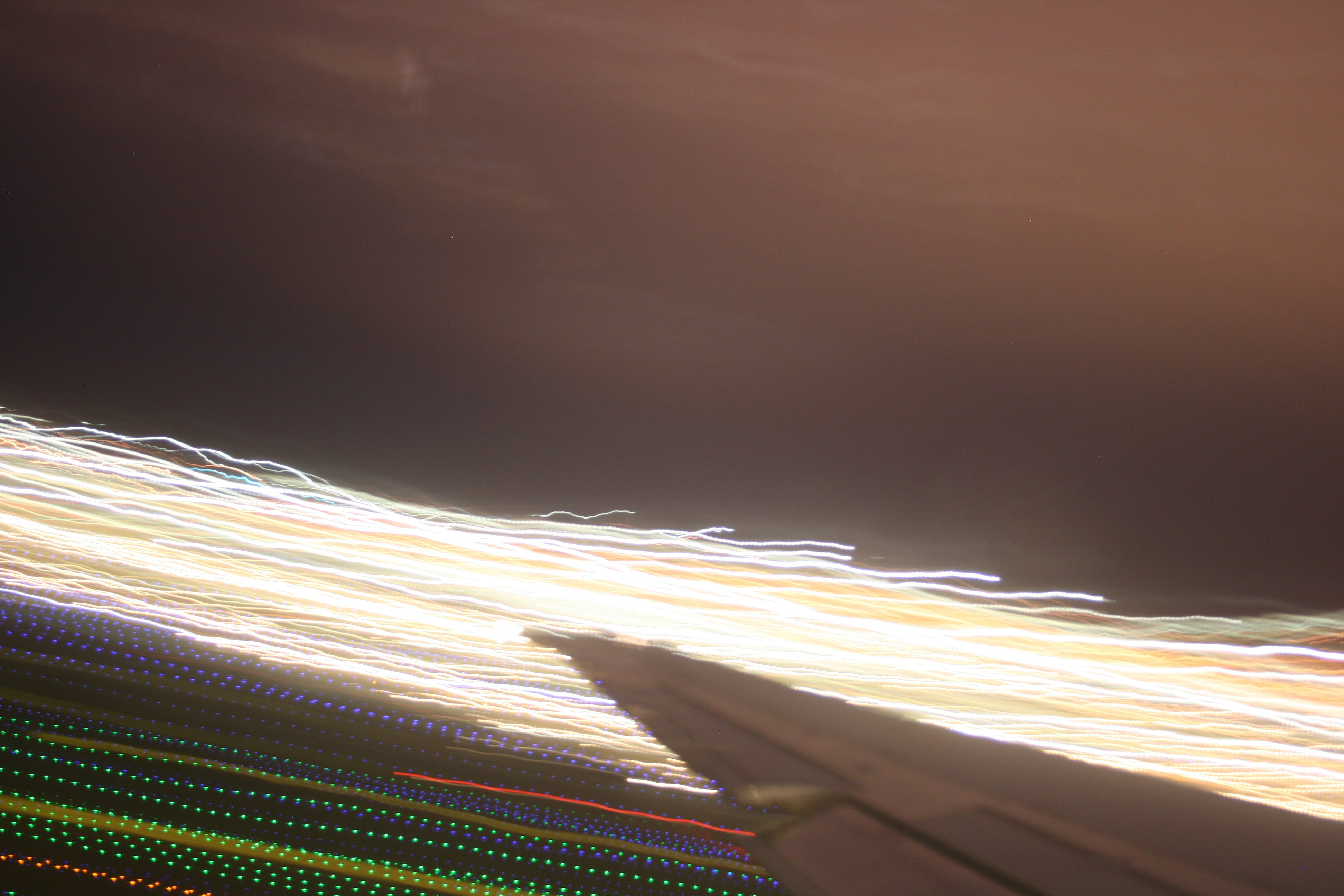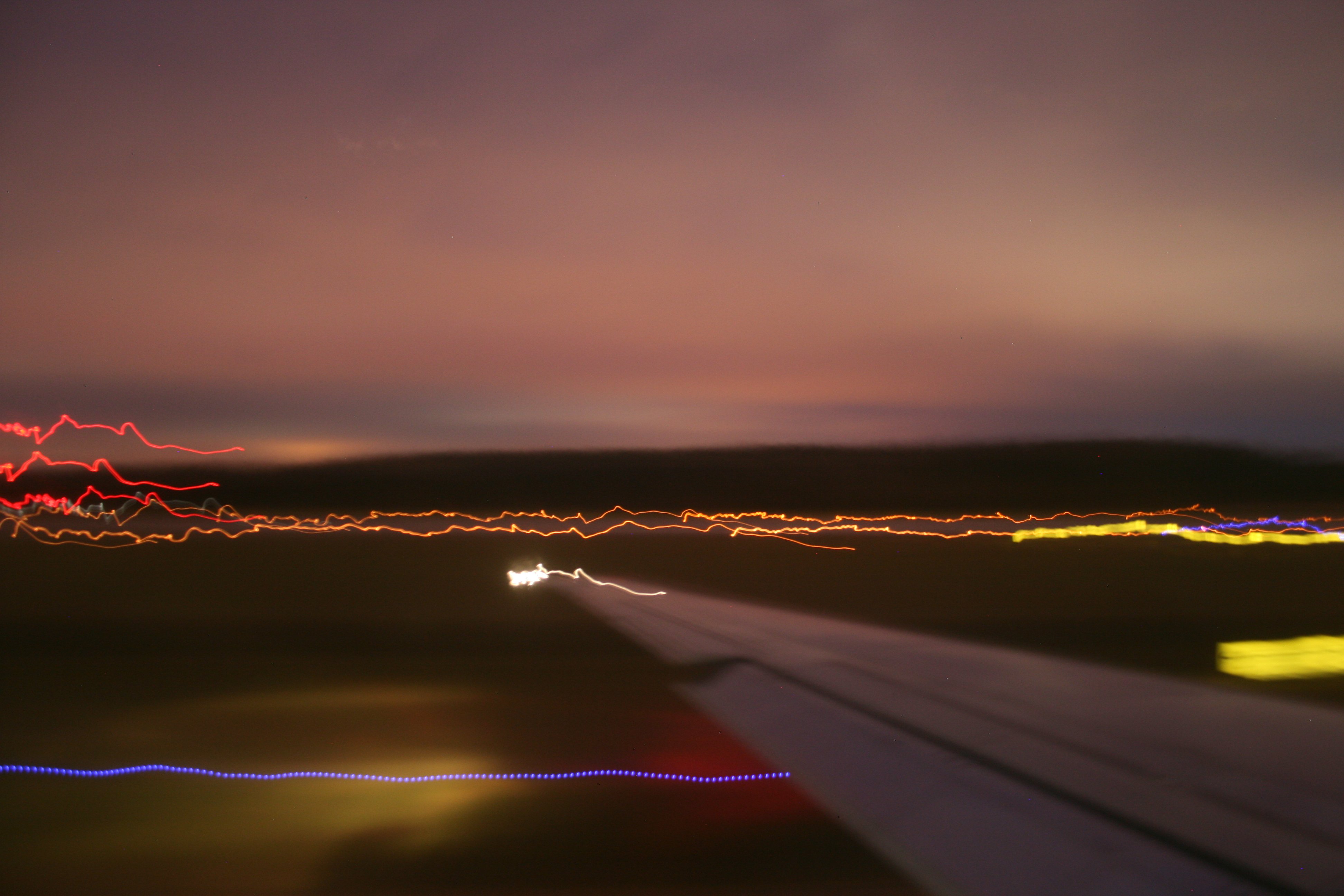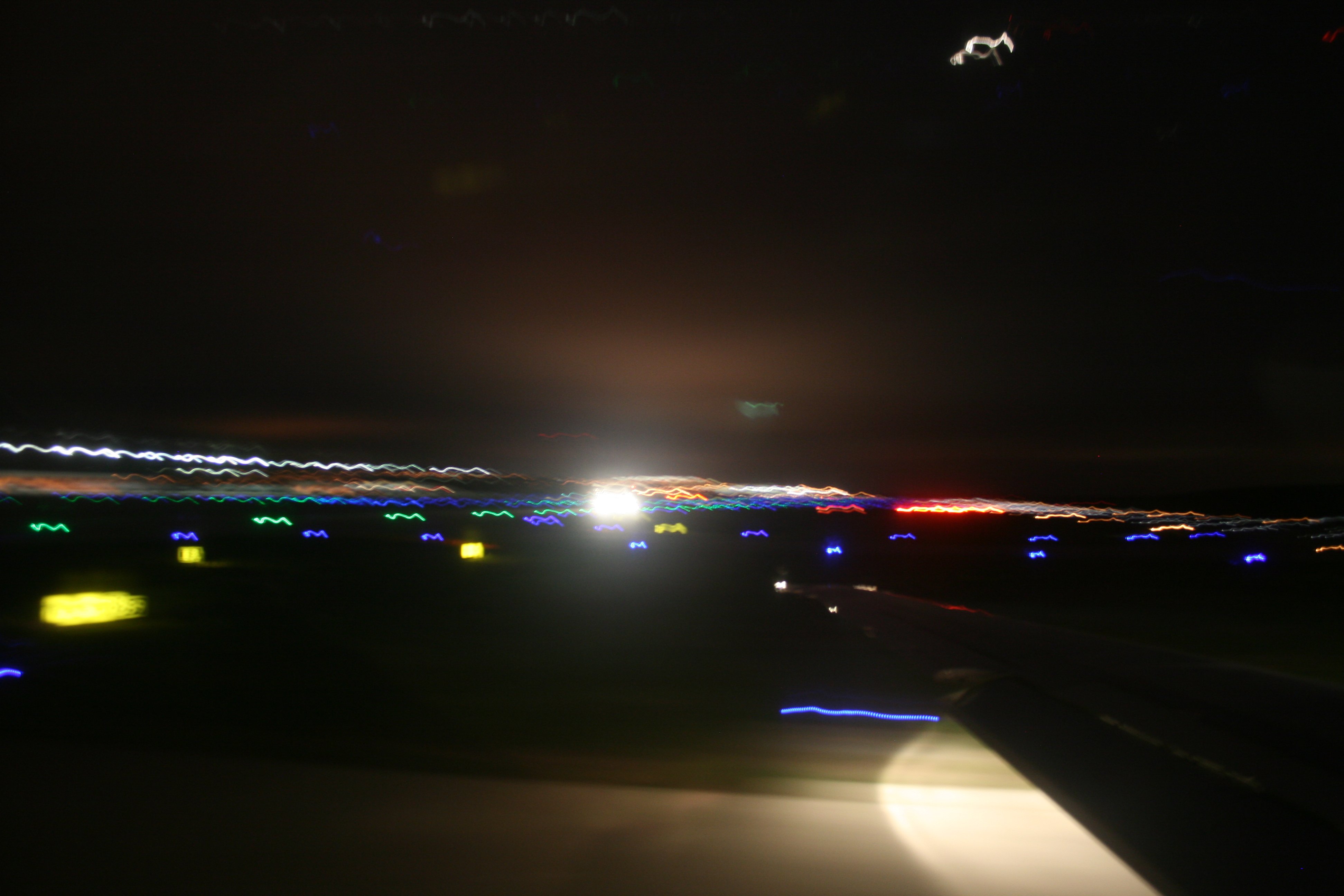 Almost two hours before dawn as we taxied out from the terminal. Nothing to see outside except the bright lights on the buildings in the distance, the blue taxiway lights, the red warning lights, the red and yellow directional signs, and the green runway edge lights.