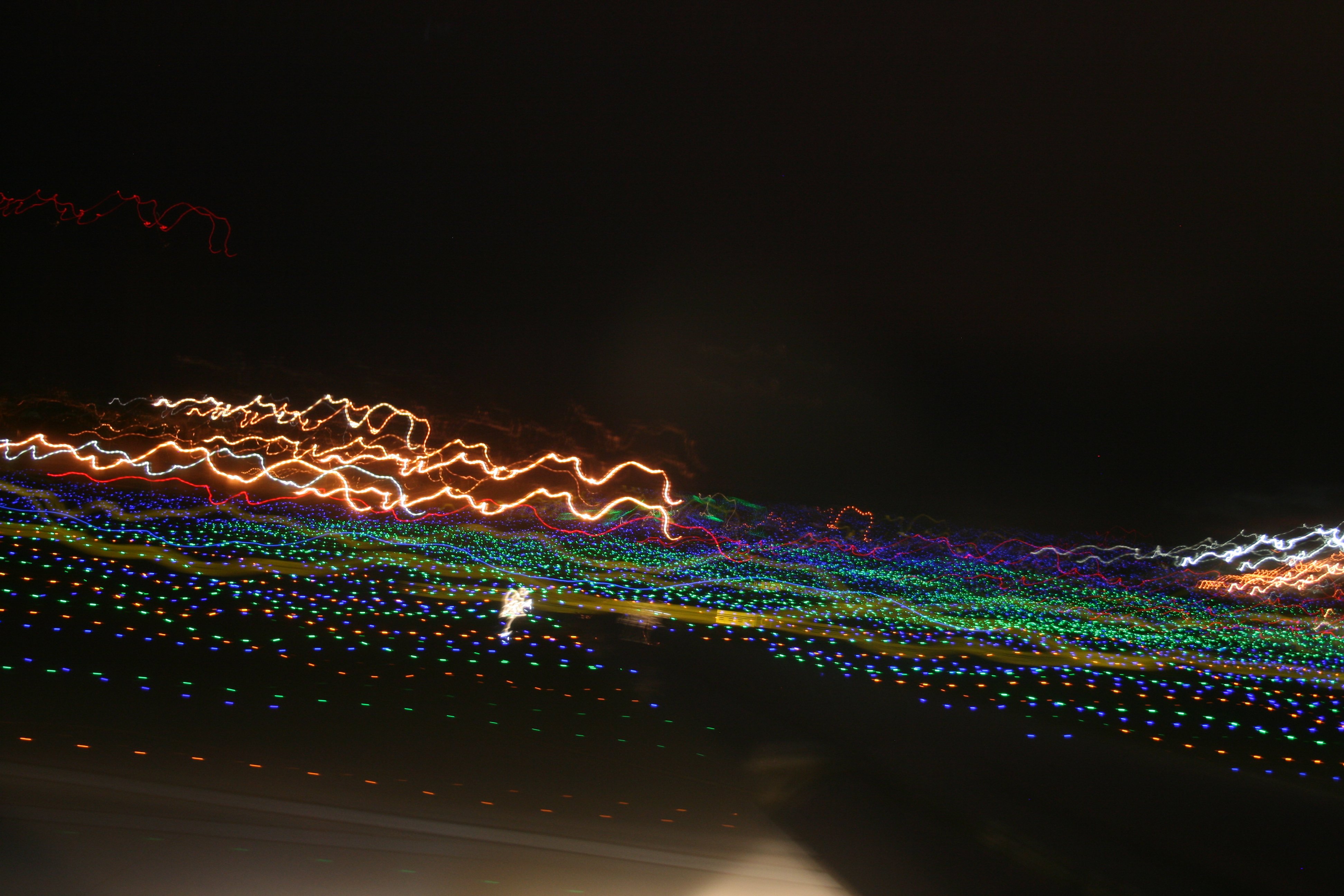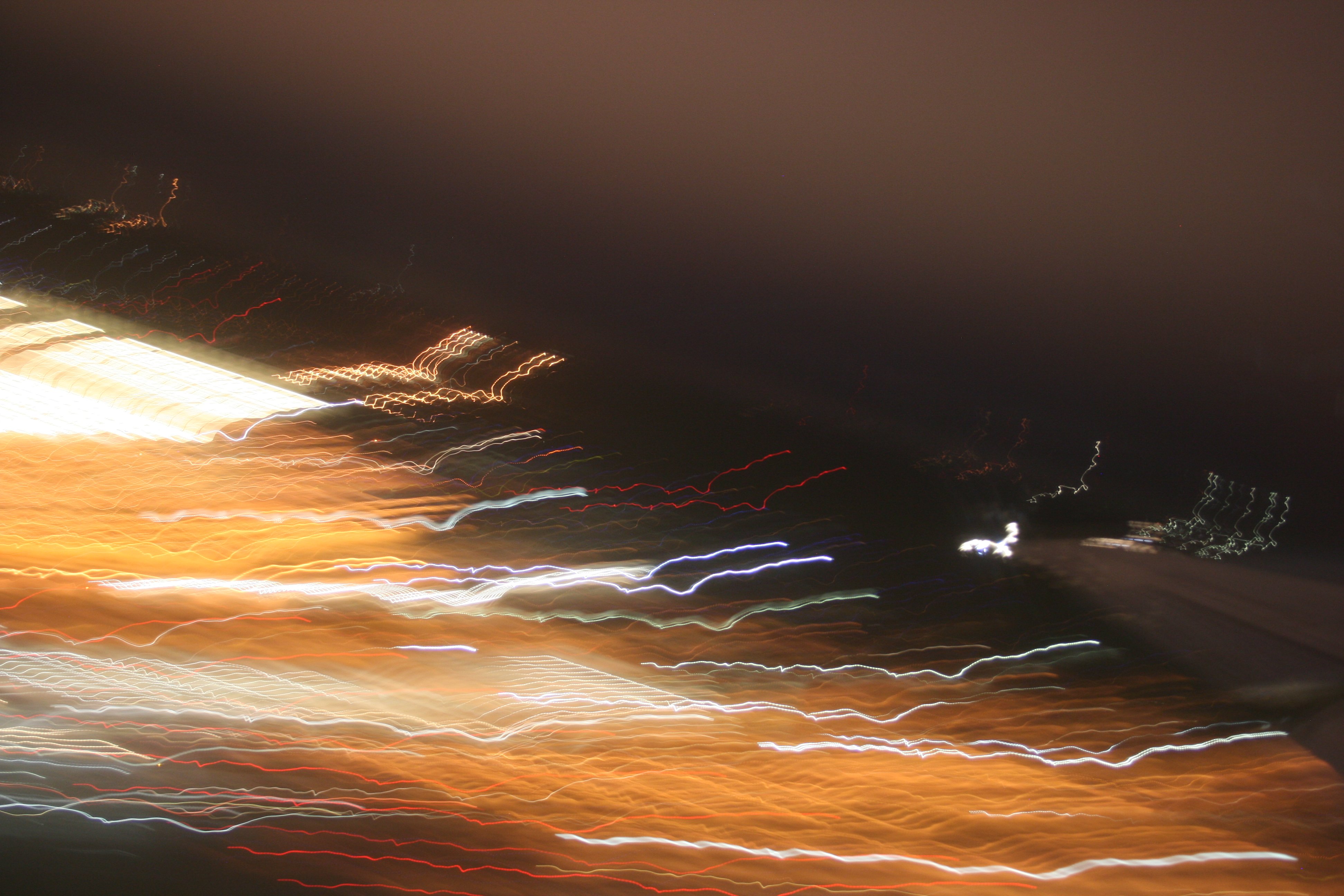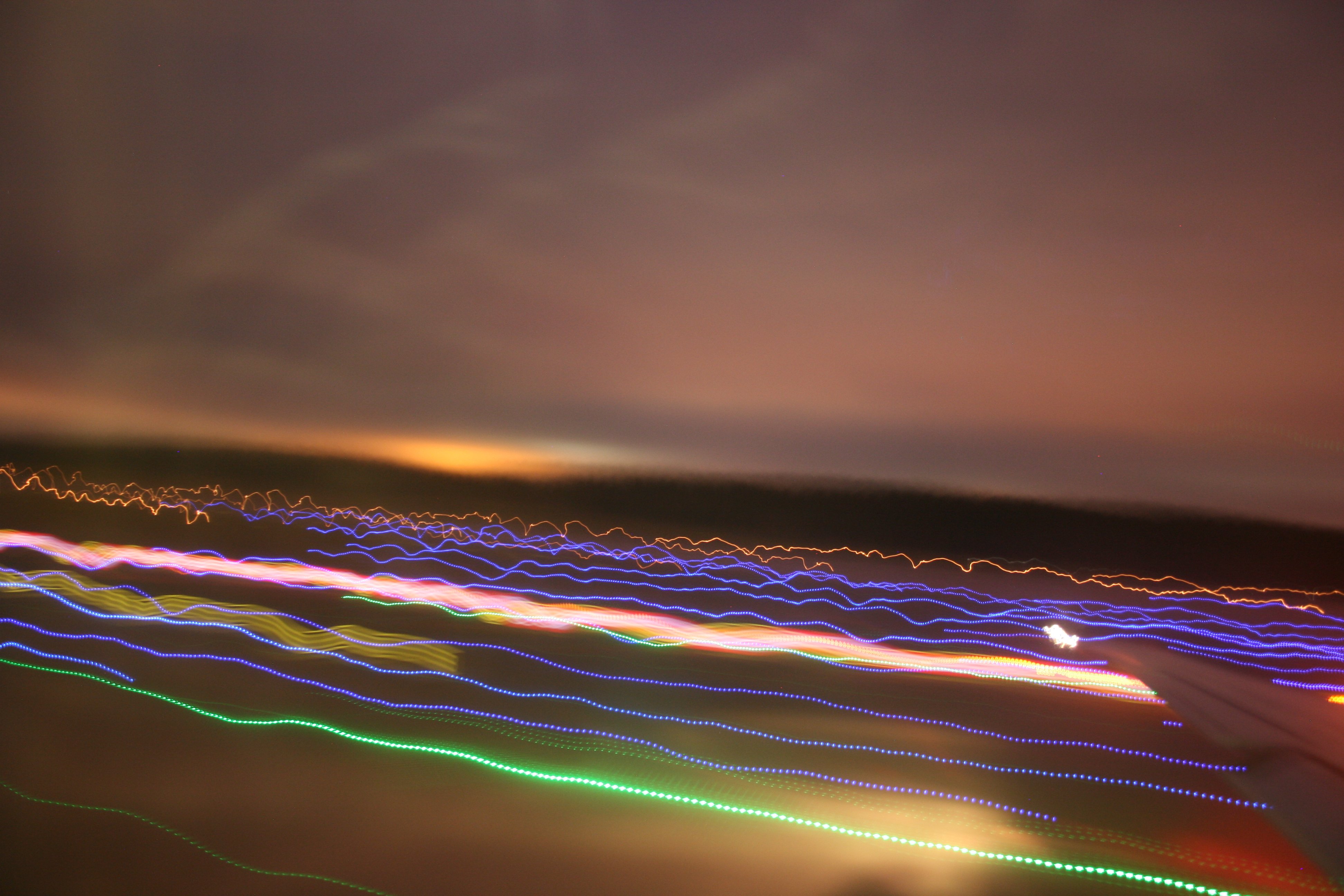 Almost two hours before dawn as we taxied out from the terminal. Nothing to see outside except the bright lights on the buildings in the distance, the blue taxiway lights, the red warning lights, the red and yellow directional signs, and the green runway edge lights.
