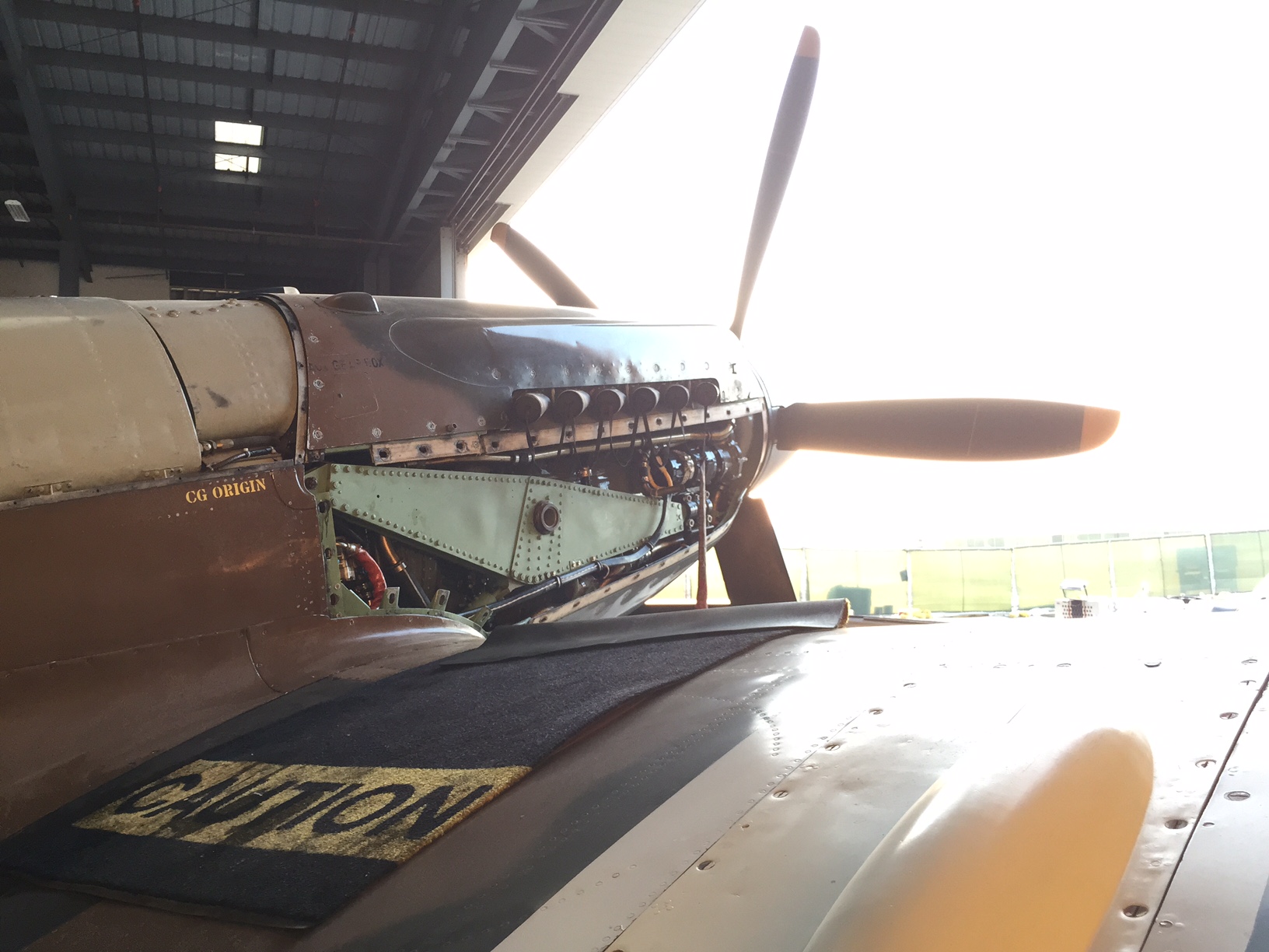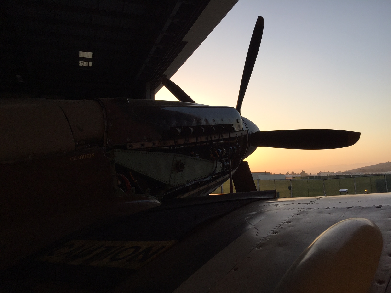 With the Washington trip coming up, a lot of loose ends need to be tied up at the hangar, especially since I was gone for six days last week. When all was said and done, I got more involved than I expected and was thus caught by surprise when I came out to find the setting sun peeking through the slightly open hanger doors, beautifully silhouetting our Spitfire.
