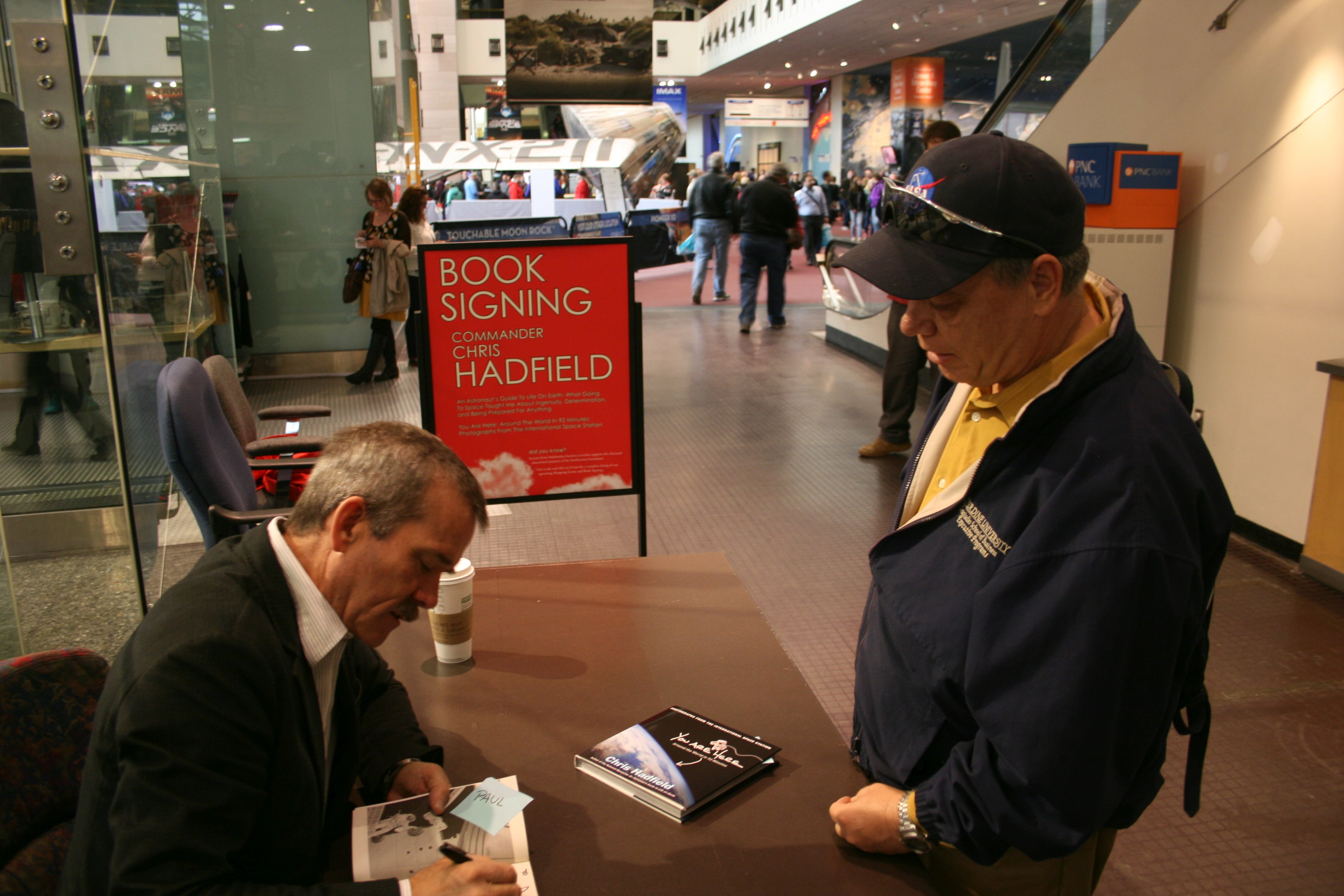 I found myself back at the Smithsonian Air & Space Museum today. Not that I really needed a big excuse, but I had heard that there was a certain Canadian astronaut, musician, and author who would be there signing his two books. I figured there might be an hour or more wait, but it would be worth it anyway. Instead, it was a twenty minute wait and there was time to actually chat for a minute or two about his work, the CAF, his F-86 Saber jet, and his concerts with Amanda Palmer.