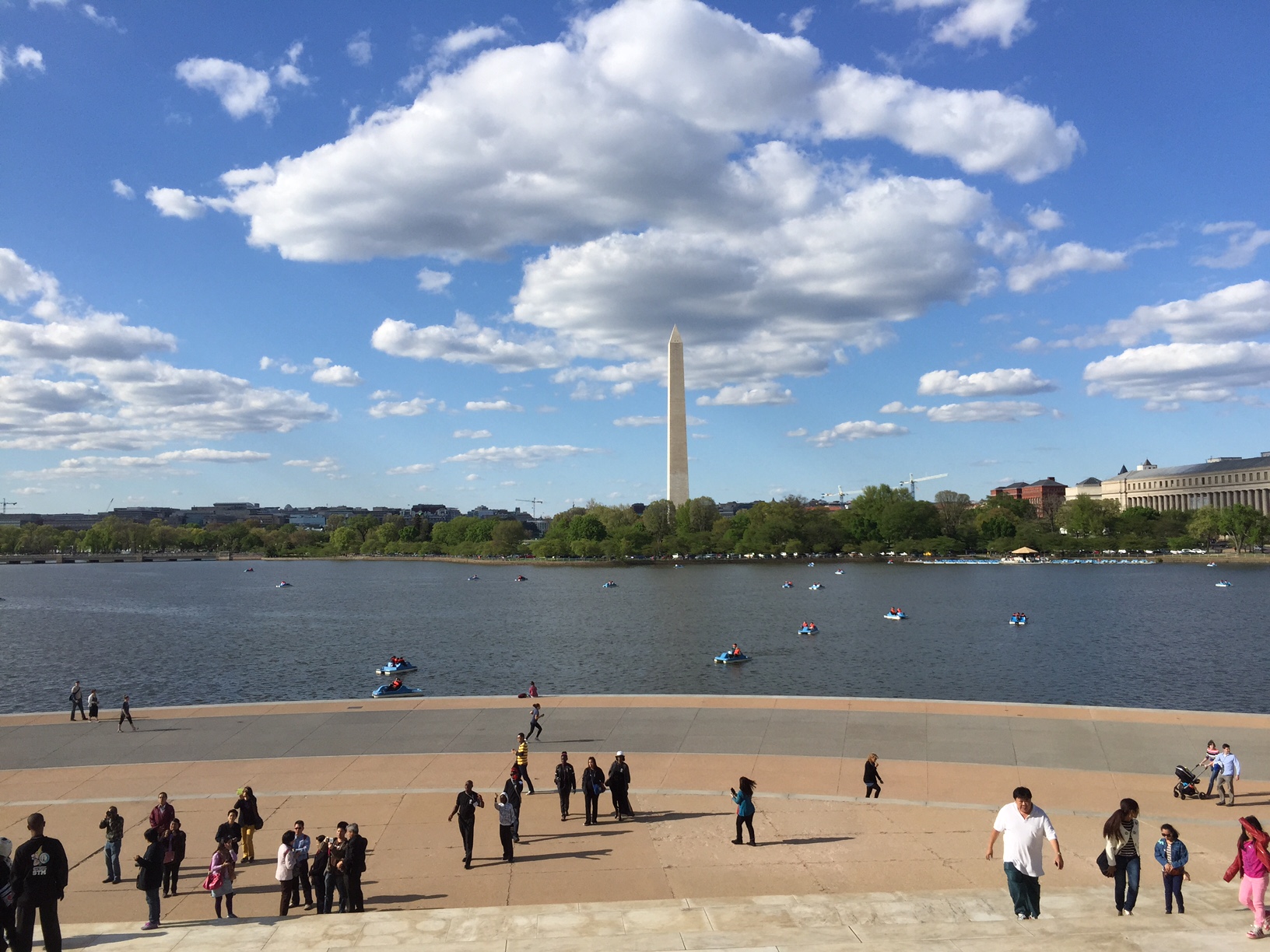 From the steps of the Jefferson Memorial, across the Tidal Basin full of paddle boats, you can see the White House through the trees to the left of the Washington Monument.