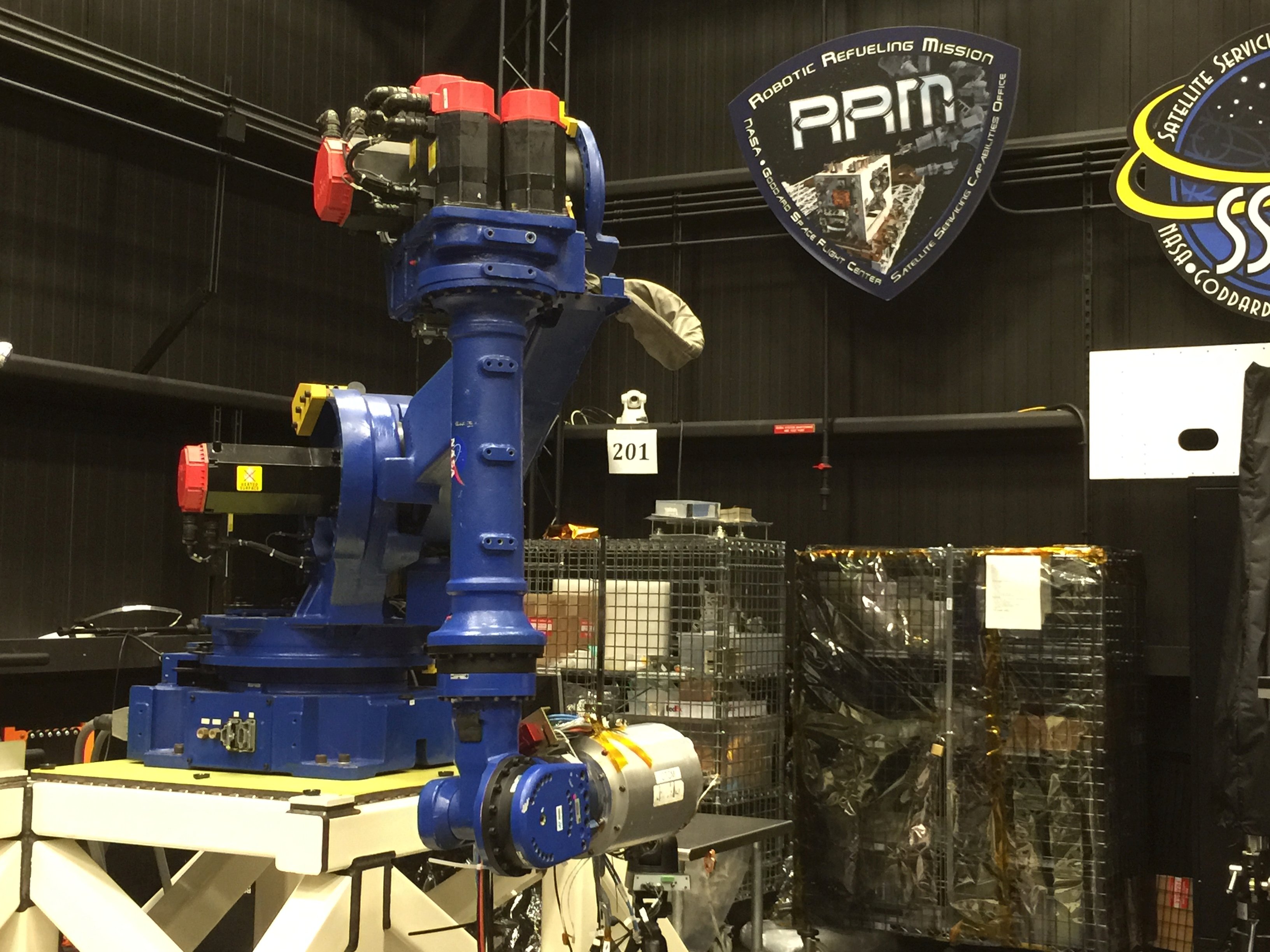The RRM mission on ISS uses the Canadian-built Dextre two-armed robot along with tools built for this task. Dextre can be held at the end of Canadarm2 or it can be docked at one of the Mobile Base Stations on ISS. Seen here is a heavy-duty version of a remotely controlled robot similar to Dextre. (Dextre’s tough, but lightweight and designed to work in microgravity. This one has to be bigger and heavier to work at 1G.)