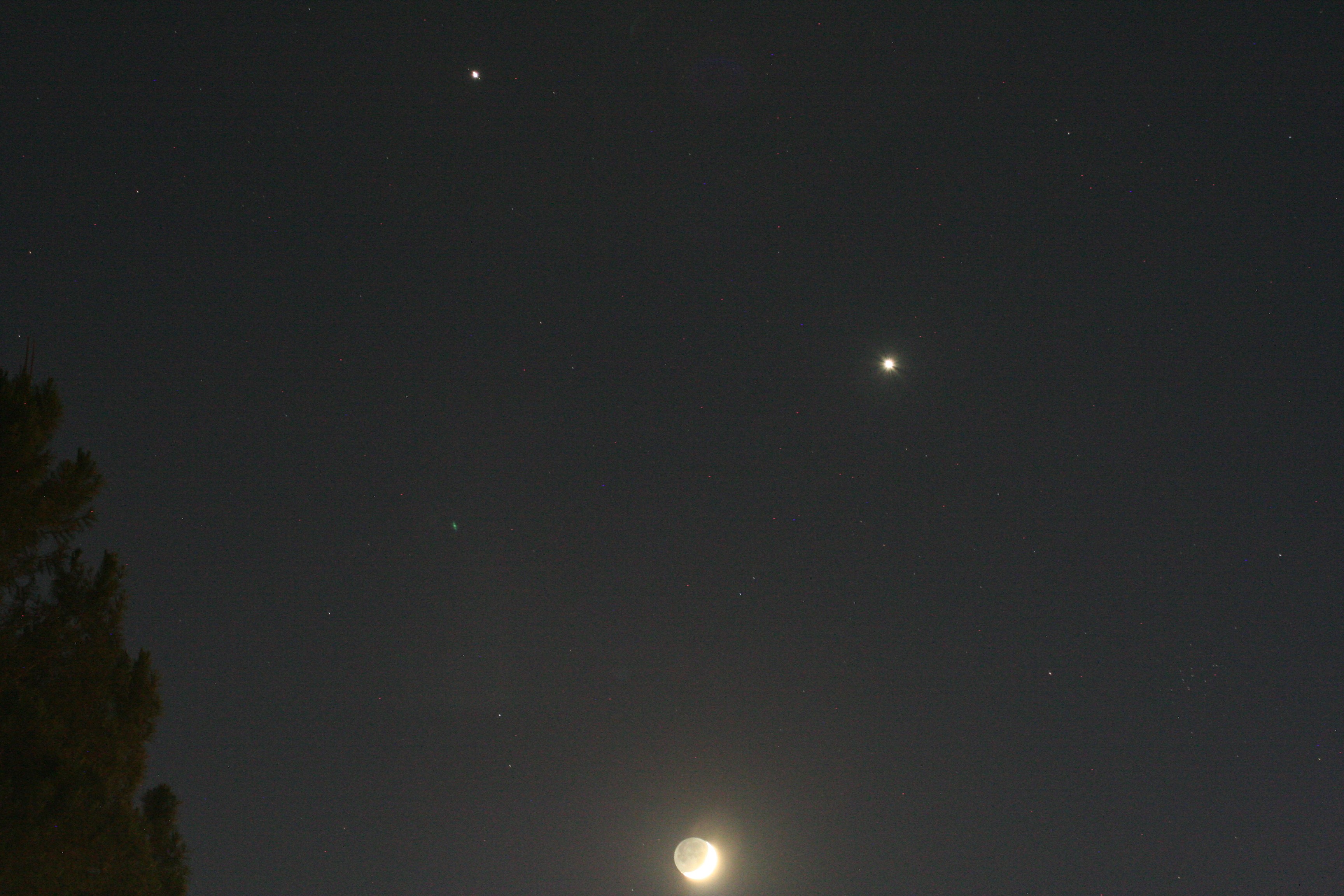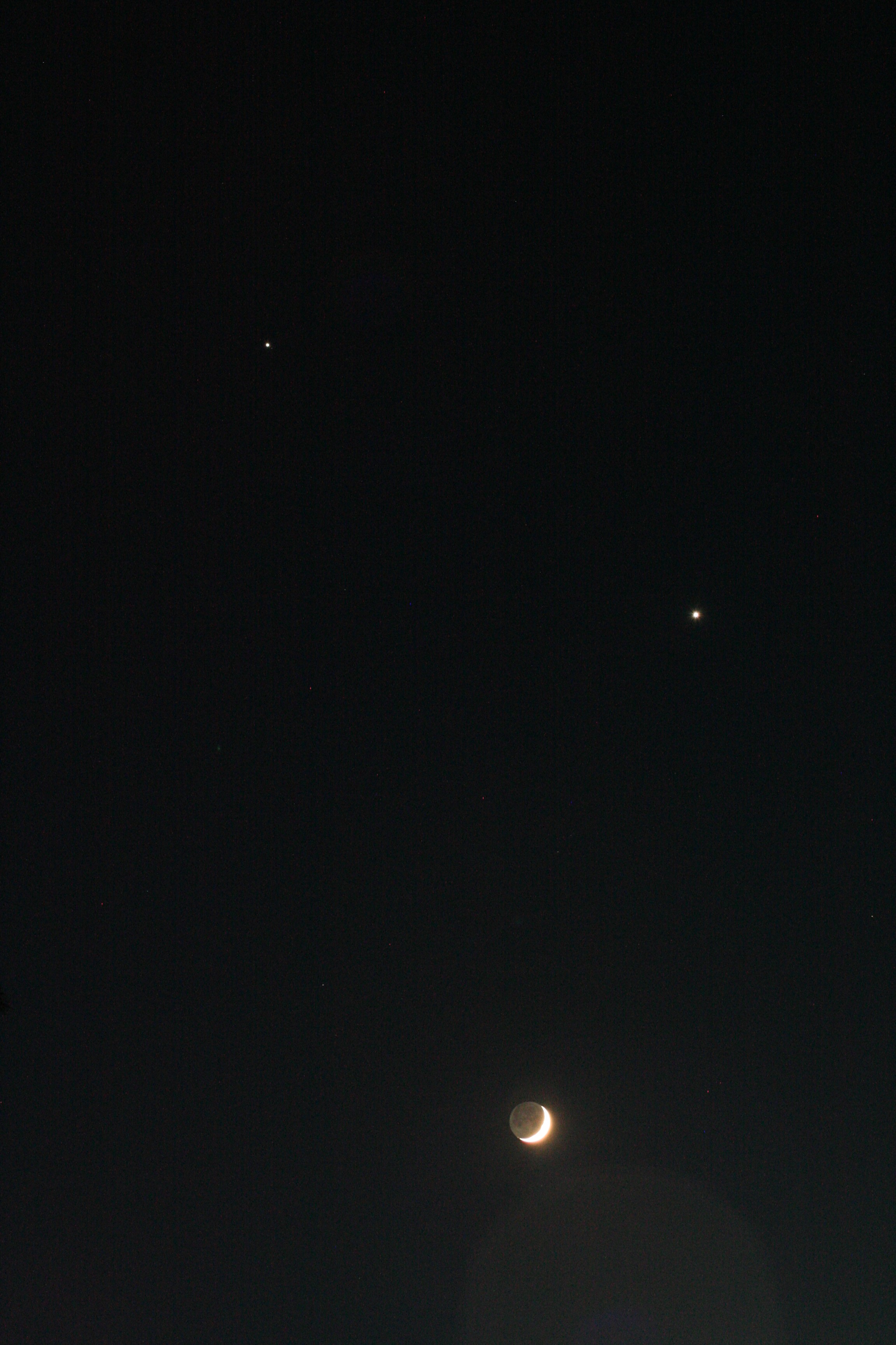 The dimmer one at the upper left is Jupiter, the brighter one at the lower right is Venus. Tonight the crescent moon has joined them, and it will be rising up and out of this view over the next three nights. But for this weekend, the three objects will be a spectacular trio.