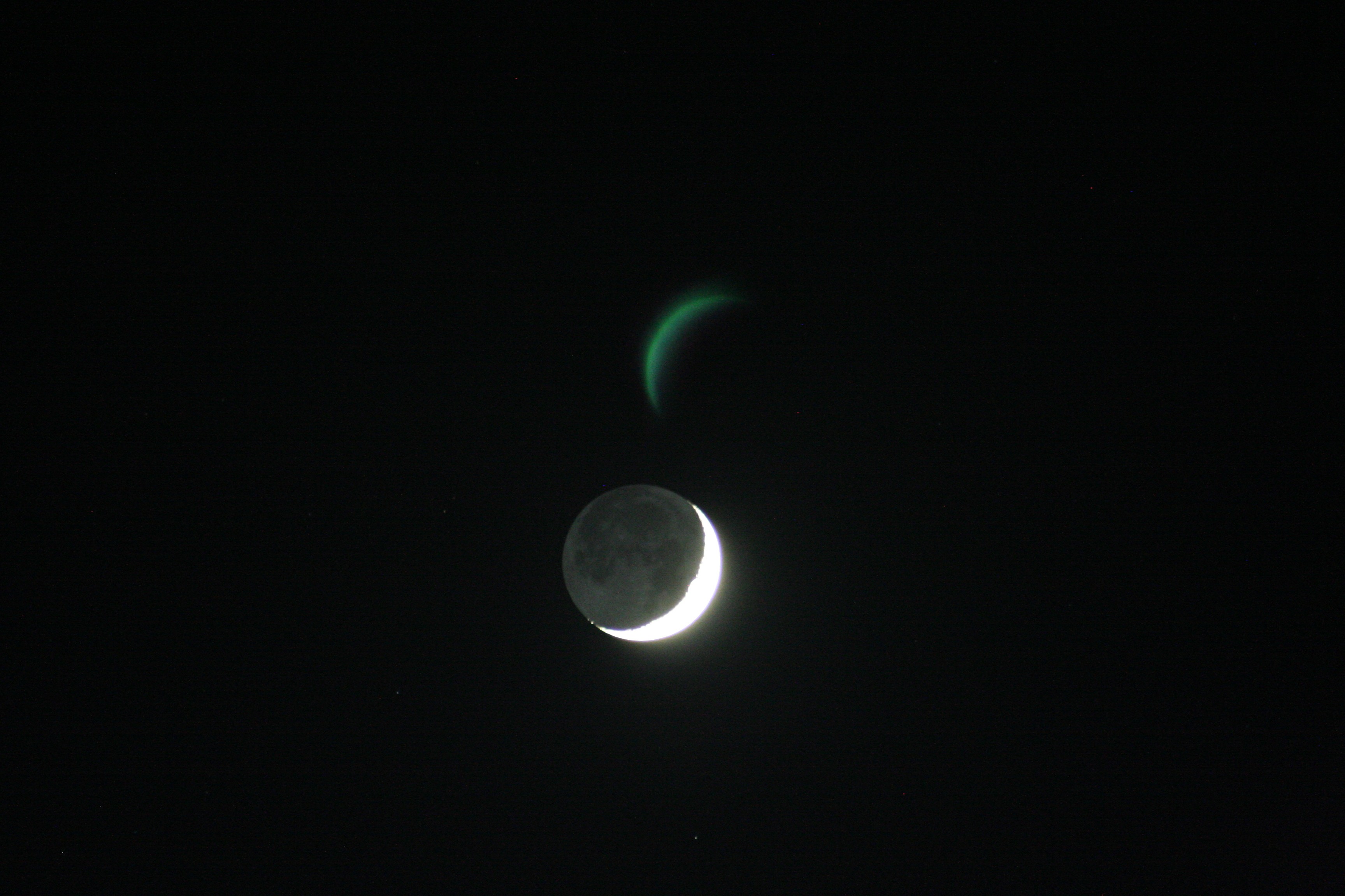 Zooming in on the moon not only shows us the ghostly green internal reflection in the lens, but also shows us the majority of the moon’s face illuminated only by reflected light from the Earth, known as “Earthshine.”