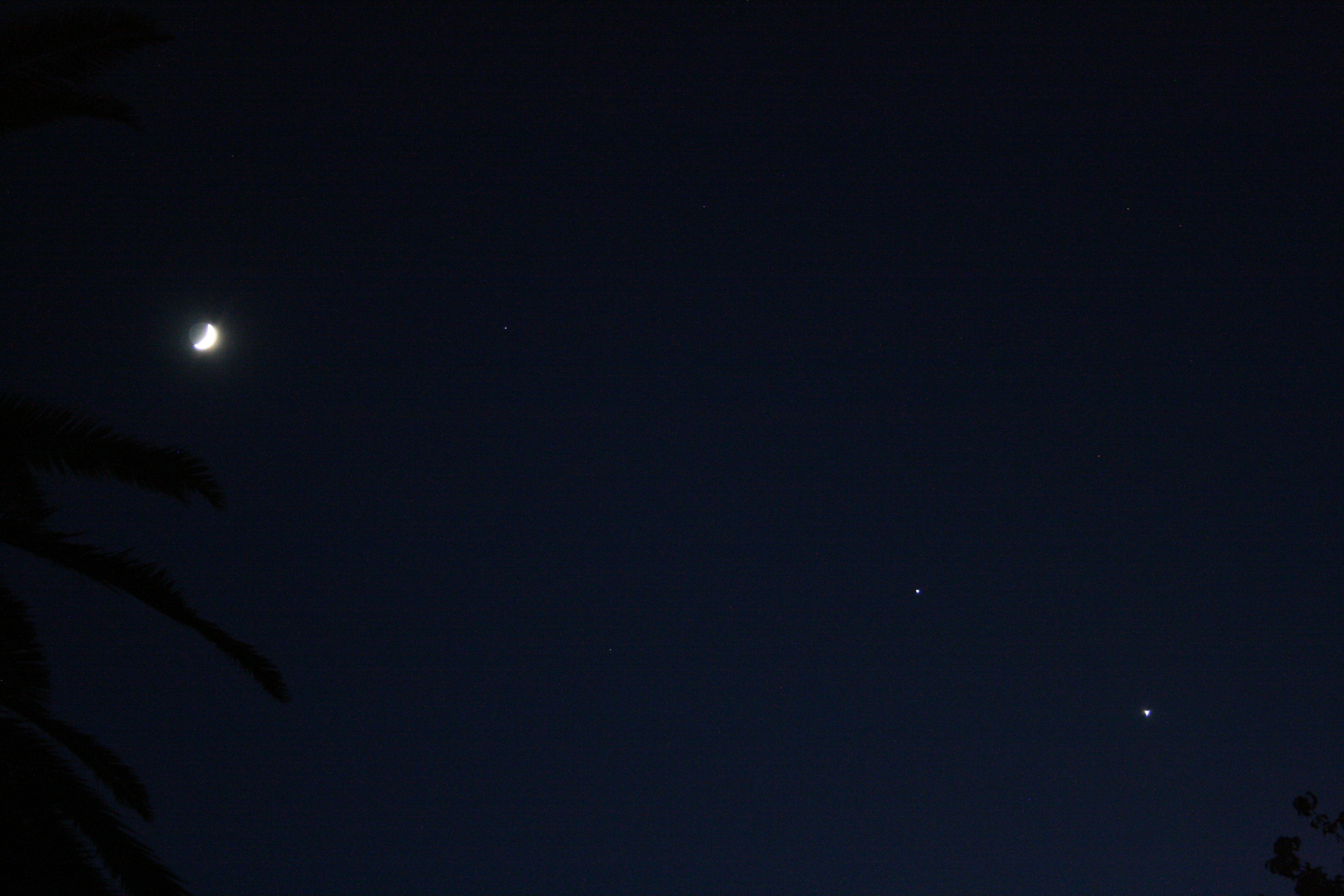 Friday night the young, crescent moon was underneath Jupiter and Venus, while yesterday night the moon had moved up to make a nice triangle with Jupiter and Venus. Tonight, the moon’s moved on. (As expected – celestial mechanics and all of that. If it hadn’t moved on, THAT would be news!)