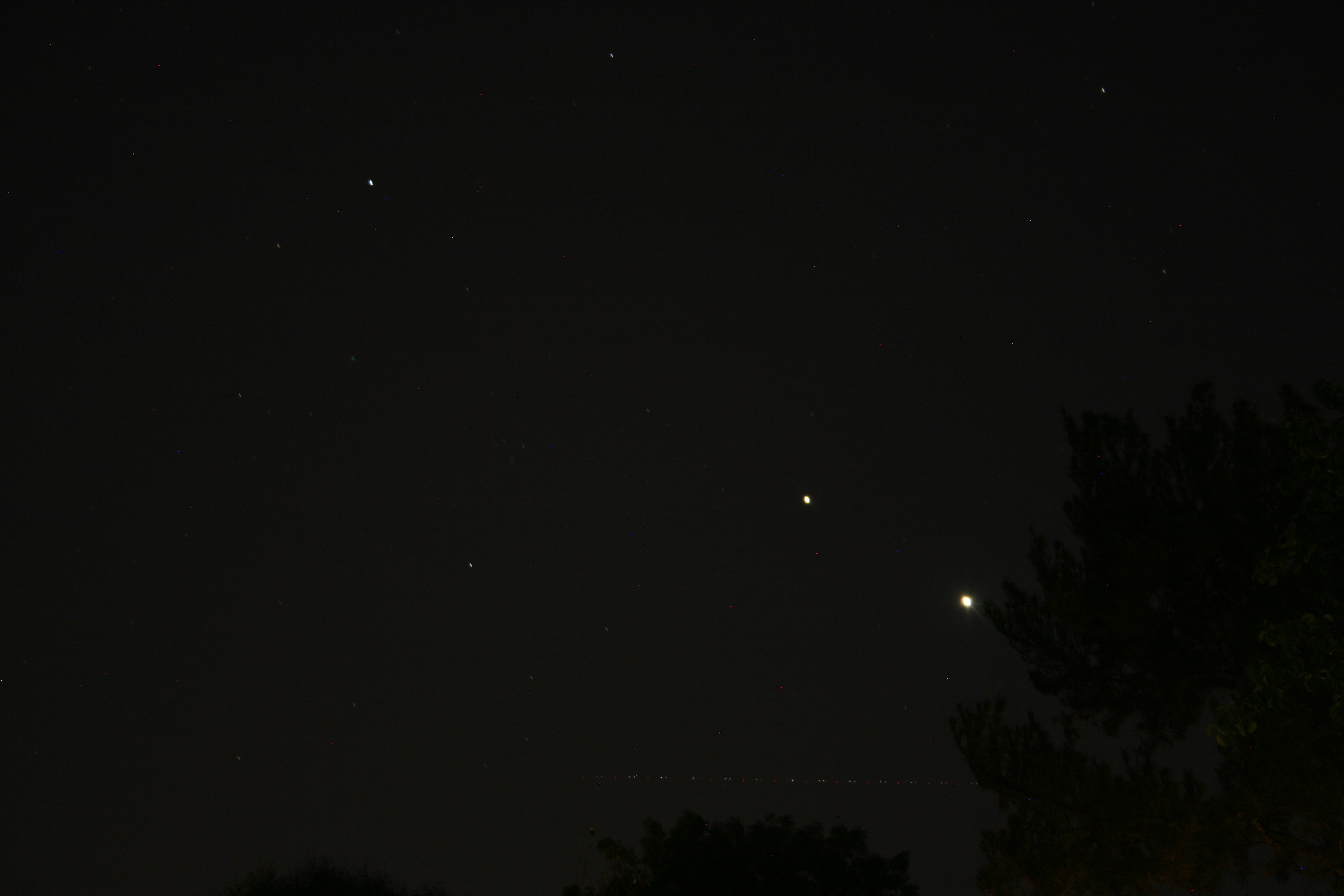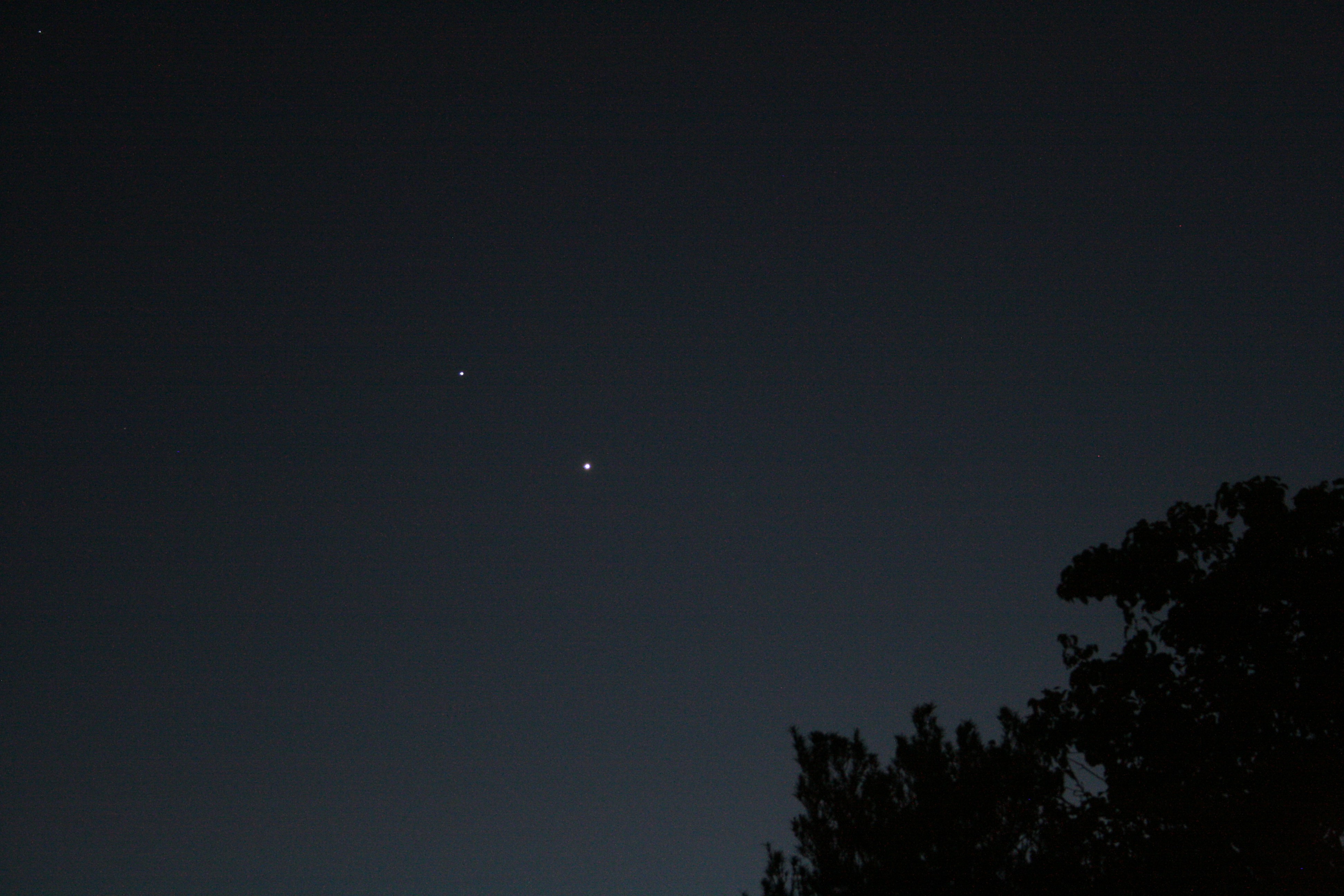 Tonight, higher in the sky — but still closer together. Well, at least from our point of view. Venus, the brighter one on the lower right, is 0.5533 AU (51 million miles) away from Earth, while Jupiter is 6.02 AU (559 million miles) away.