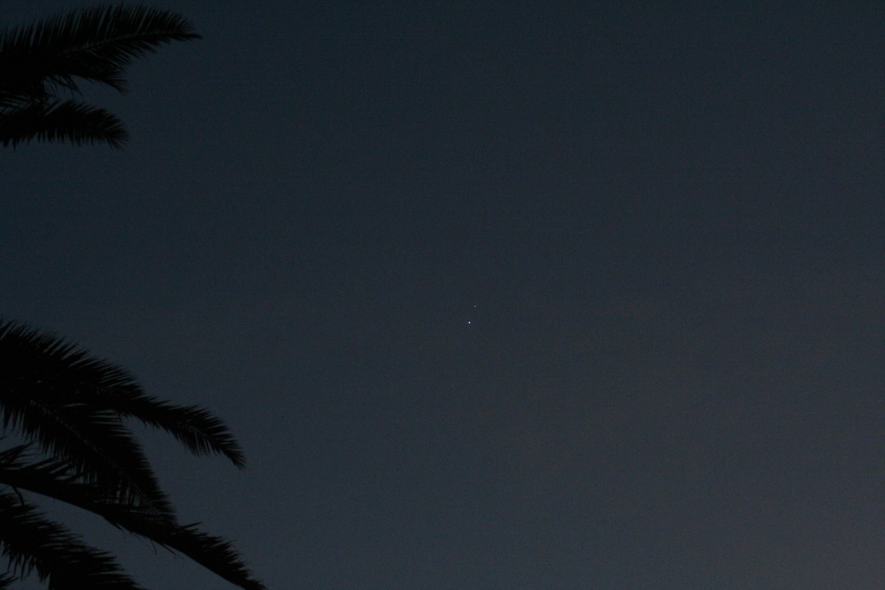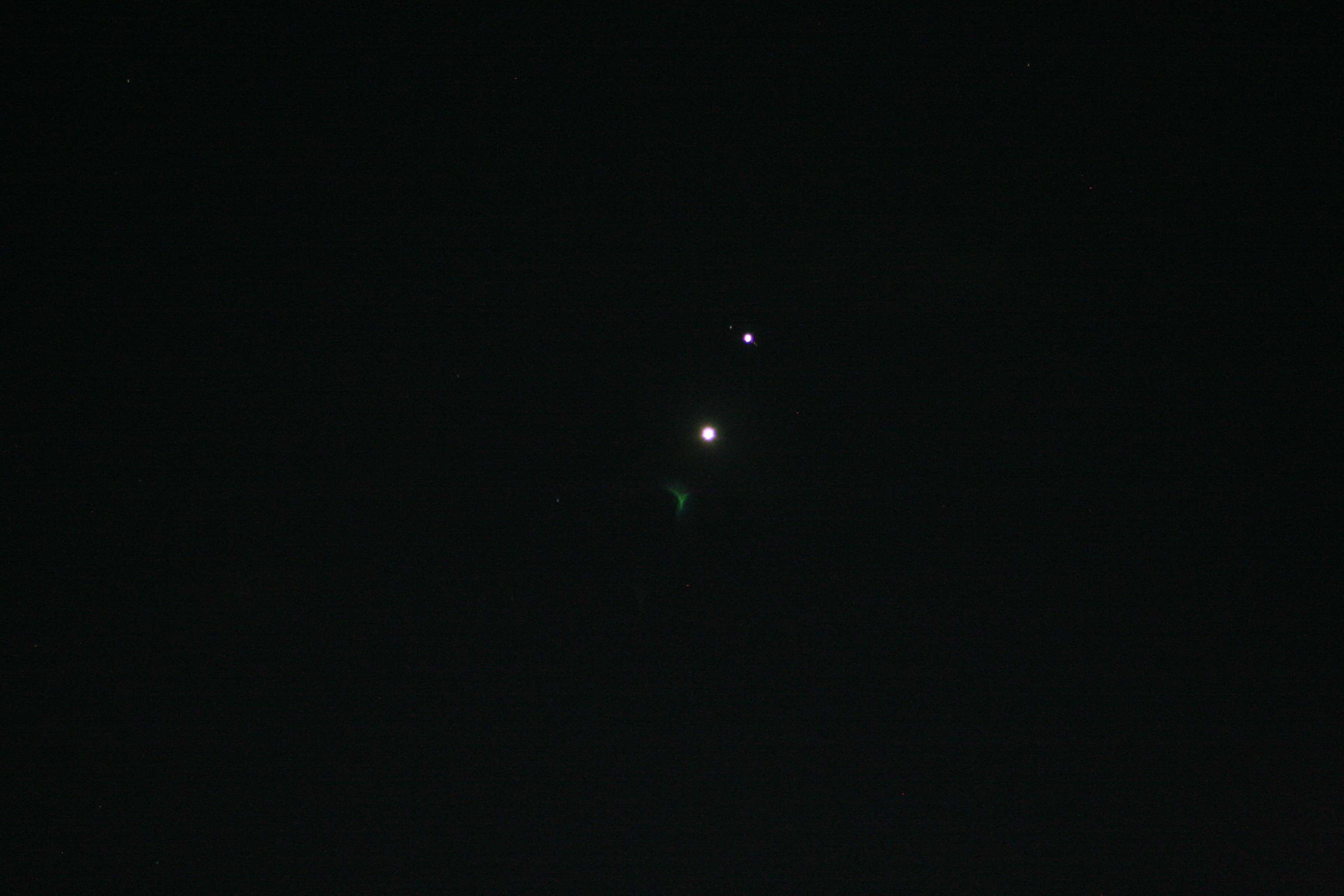 Fitting the camera to the small scope again proved problematic. Focus is part of the problem, exposure is another. While I played around with both and took a lot of photos at different exposures and different focus points, I never hit that sweet spot. This image was the closest I came. There is enough detail on Venus (lower left) to see a bit of the crescent, and if you blow the picture up to full size, you can see just a hint of the Galilean moons. Most noticeable is the color difference – Venus is bright white, while Jupiter shows some pastel color.