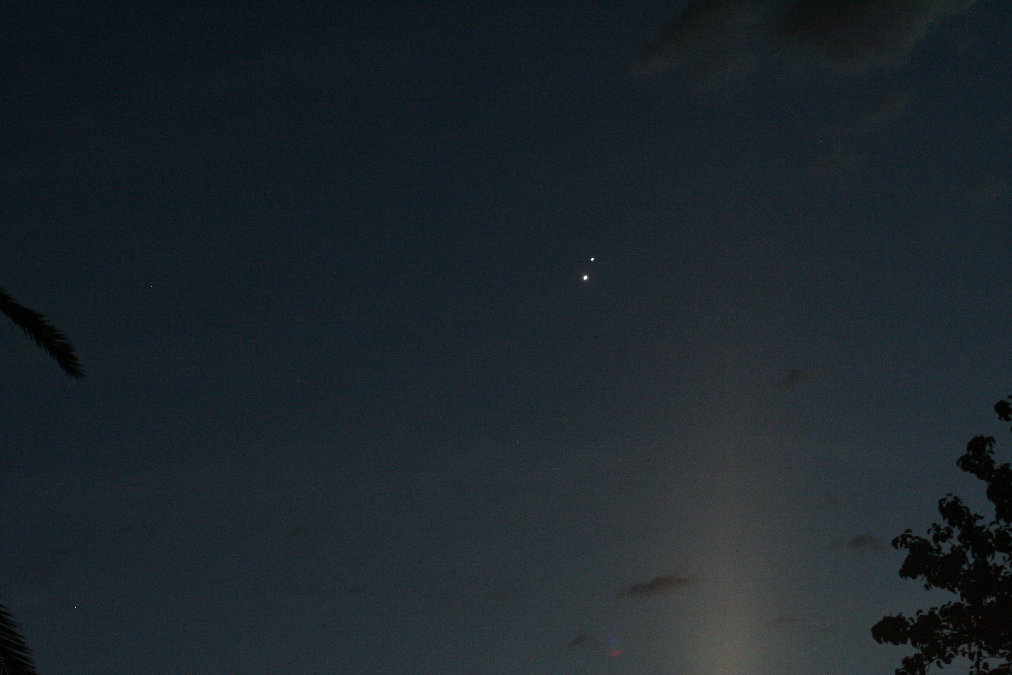 I pulled the small telescope out, the two planets fitting easily into the field of view. In the scope, the thin crescent shape of Venus was obvious, Jupiter showed as an oblate sphere with several bands visible, and the four Galilean moons were very clearly visible. It was spectacular.