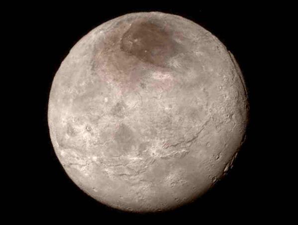 The dark spot at the north pole is probably liquid nitrogen that has escaped from Pluto’s atmosphere and been captured by Charon. The area has tentatively been named “Mordor.”