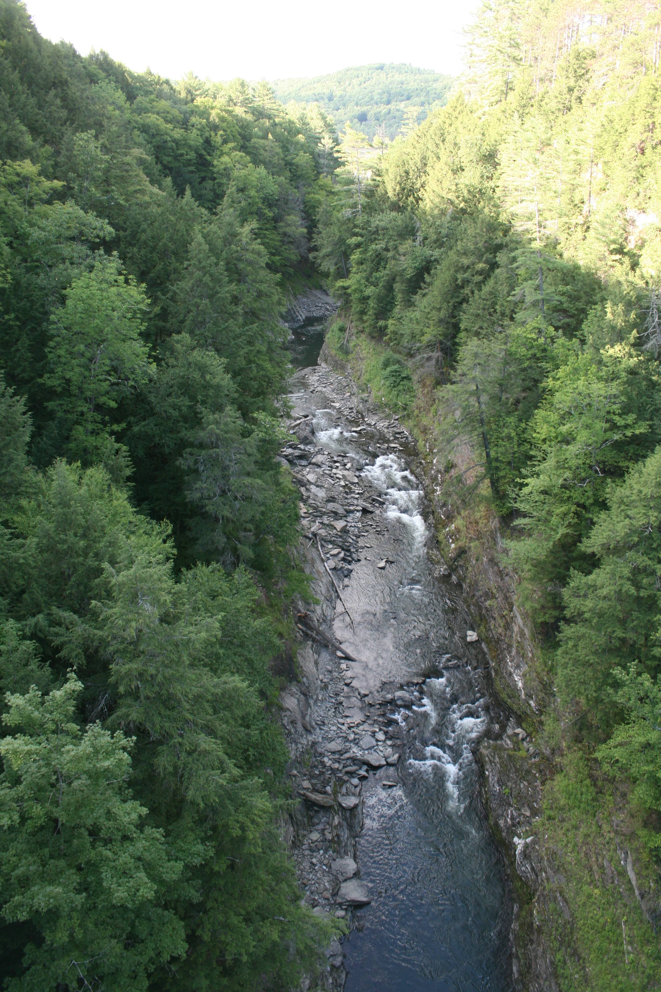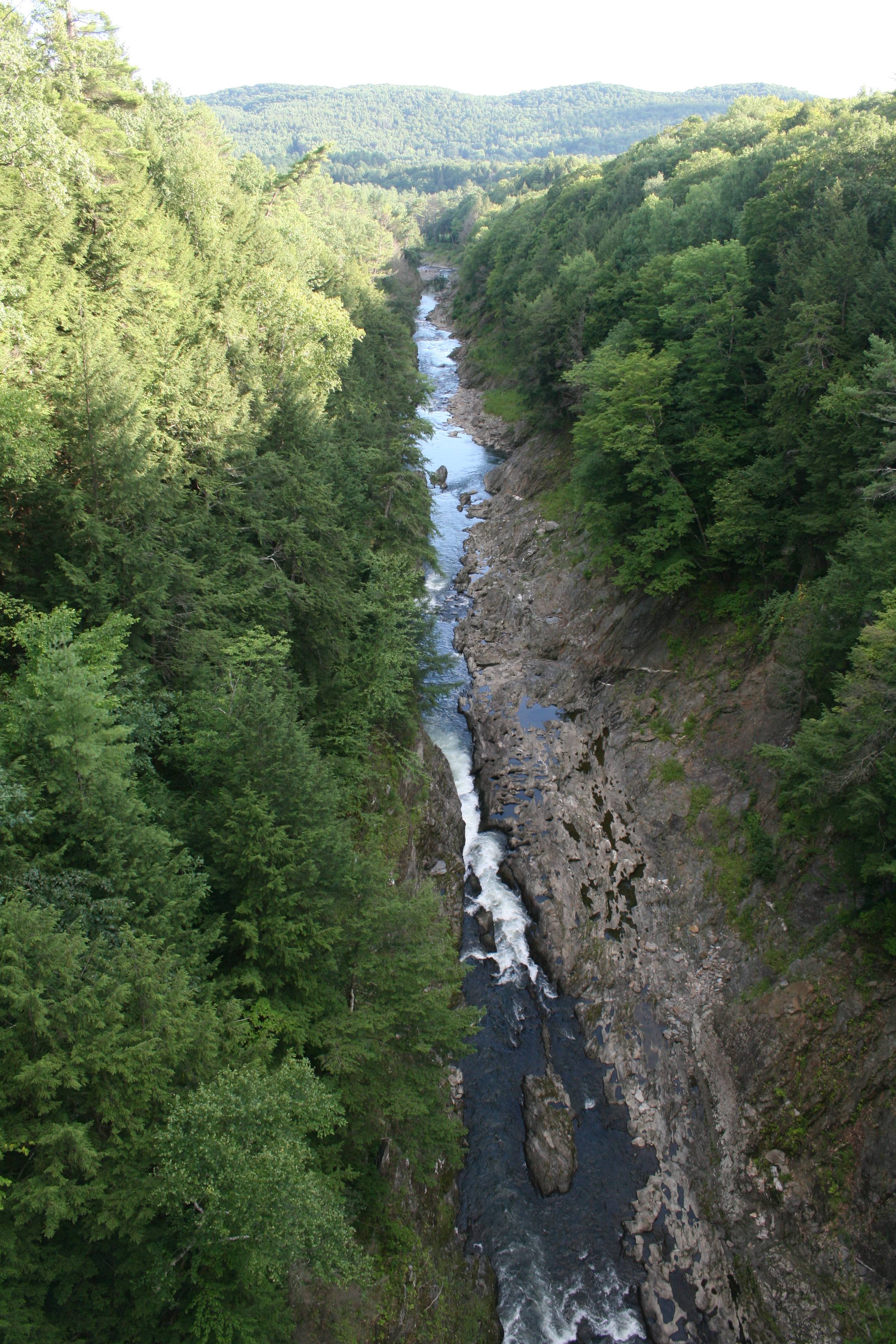 Quechee Gorge (pronounced “Kwee-chee”) is a wonderful place to visit in east-central Vermont. Located on the Ottauquechee River just west of White River Junction, Vermont, it’s easily accessible on US Route 4, just a few miles off of either I-89 or I-91. There are parking lots on either side with pedestrian walkways which allow you to look down several hundred feet into the Gorge. If you have the time, you can follow an easy hiking trail down into the Gorge. We’ll have to do that next time.
