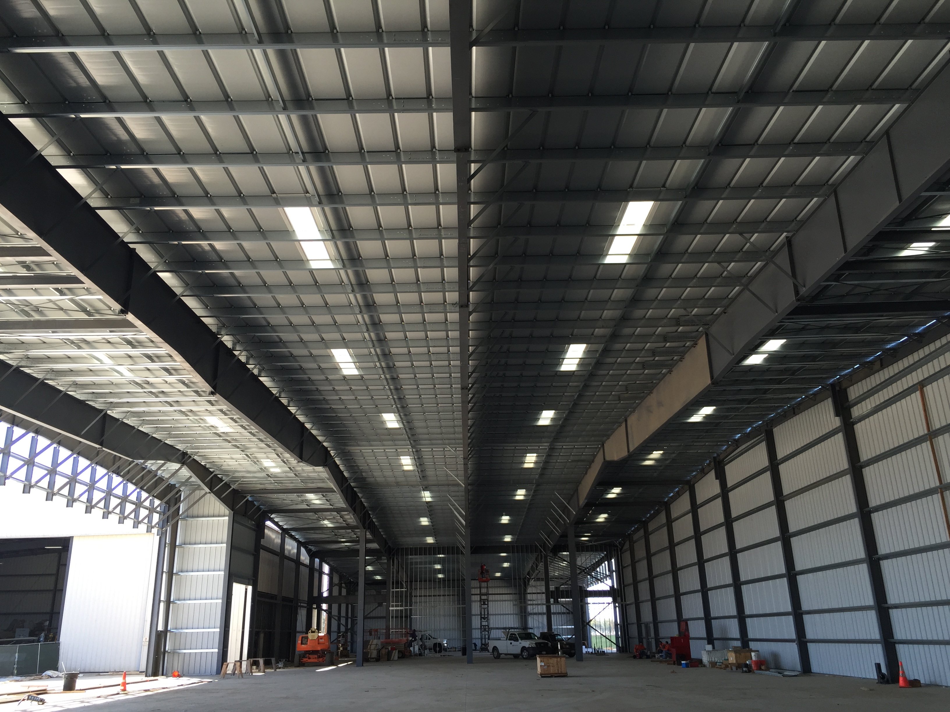 (Click to view full size image.) About 99% of the skin on the exterior walls are up now, the only parts remaining being above the hangar doors. That will be done after the doors are installed.