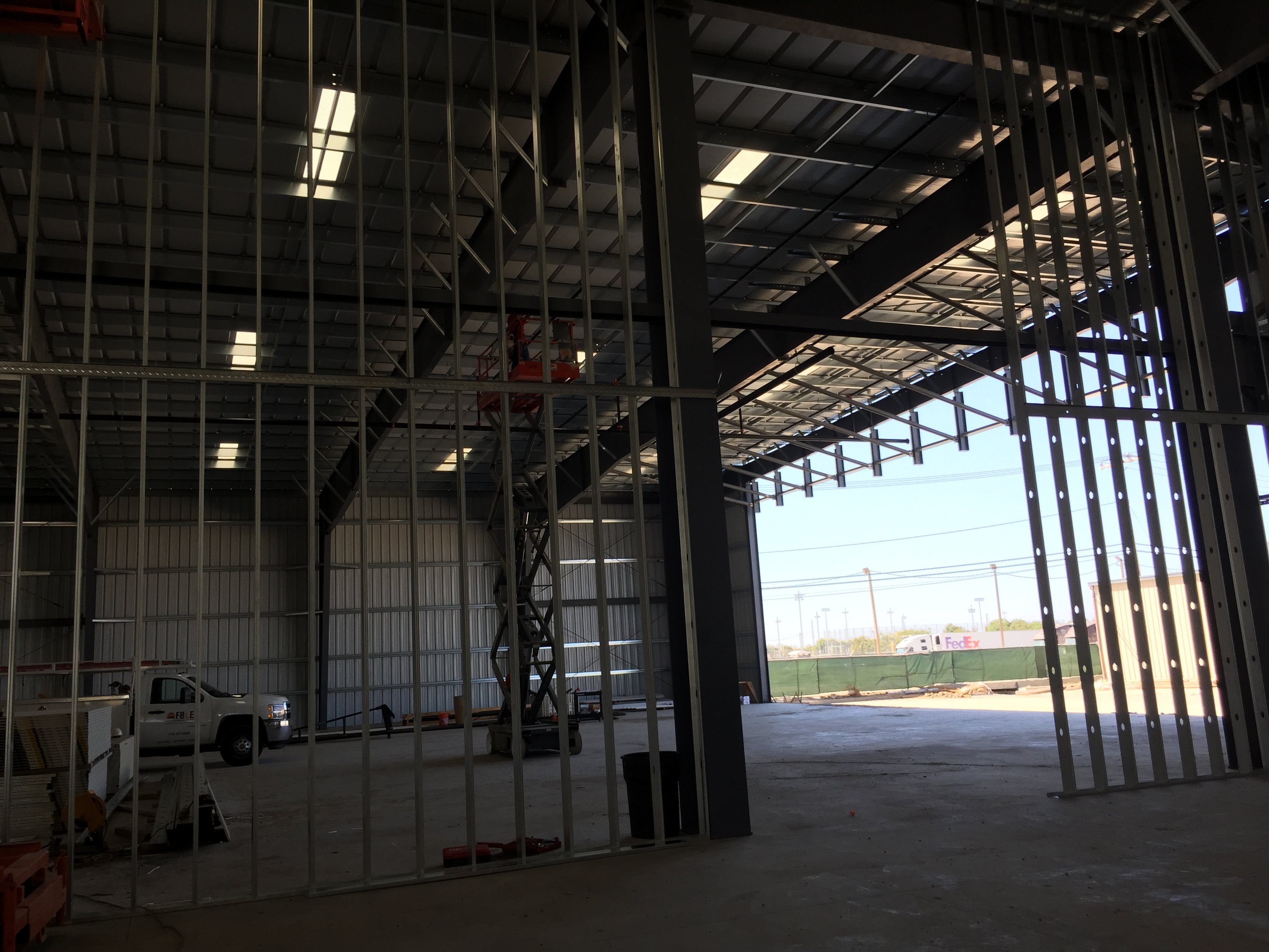 Down at the south end, the wall separating our section from the one being leased by the EAA was going up today.