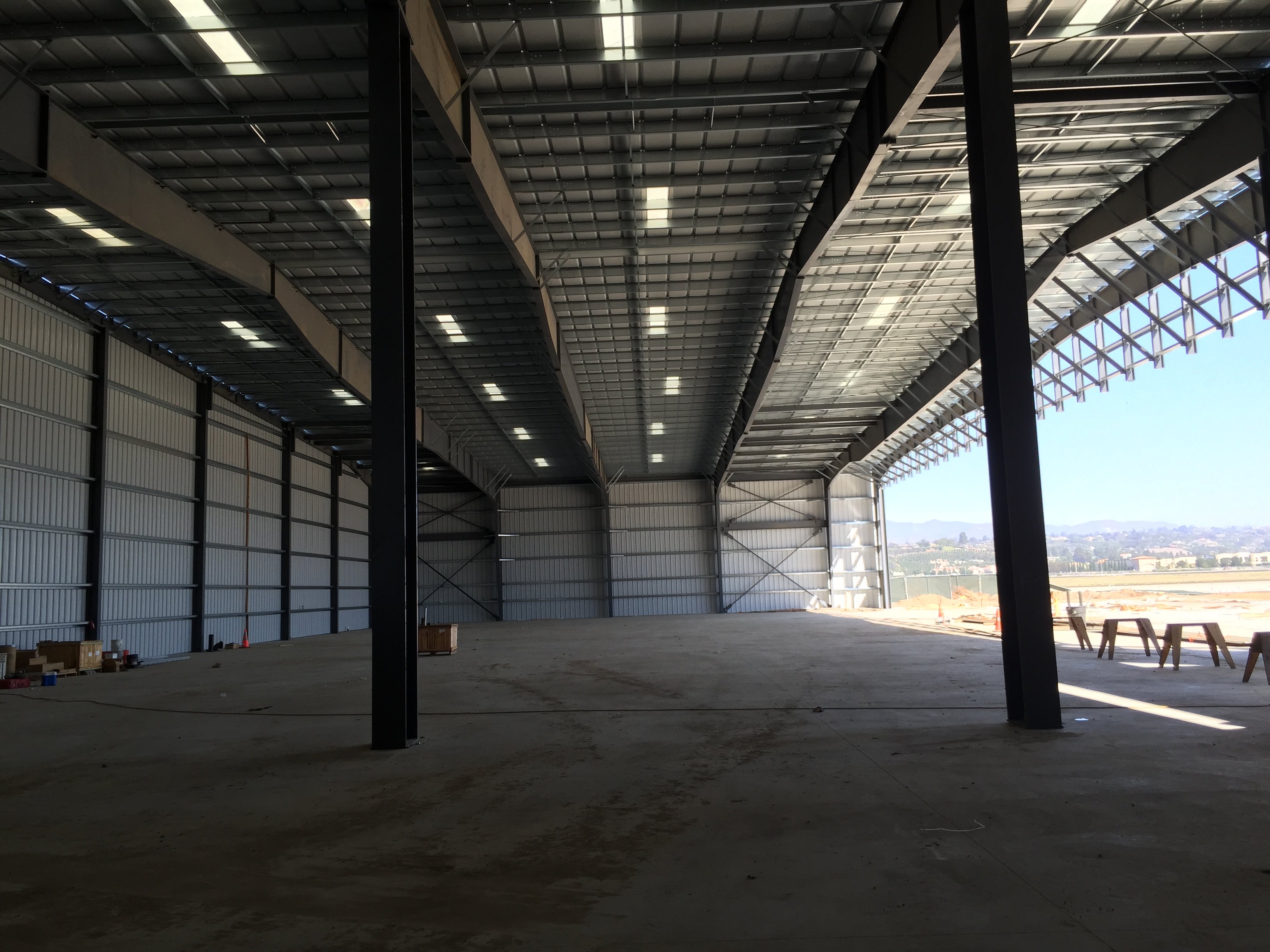 Six weeks ago we started raising the steel for our hangar expansion out at the CAF SoCal location in Camarillo. Four weeks ago the longitudinal beams were in place. Two weeks ago the roof was going on and the ramp concrete was ready to pour. Last week the exterior walls were being put up.