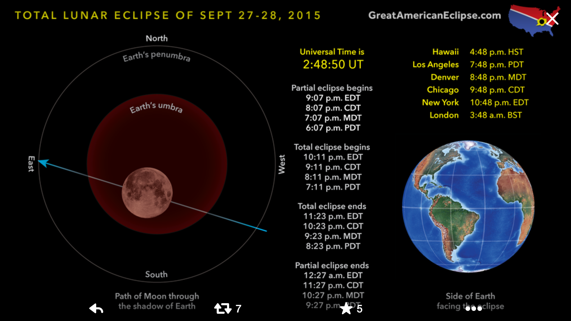 You’ve no doubt heard all about the “SUPERMOON!!!!” eclipse tomorrow night. It’s a normal lunar eclipse (like this one and this one and this one) but this particular eclipse happens to occur when the moon’s at a point in its orbit when it’s almost at its closest point to Earth. That makes it appear about 5% bigger and brighter, which 99% of us wouldn’t notice if it weren’t for all of the hysterical news reports and headlines.