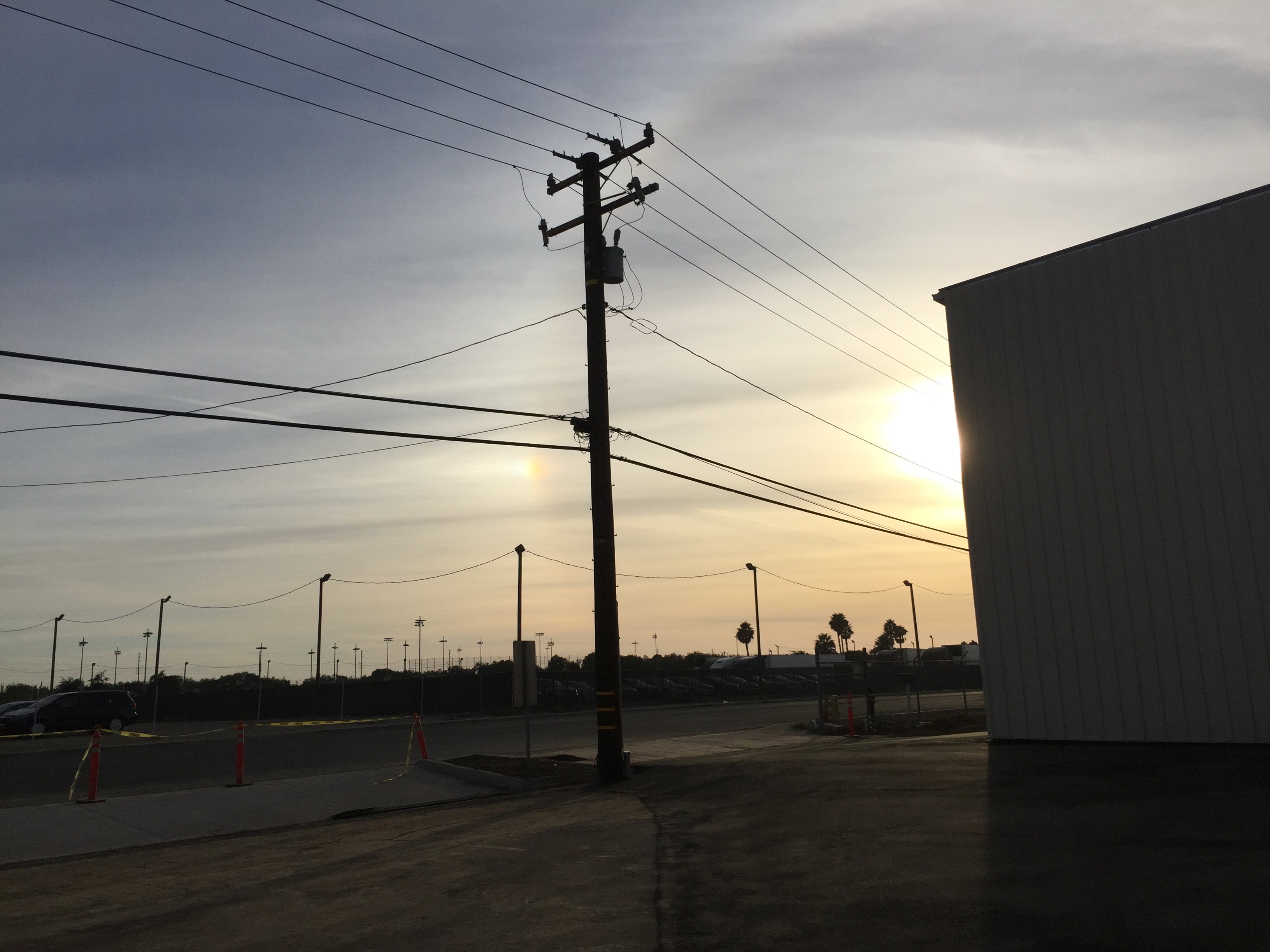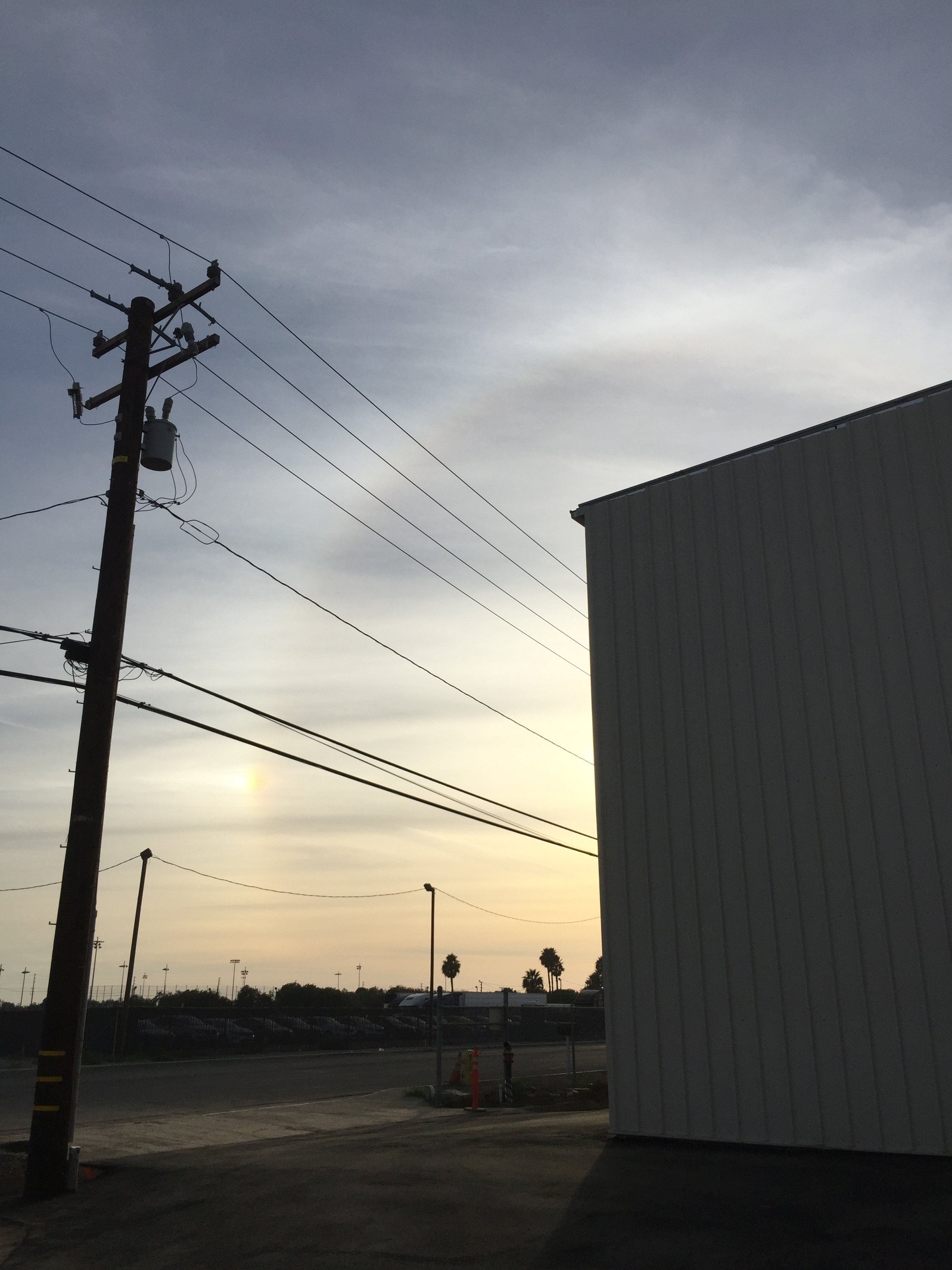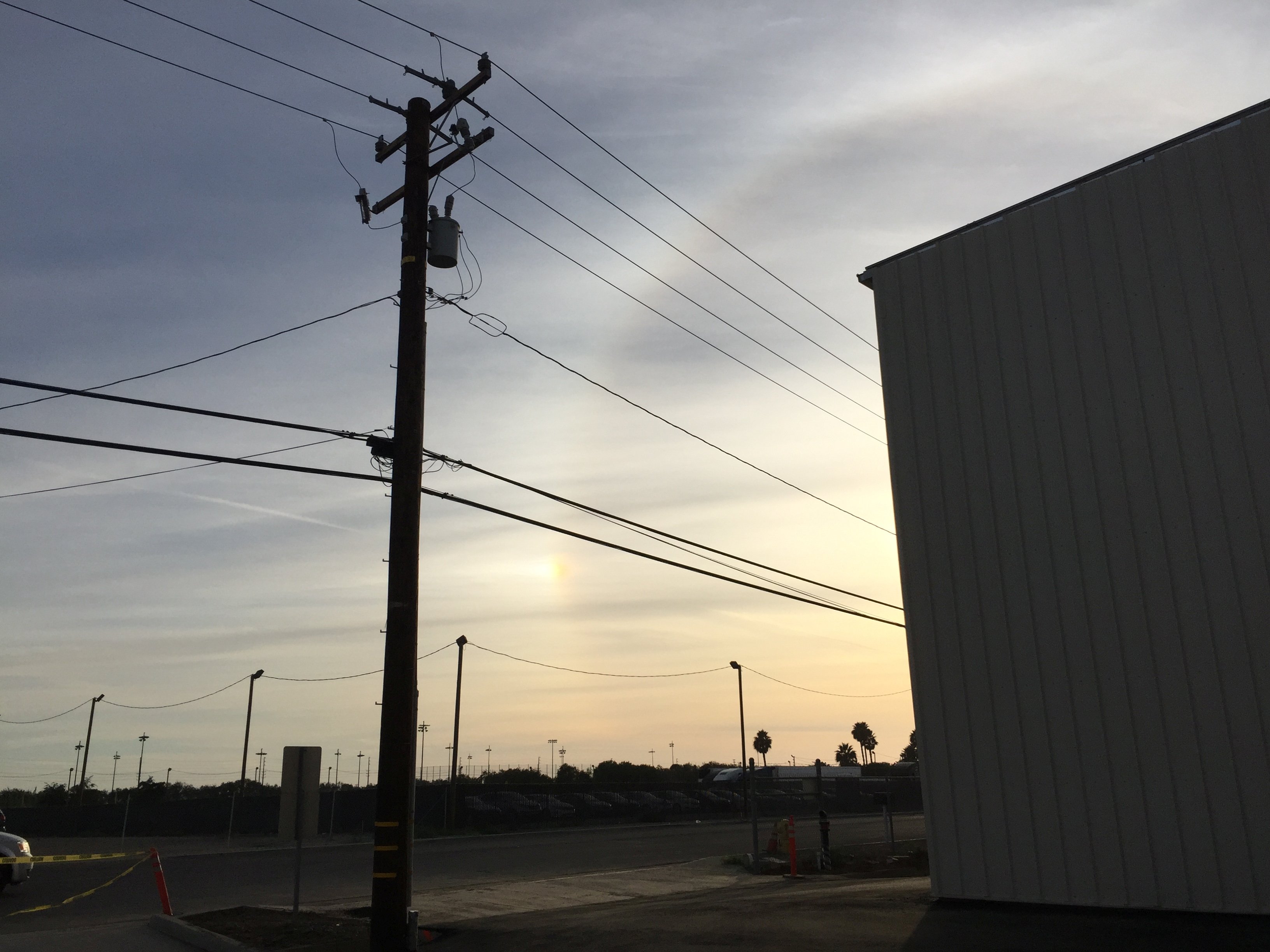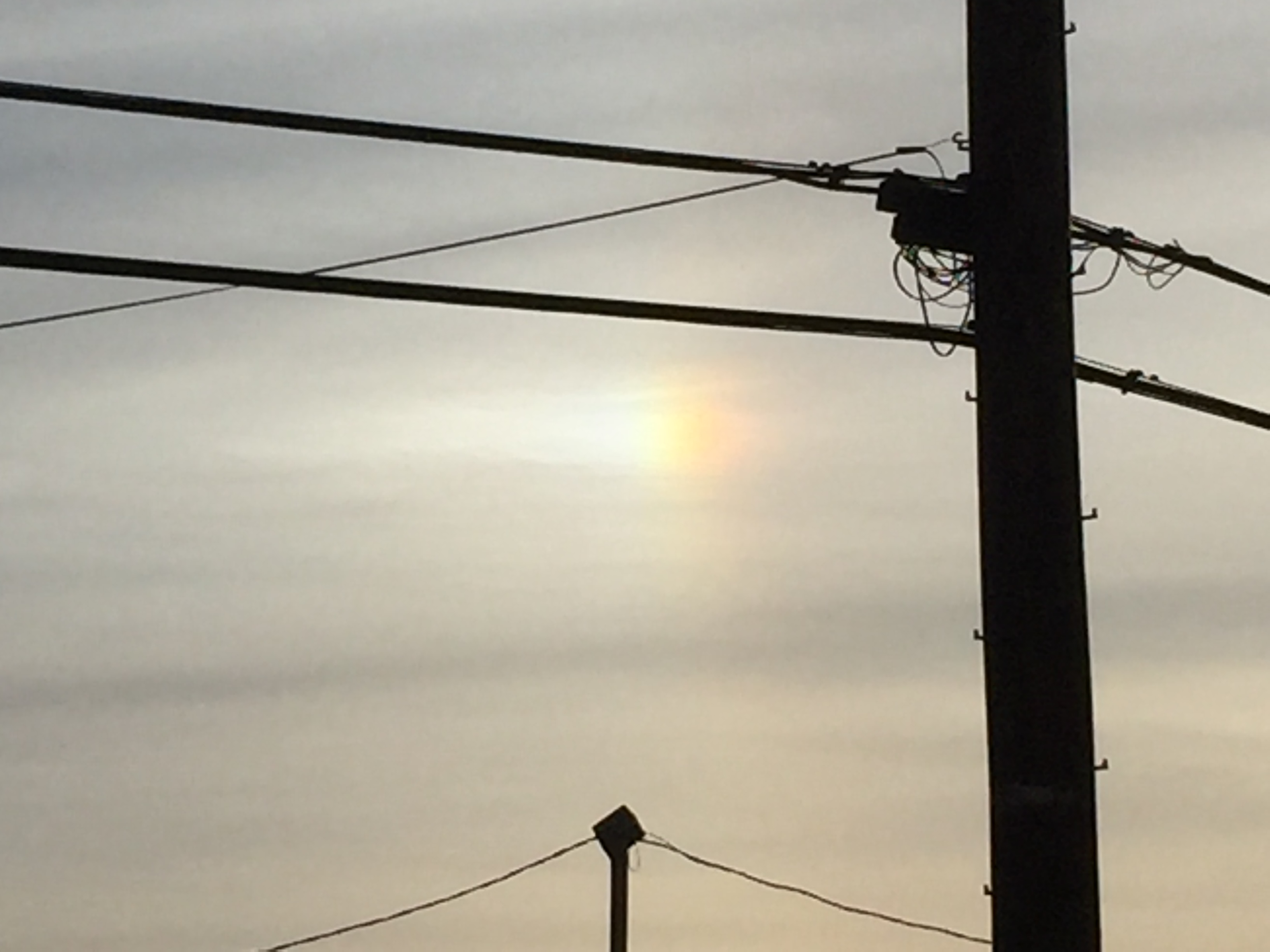 While leaving the CAF hangar yesterday I noticed a “sun dog” near the setting sun as it shone through a layer of high clouds that had moved in. I was in bright sunlight but could still see the little rainbow-colored patch, so I moved into the shadow of one of the new hangars to take a photo.