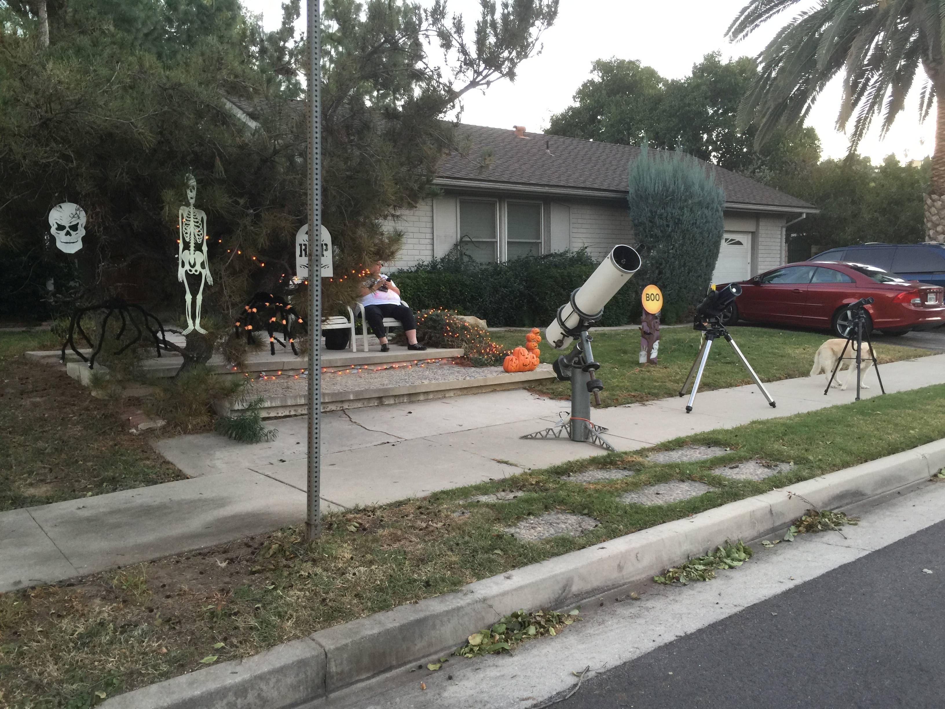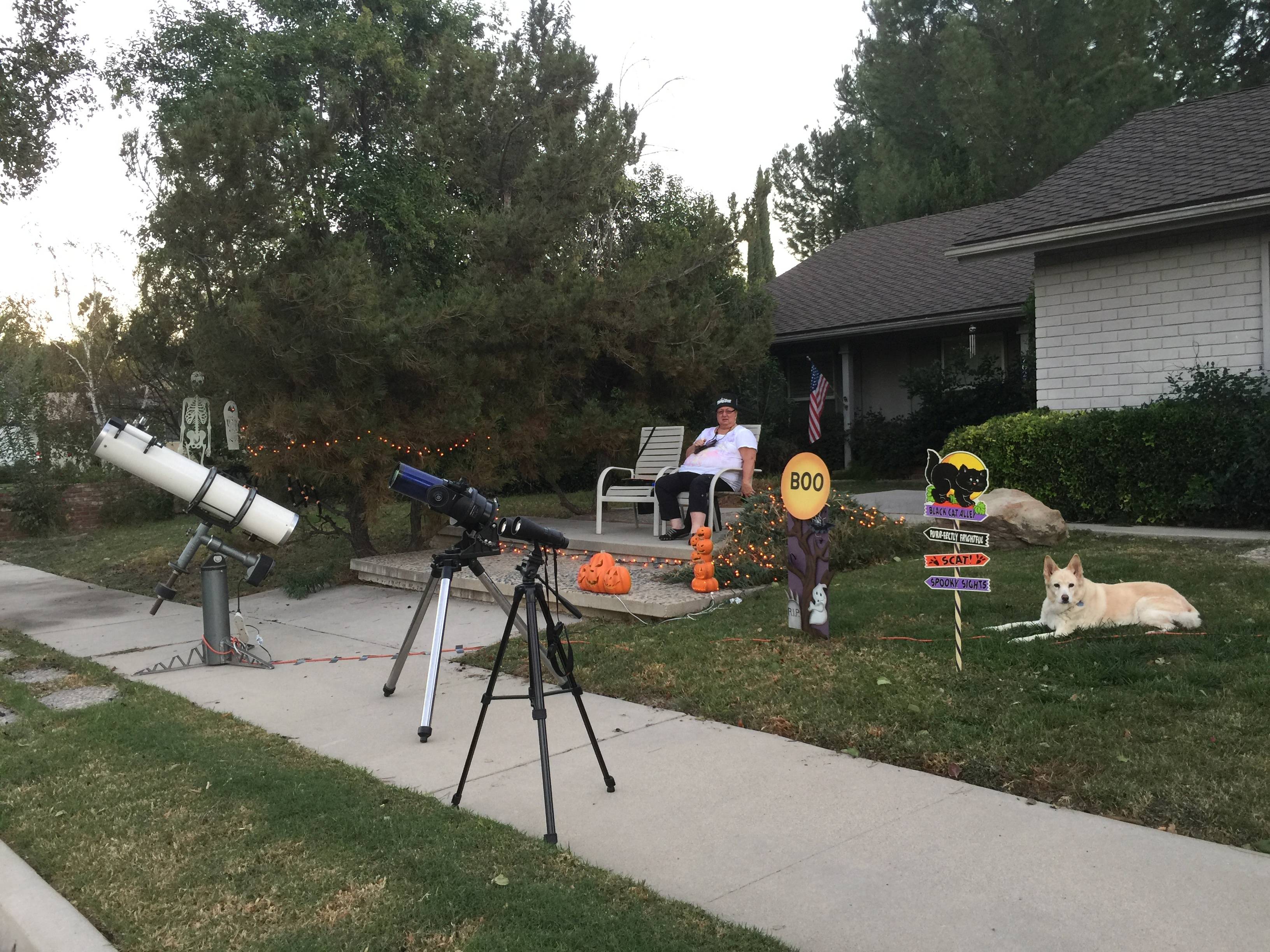 All set up, waiting for the first trick or treaters, and some darkness. Note the attack beast in her guard dog position – she ended up inside for most of the night, howling in protest. The kids started showing up before it got dark enough to see anything. Those first few were disappointed with not being able to look through the telescopes, but many swung back around later and got to take a look.