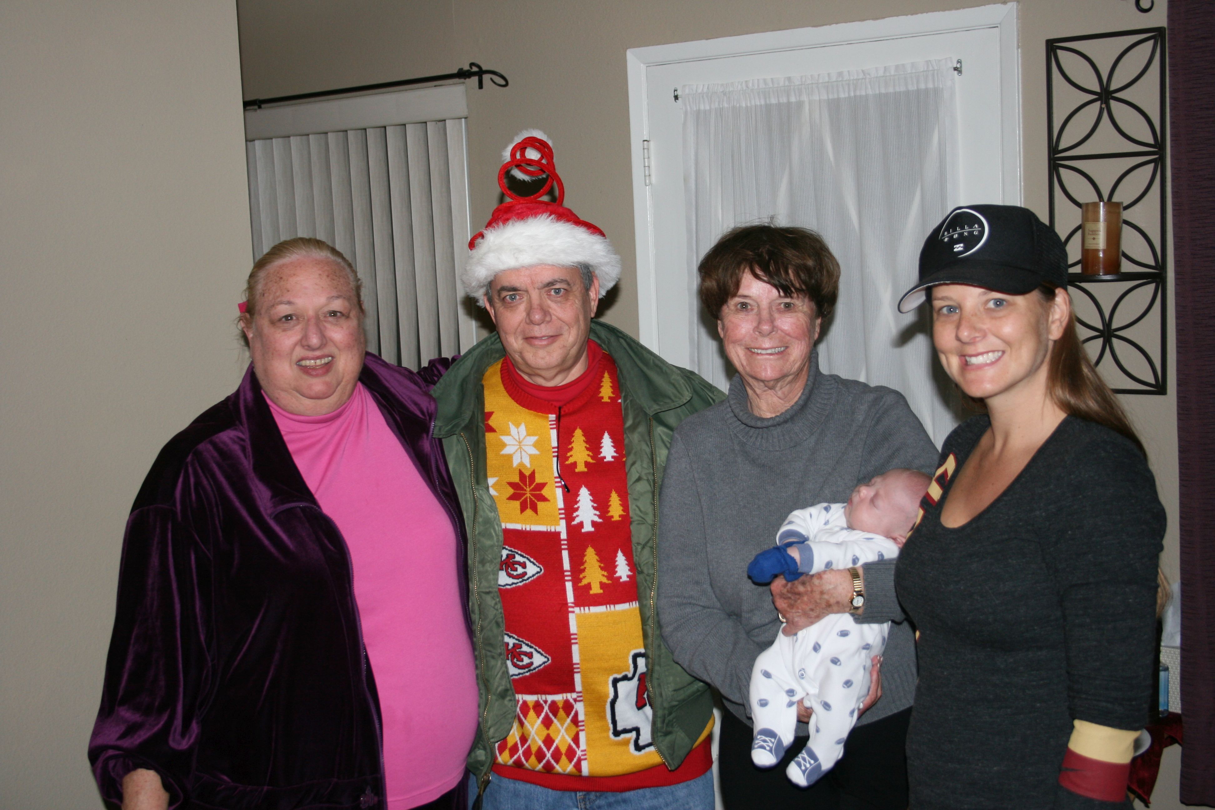 Mom with us, her youngest great-grandson, and my niece just after Christmas last year.