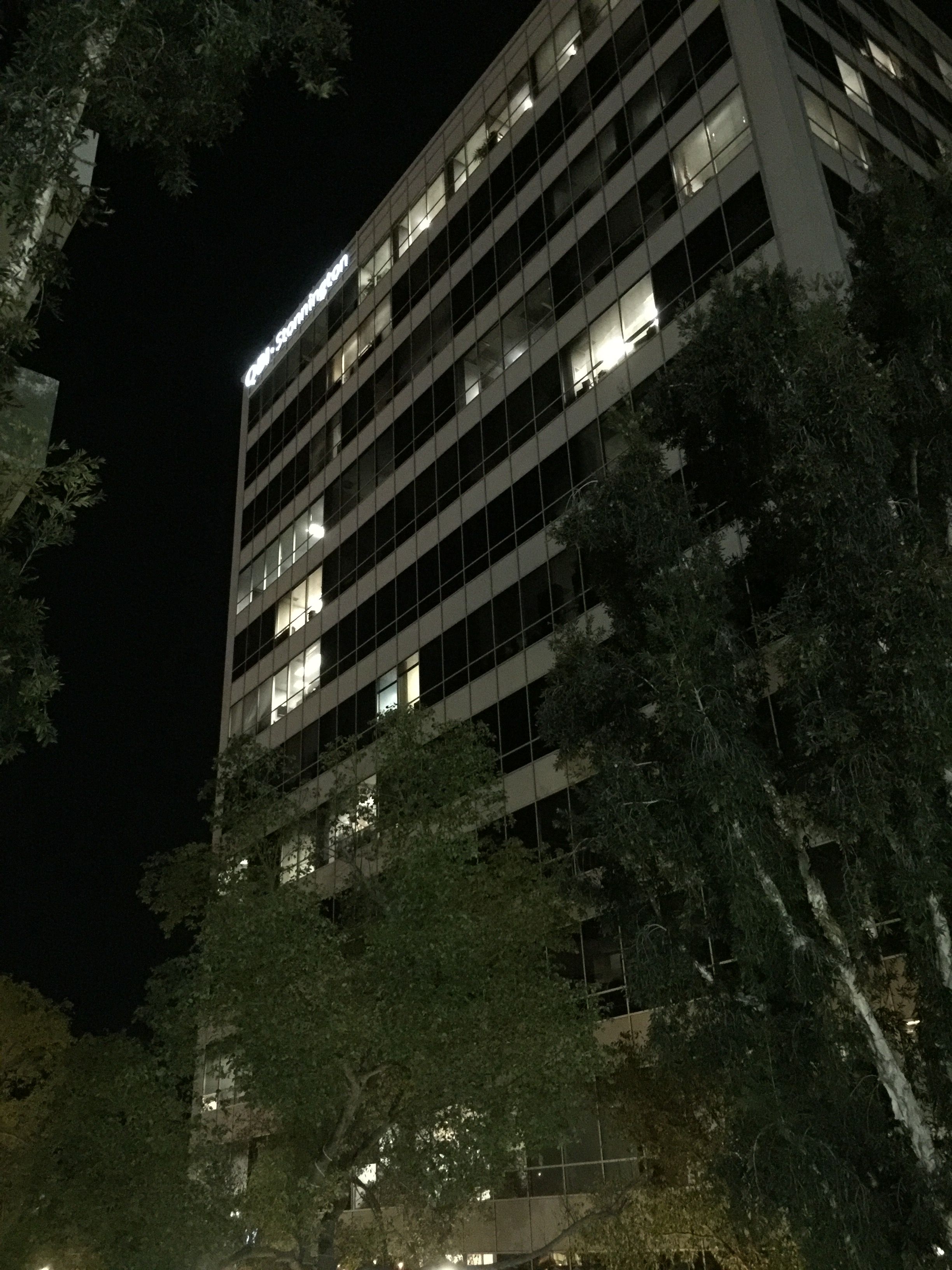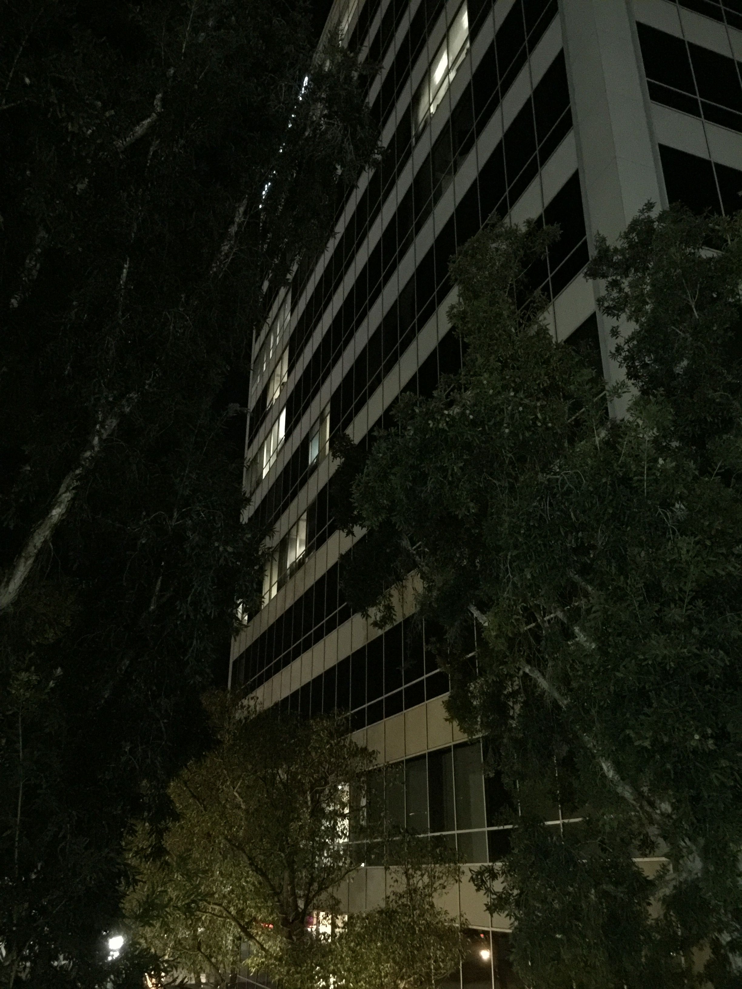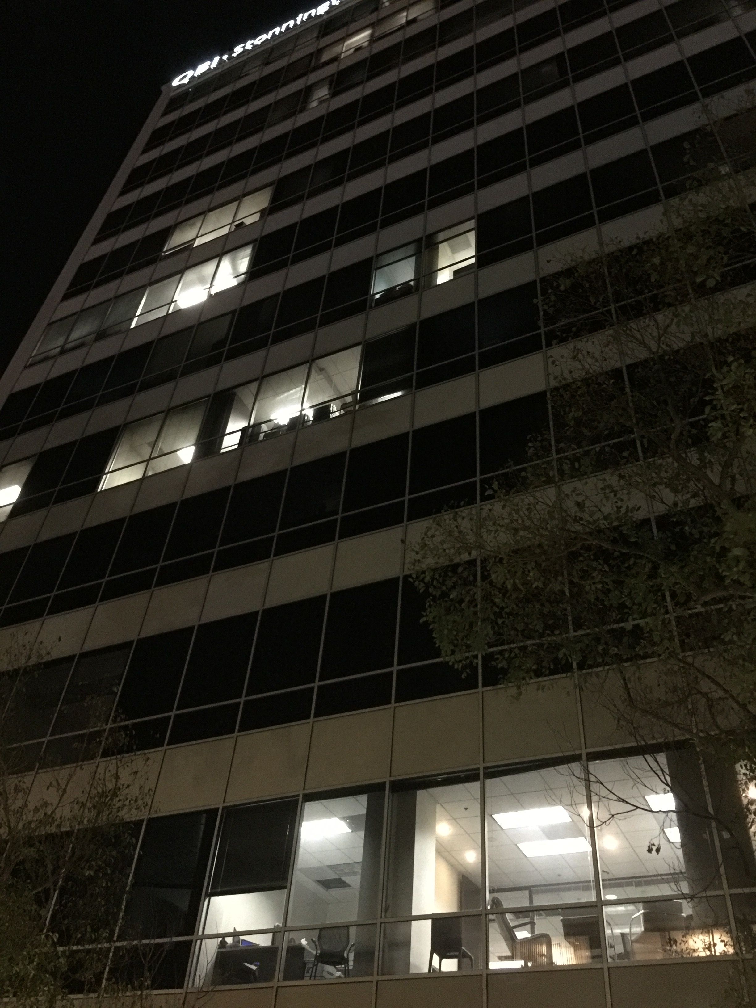 Offered not as a snarky comment on how late I’ve been leaving the office (it really, really is a good job and I’m not complaining and things are going very well, but, yeah, it’s a bit hectic and I’m out a little bit late), but rather as an observation about how nice a big, modern office building can look at night, with just a few odd office lights still on. (One of them mine…)