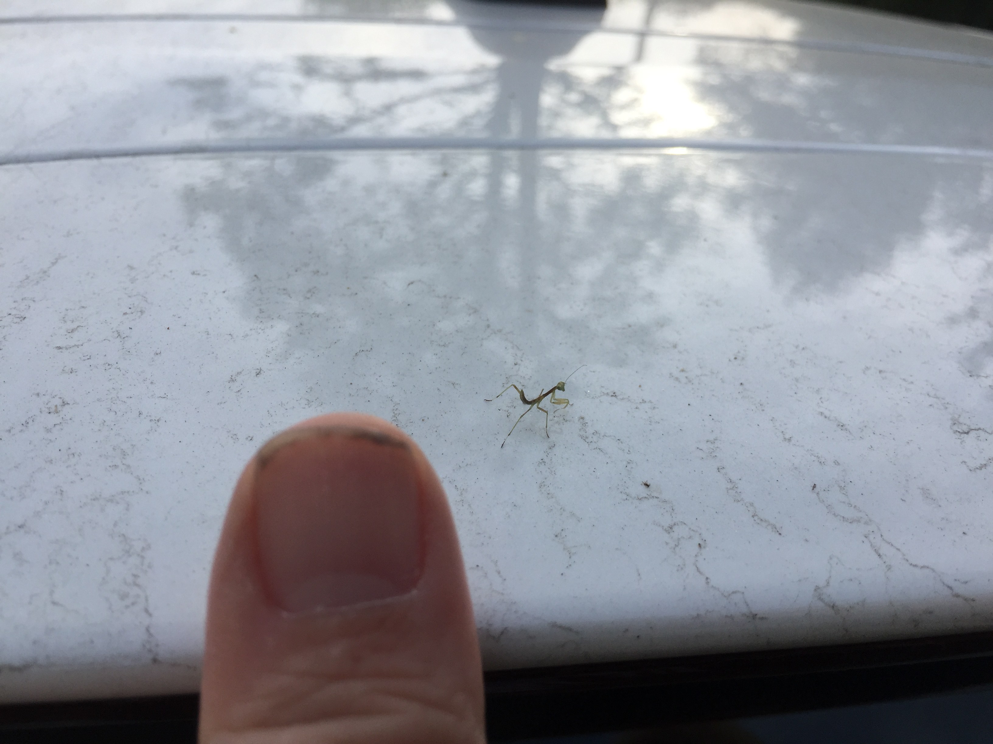 The other reason for having my thumb there is to give the iPhone something close to focus on. Otherwise I get really cool photos of the tree’s silhouette reflected in the roof of the car, with a little green blob that is a micro mantis only because I tell you it is.