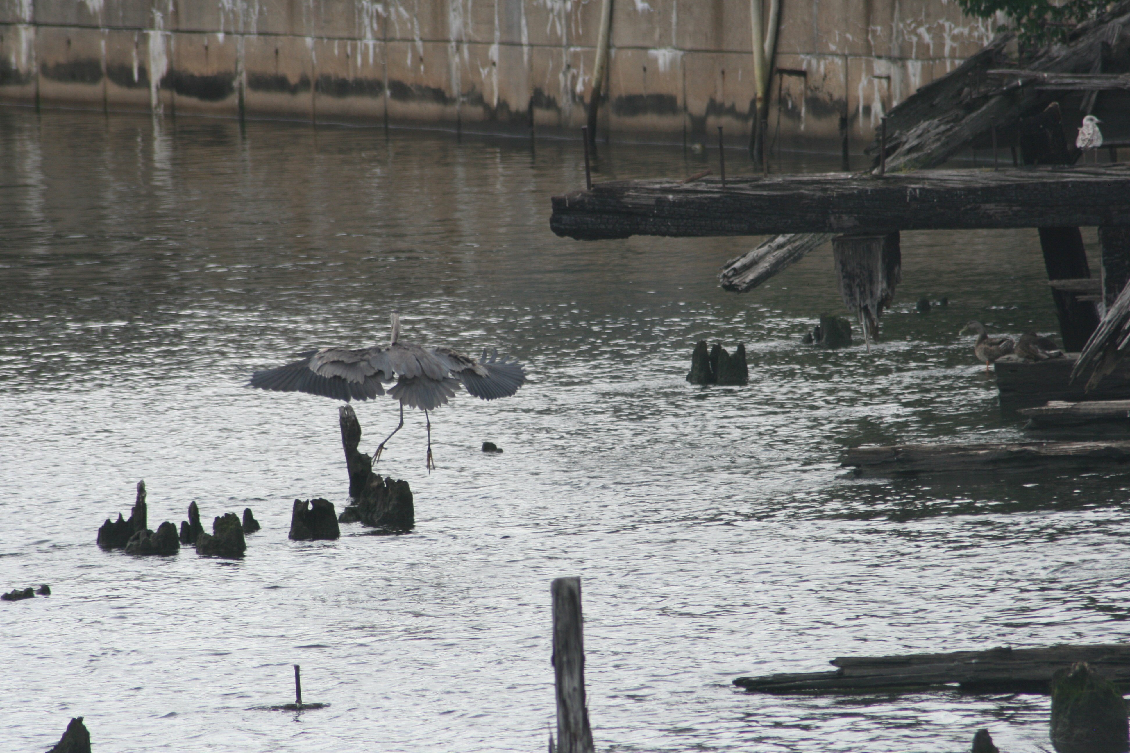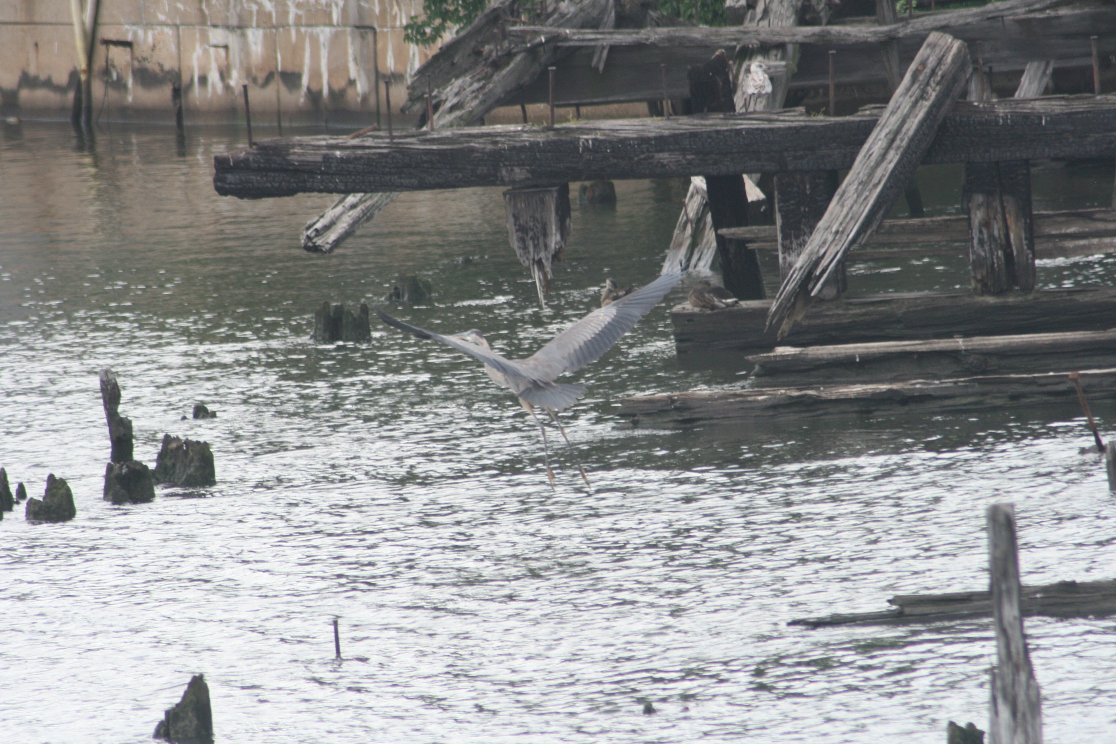 This large blue heron was cruising along and made a perfect landing on that old, rotted pier piling.