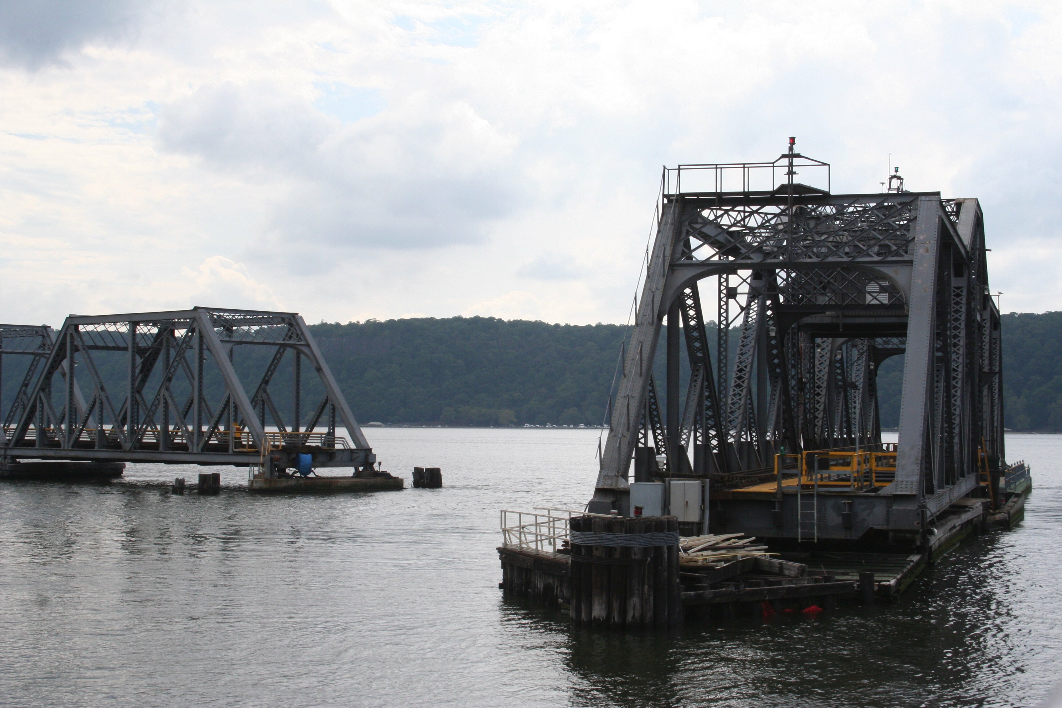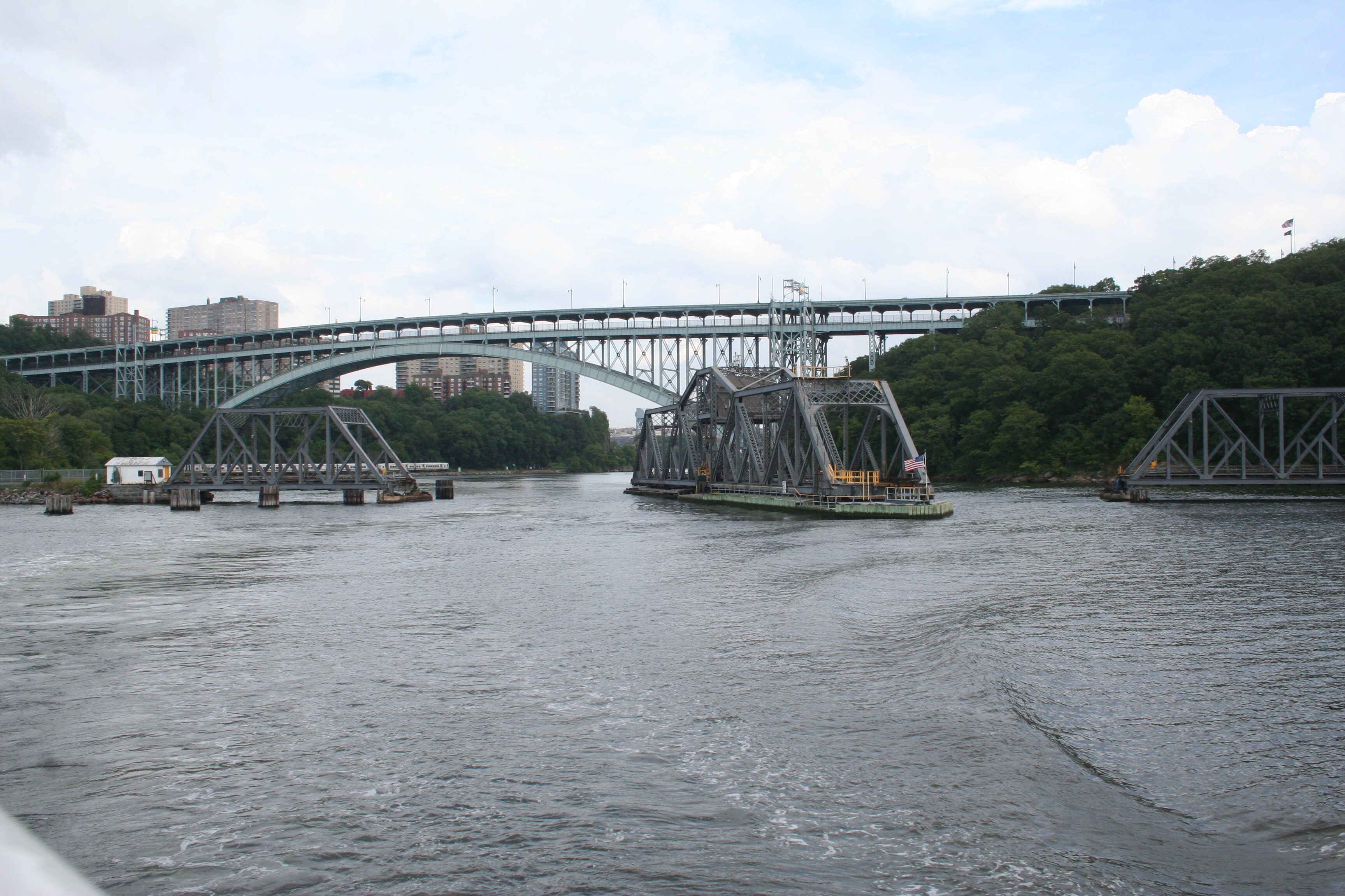 Heading out onto the Hudson River to finish our circumnavigation of Manhattan, we see the Amtrak bridge closing, with the Henry Hudson Bridge high above it.